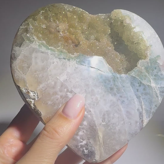 Die Besonderheit dieses Herzens liegt in der extrem seltenen Doppelkristallisation, die das Licht in atemberaubender Weise bricht und das grüne Farbspiel intensiviert 🌈💖 Rainbow Amethyst ist für seine heilenden und harmonisierenden Eigenschaften bekannt. Er stärkt Intuition, öffnet Herz und Geist und bringt emotionale Balance in dein Leben 🧘💜