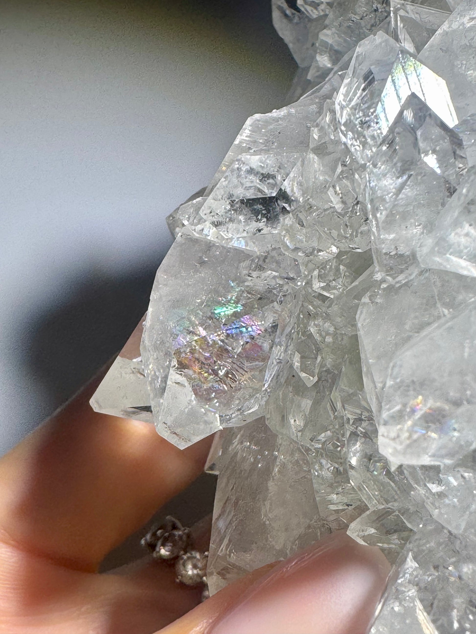 Dieses aussergewöhnliche Diamond Apophyllit ist ein absolut perfektes Stück in echter Museumsqualität. Die Spitzen sind vollständig ausgebildet, von makelloser Klarheit und in perfekter Form – nichts ist abgebrochen, jede Facette zeigt sich präzise und harmonisch gewachsen. Viele der Kristallspitzen tragen im Inneren natürliche Regenbogen, die im Licht lebendig aufleuchten und dem Stück eine faszinierende Tiefe verleihen 🌈
