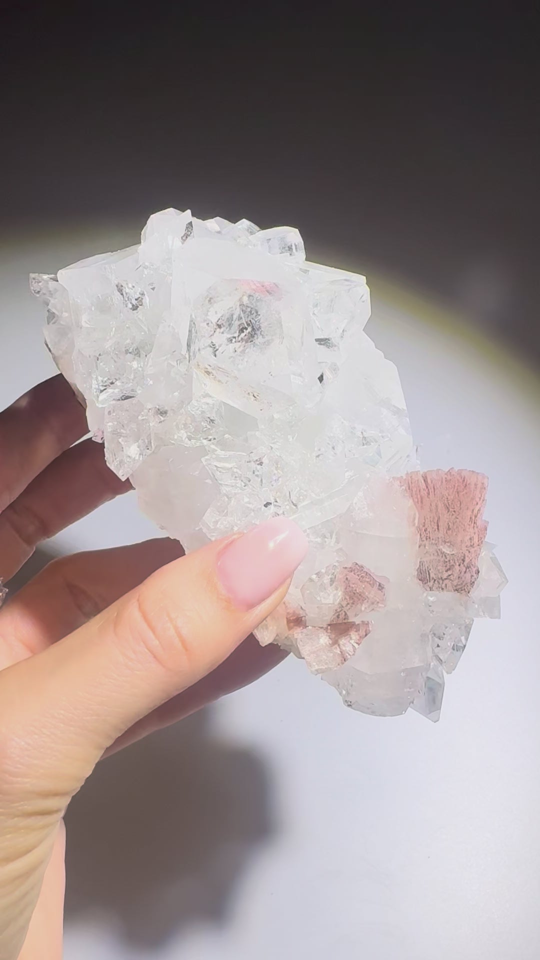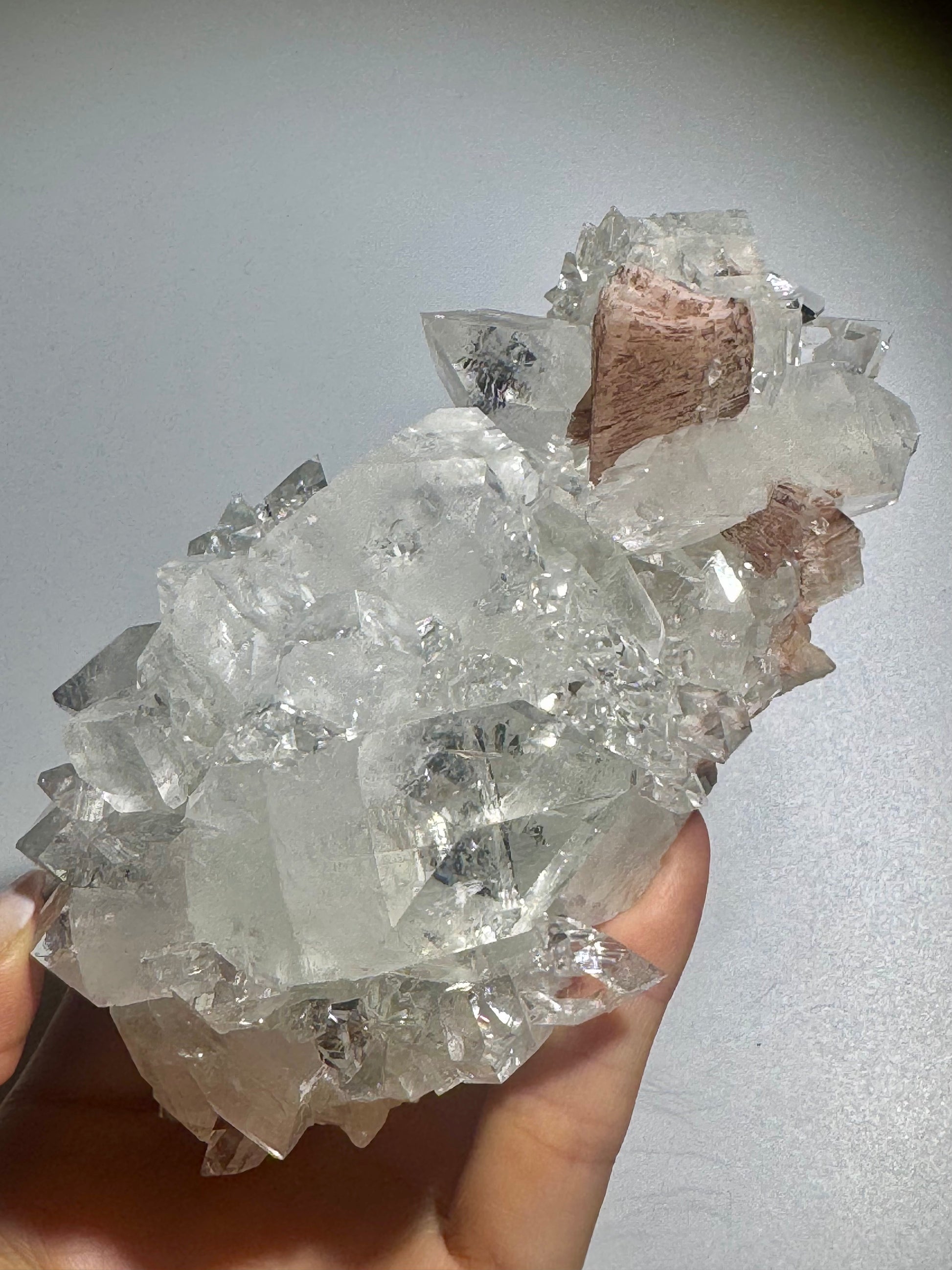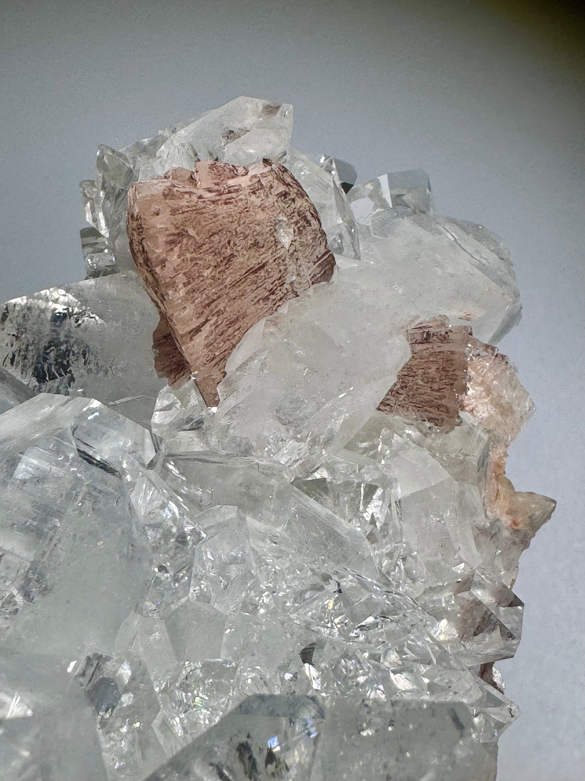 Besonders eindrucksvoll ist der fächerartige, altrosa Stilbit, der sich sanft zwischen den klaren Apophyllit-Spitzen entfaltet. Diese seltene Kombination aus diamantähnlicher Transparenz und zarter, warmer Farbnuance macht dieses Exemplar zu einem absoluten Traumstück. Die klare Geometrie des Apophyllits trifft auf die weiche, organische Struktur des Stilbits – ein Zusammenspiel von Präzision und Anmut.
