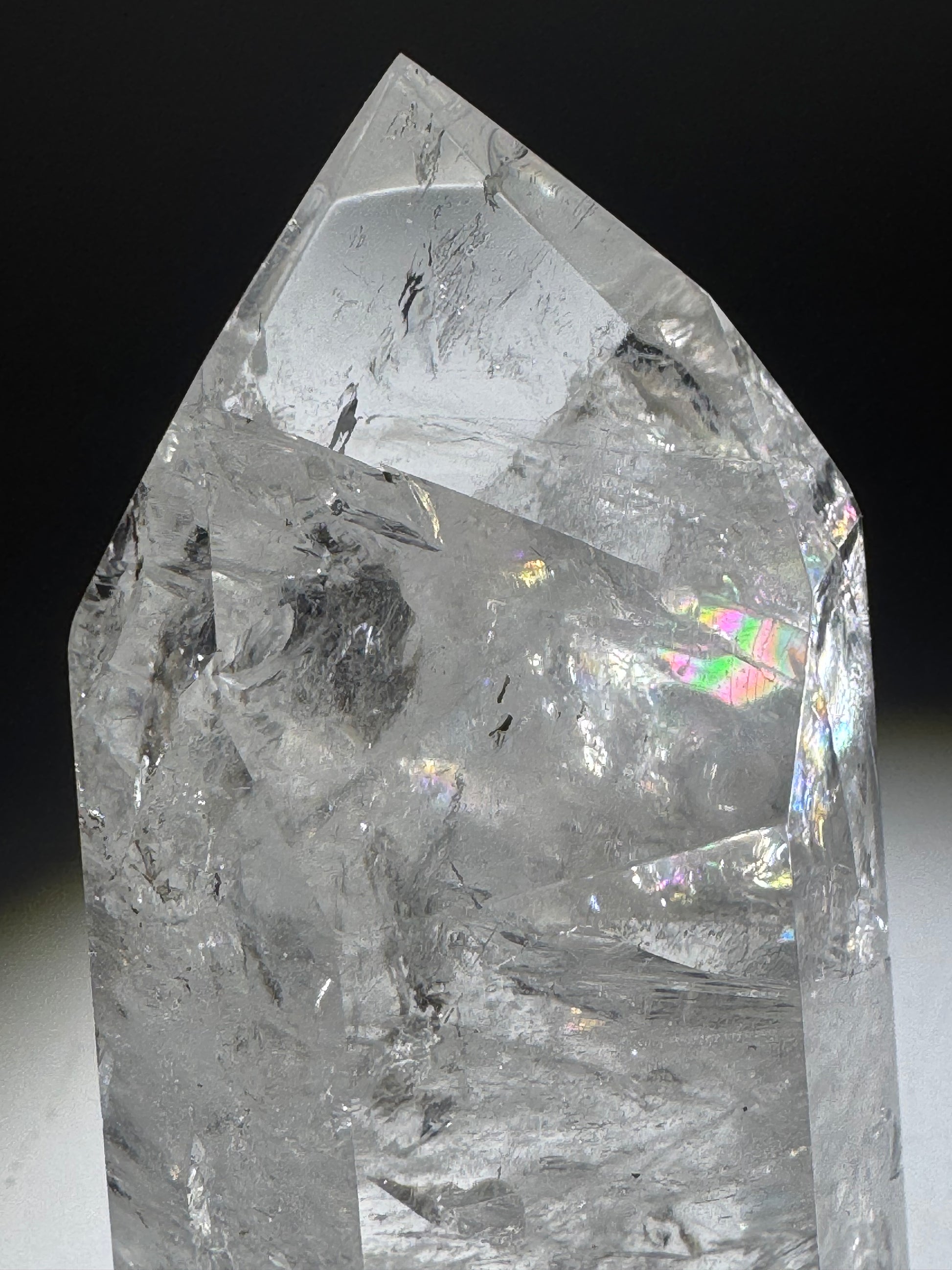 Dieser Bergkristall ist ein absolut bezauberndes Naturjuwel. Die gesamte Spitze ist durchzogen von wunderschönen Einschlüssen, die das Licht in unzähligen Regenbogenfarben brechen. Jeder Einschluss erzählt seine eigene geologische Geschichte und verleiht dem Kristall einen lebendigen, funkelnden Charakter. Ein echtes Sammlerstück, das durch seine natürlichen Farben und das Lichtspiel besticht.