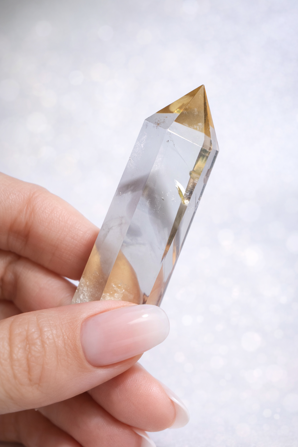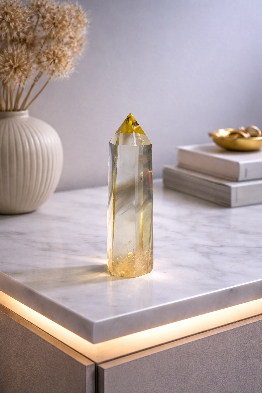 Süsse, kleine Citrinspitze mit faszinierendem Innenleben – dieses zarte Stück ist ein wahres Meisterwerk der Natur! ✨ Ihre warme, goldene Farbe schimmert sanft und zieht den Blick in das geheimnisvolle, kristalline Innenleben. Jeder Blick auf diese Citrinspitze offenbart neue Facetten und tiefgründige Schönheit. 💛 Perfekt für jeden Raum, um Licht und positive Energie zu verbreiten!