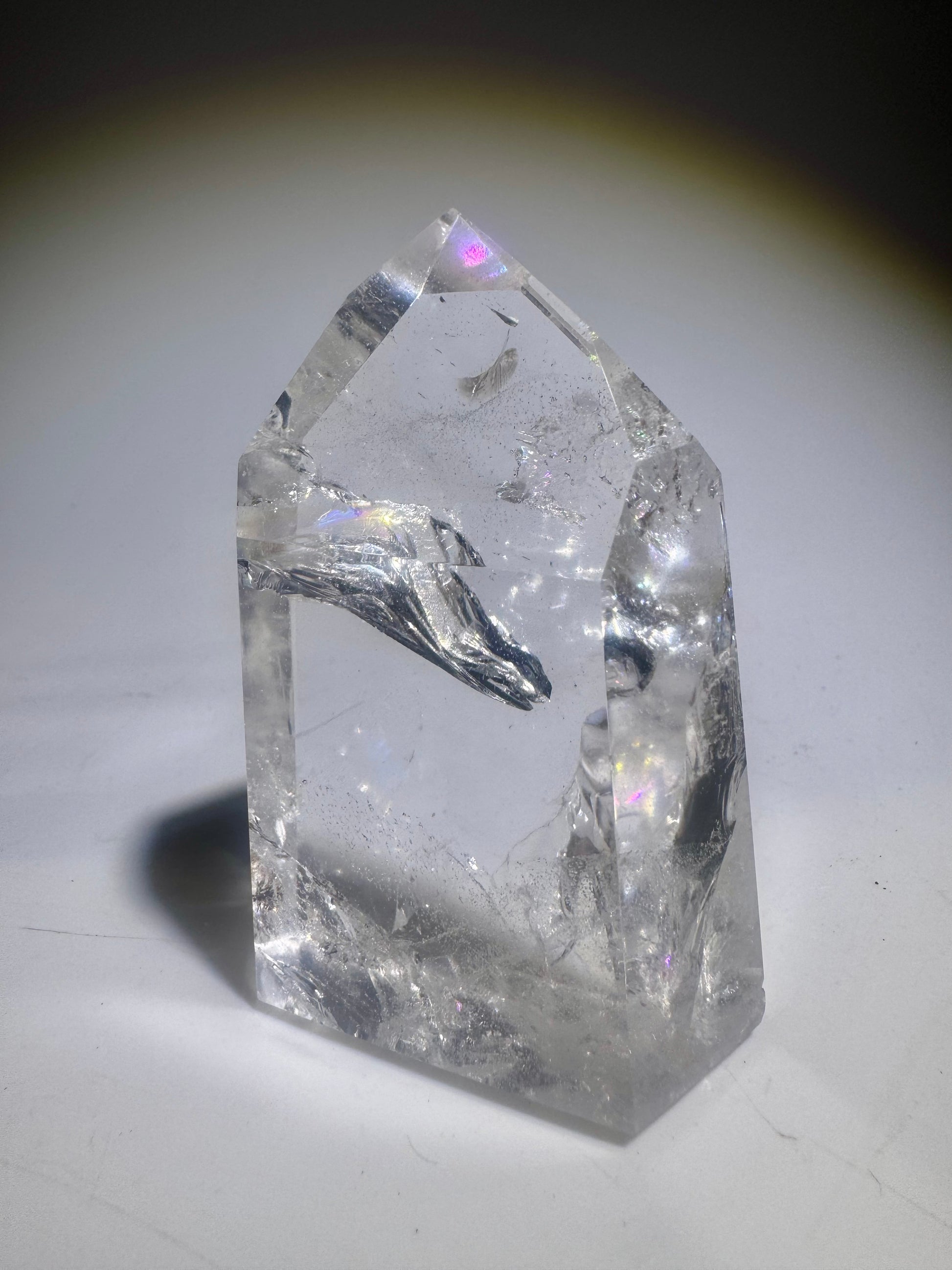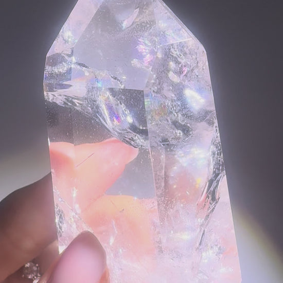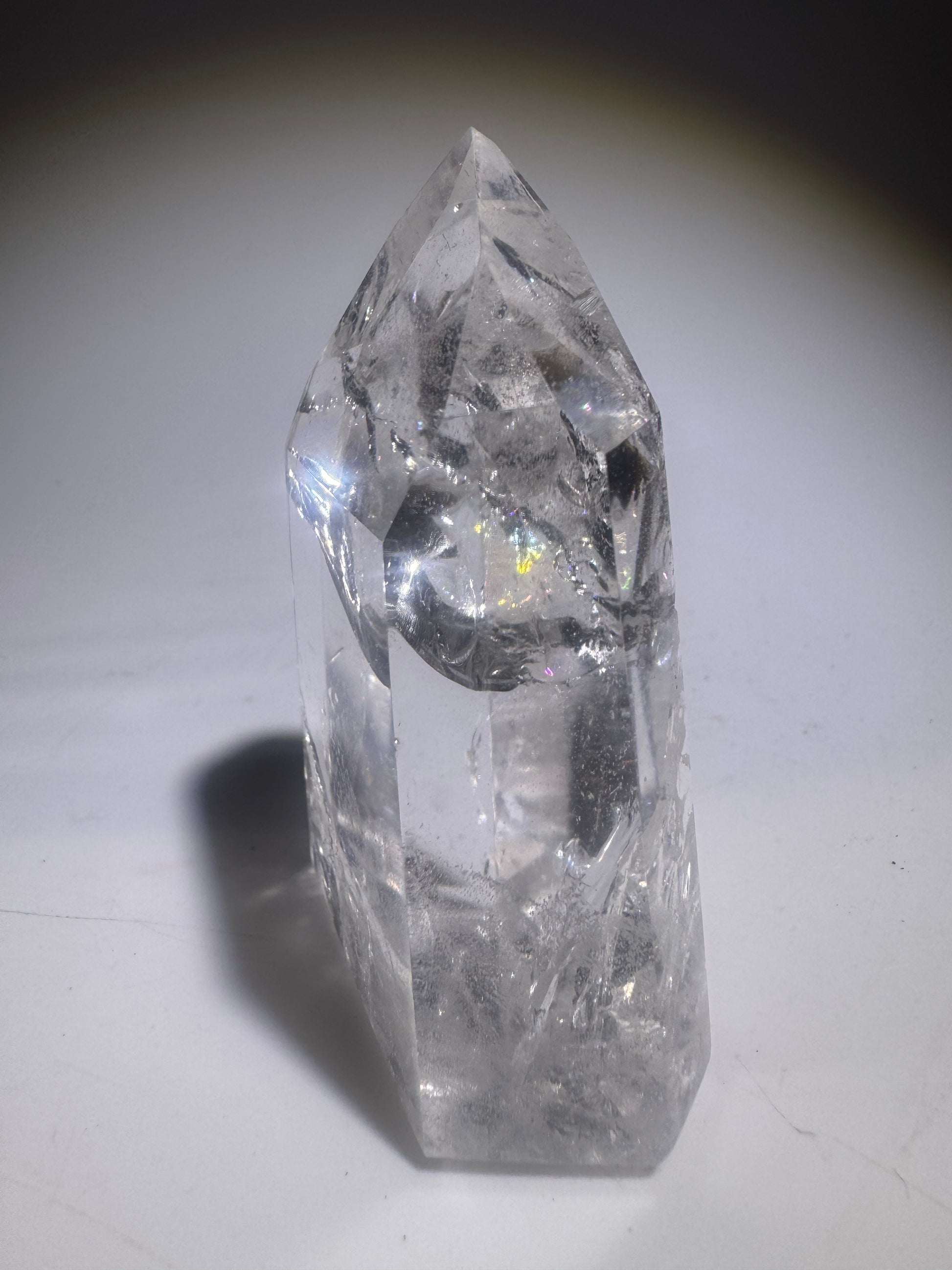 Extra klare Bergkristallspitze 7 cm, 123g aus Brasilien – Strahlendes Feuer & Regenbogen