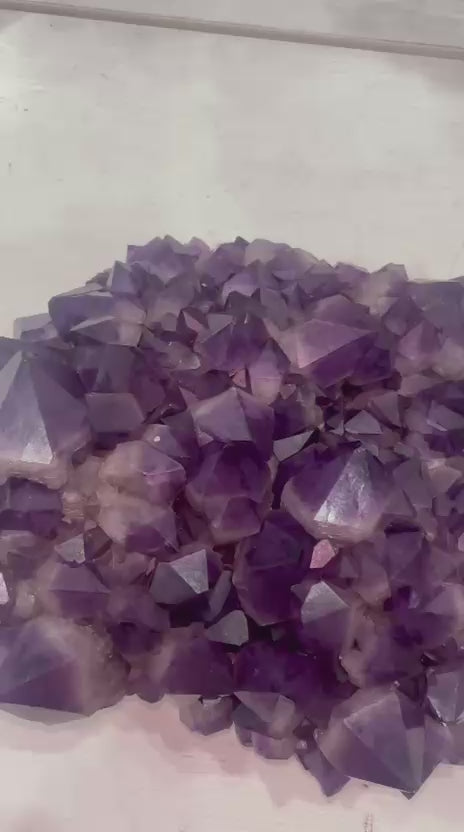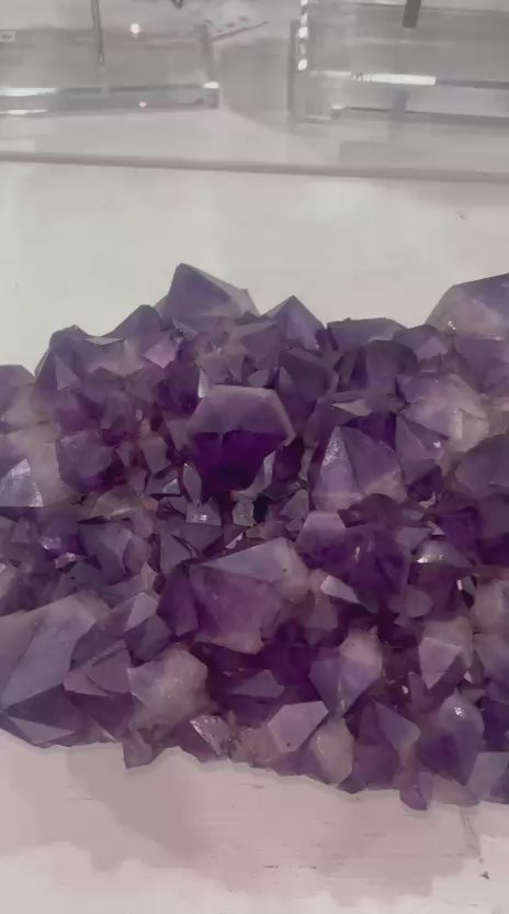 Dieser aussergewöhnlich grosse Kongo-Amethyst ist ein wahres Meisterwerk der Natur. Mit einem Gewicht von 19.81 Kilogramm und kraftvoll ausgebildeten Kristallspitzen zieht dieses beeindruckende Stück sofort alle Blicke auf sich. Seine Präsenz ist ruhig, stark und zutiefst erdend – ein echtes Sammlerstück von seltener Qualität.