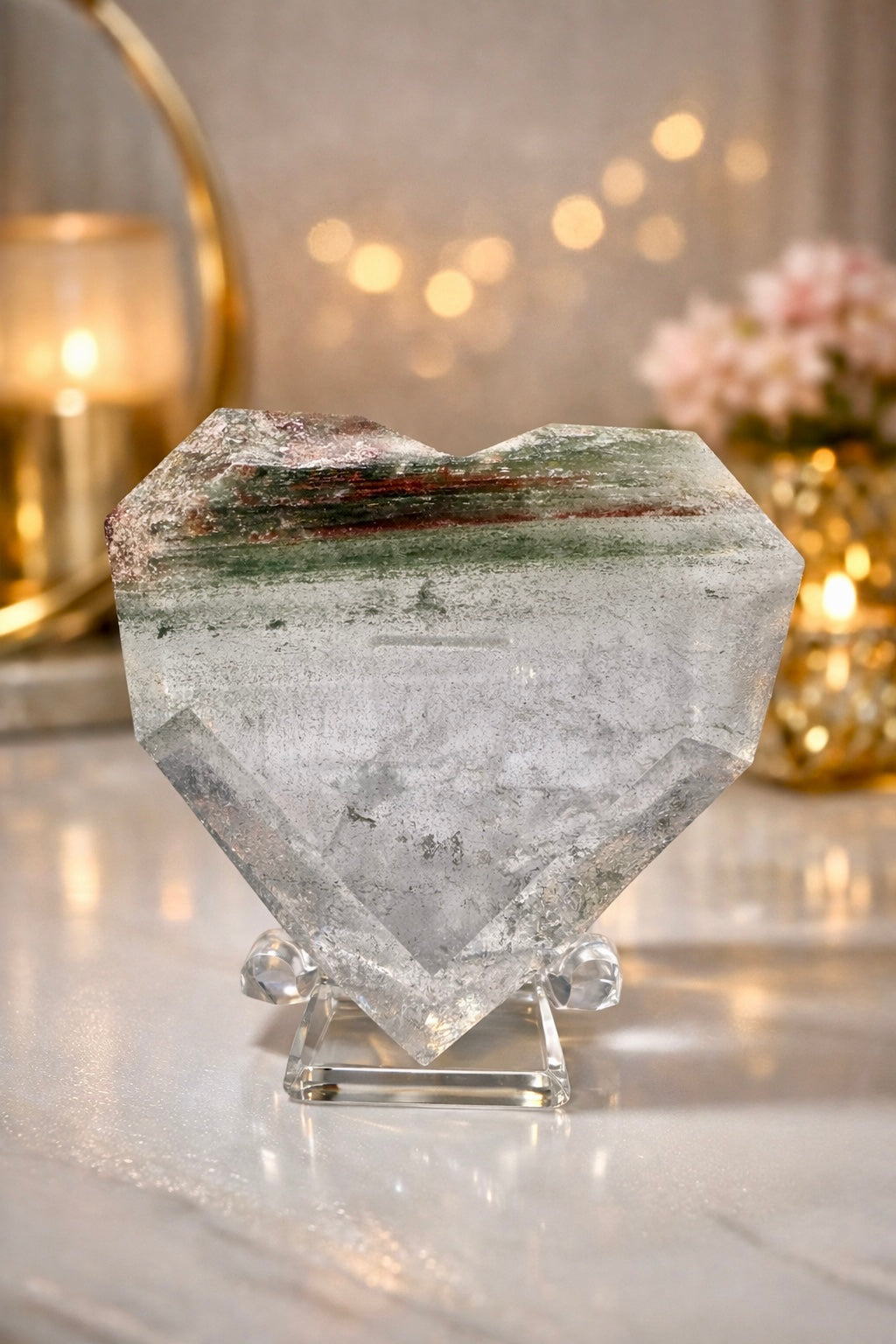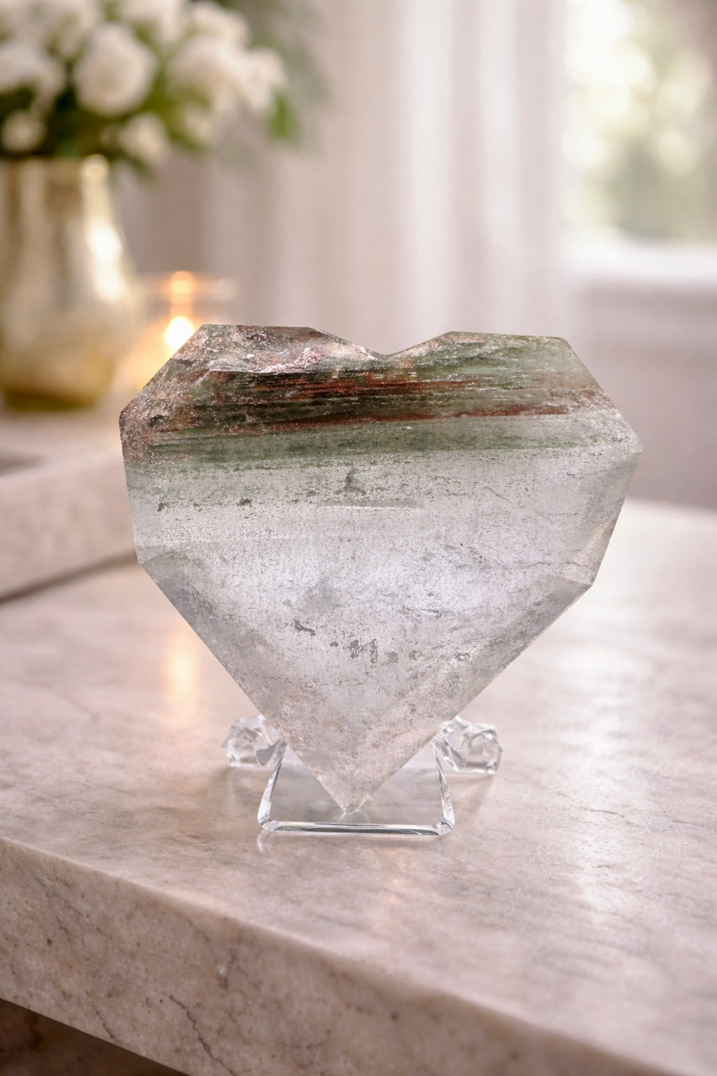 Dieses facettierte Herz aus Gartenquarz ist ein wahrhaft besonderes Stück – mit zarten, eingebetteten Phantomen, die im Innern wie geheimnisvolle Landschaften erscheinen.