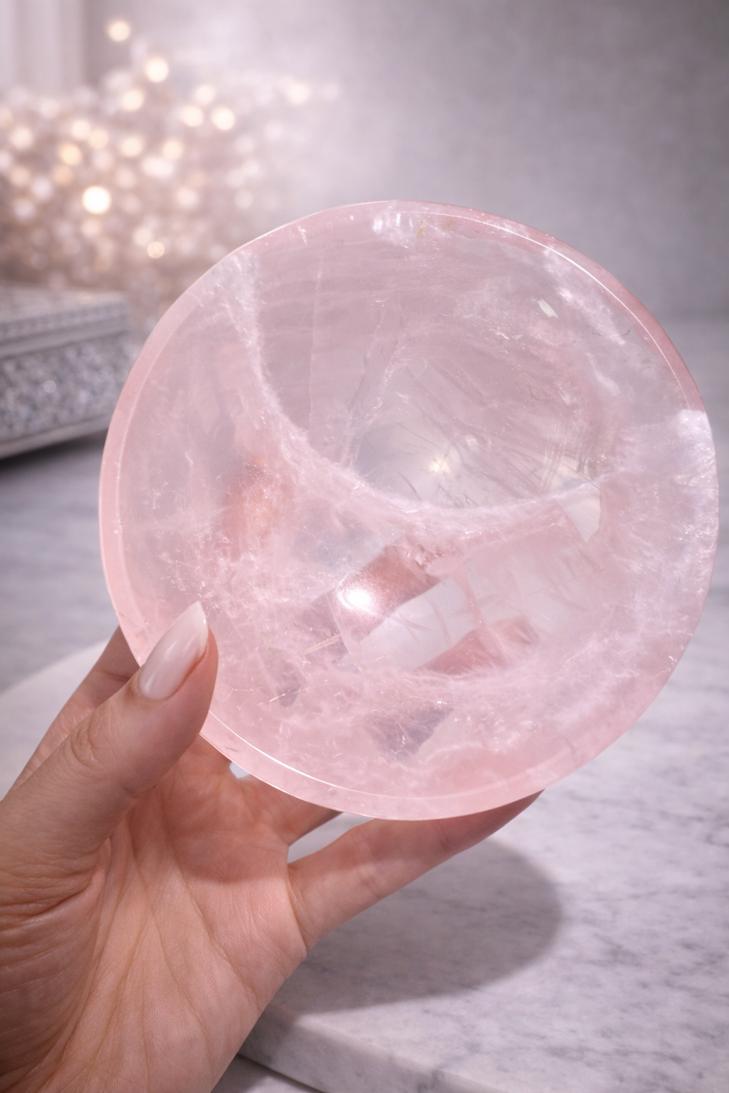 Um eine Schale dieser Grösse und Qualität herzustellen, wird ein aussergewöhnlich grosser und klarer Rosenquarz benötigt – sorgfältig ausgewählt und handgeschliffen in Brasilien.