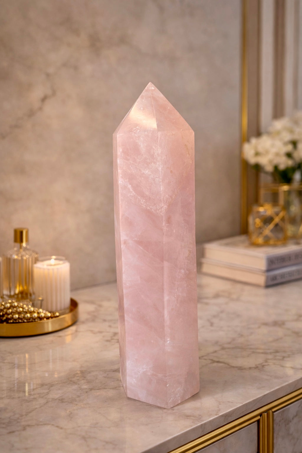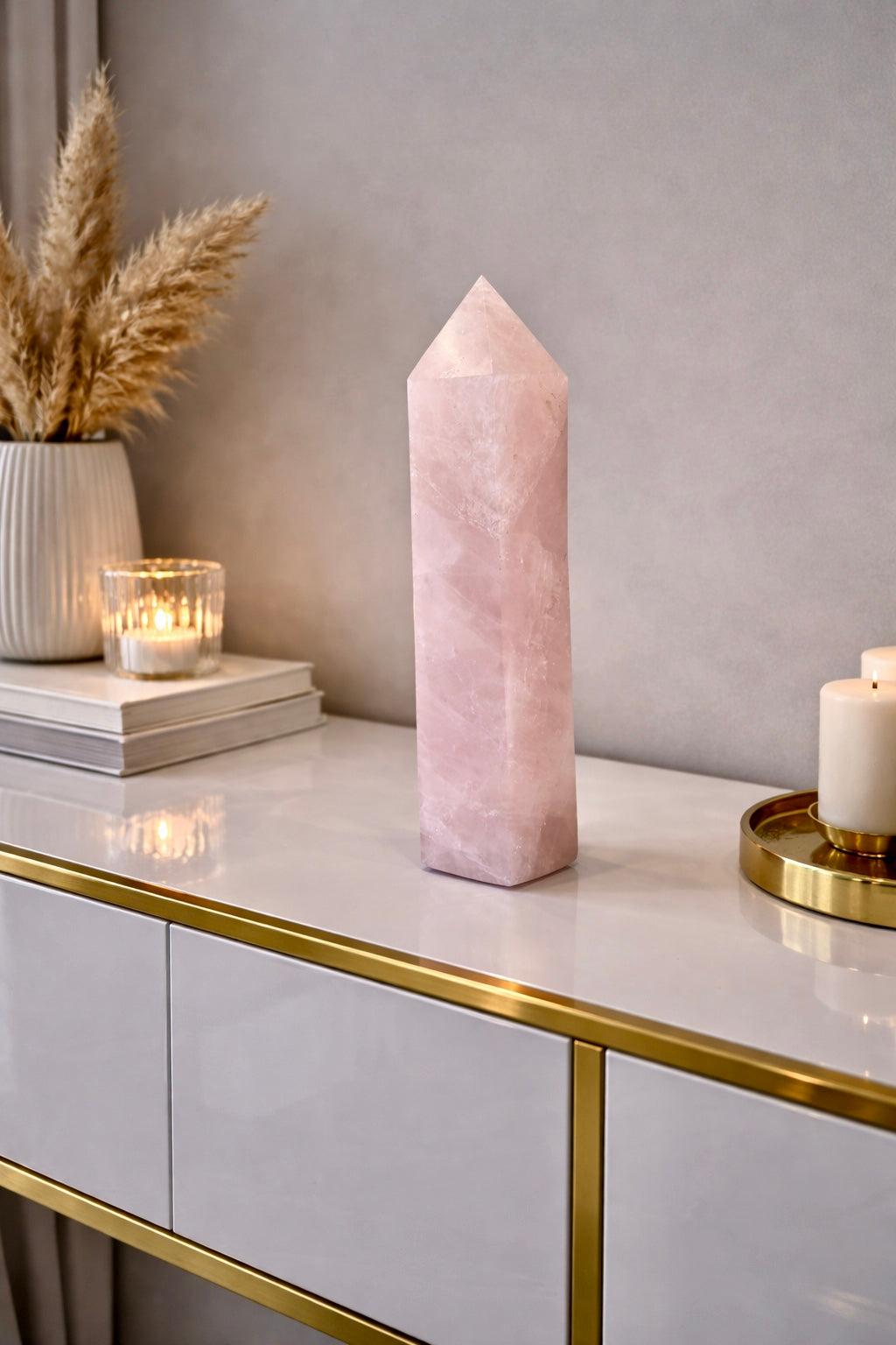 Entdecke die exquisite Schönheit dieser hochwertigen Rosenquarz-Spitze, gefertigt aus feinstem zartrosa Rosenquarz. Ein echter Blickfang, der durch seine sanfte Farbe und makellose Qualität besticht.