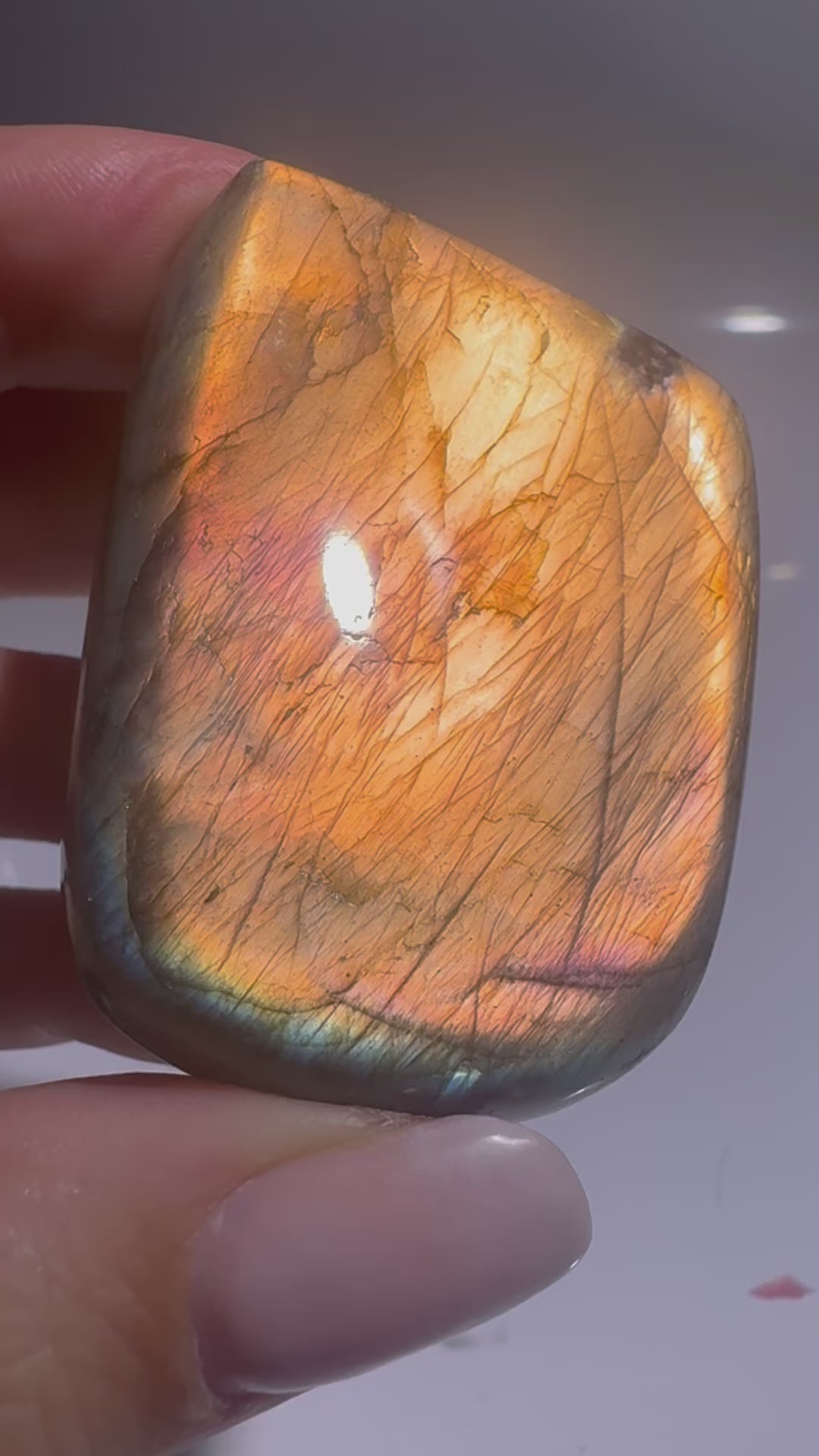 Dieser Labradorit Freeform aus Madagaskar ist ein absolut einzigartiges Stück mit einem extrem seltenen Farbspiel in Pink, Gold und Blau – eine Kombination, die nur sehr selten in der Natur vorkommt und von Sammlern weltweit geschätzt wird. Mit 77 Gramm und einer Grösse von 3.7x5cm bringt dieses Stück eine erstaunlich starke Energie in kompakter Form.