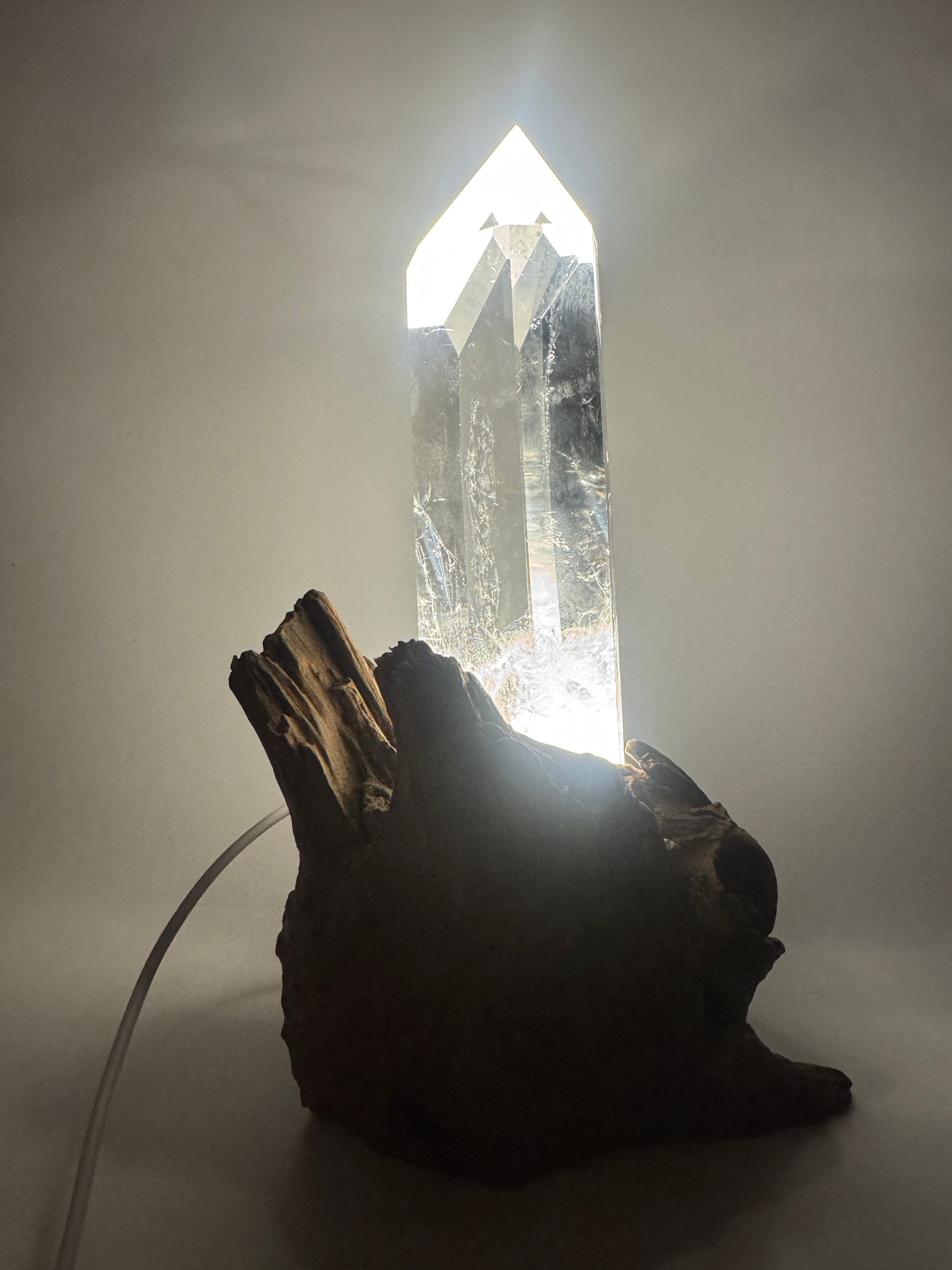 Der Holzsockel wurde extra für diese Kristallspitze handgefertigt, sodass Kristall und Basis perfekt miteinander harmonieren – ein echtes Einzelstück.