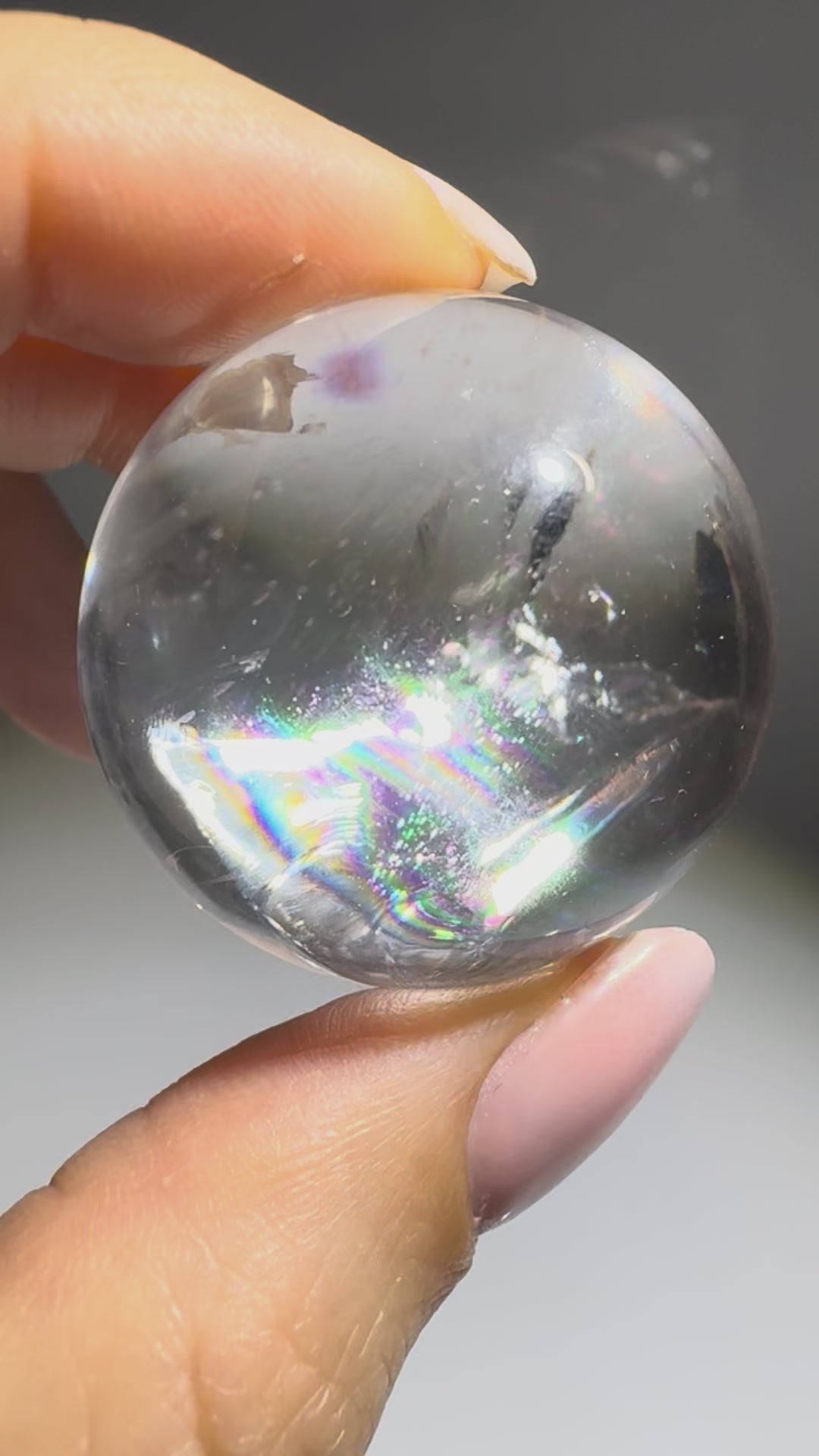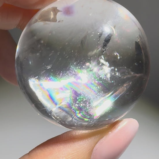 Das Innenleben dieser Kugel ist schlicht atemberaubend – es wirkt, als trage sie ein eigenes Feuer in sich. Unzählige schillernde Regenbogen tanzen in der Tiefe des Kristalls und symbolisieren Hoffnung, Licht und Transformation. Dieses seltene Phänomen entsteht, wenn das Licht in mikroskopisch kleinen Ebenen im Innern des Quarzes gebrochen wird – ein Geschenk der Natur, das nur bei den klarsten Exemplaren vorkommt.
