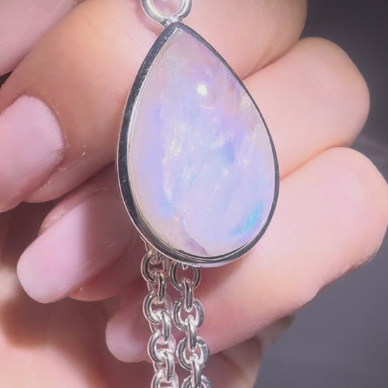 Ein traumhaft schöner Rainbow Mondstein Anhänger in edler Tropfenform, liebevoll von Hand in 925 Sterling Silber gefasst. Die Gesamtlänge beträgt 3,7 cm, der leuchtende Mondstein selbst misst 2,4 cm – ein zartes, aber ausdrucksstarkes Schmuckstück voller Magie und Gefühl. 💖