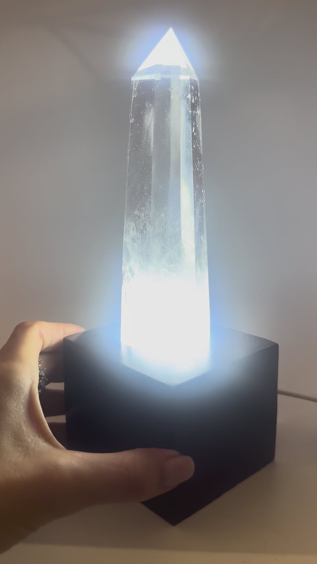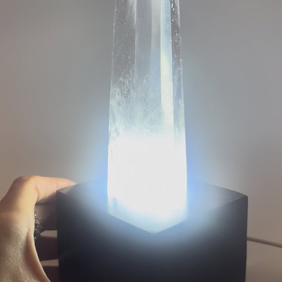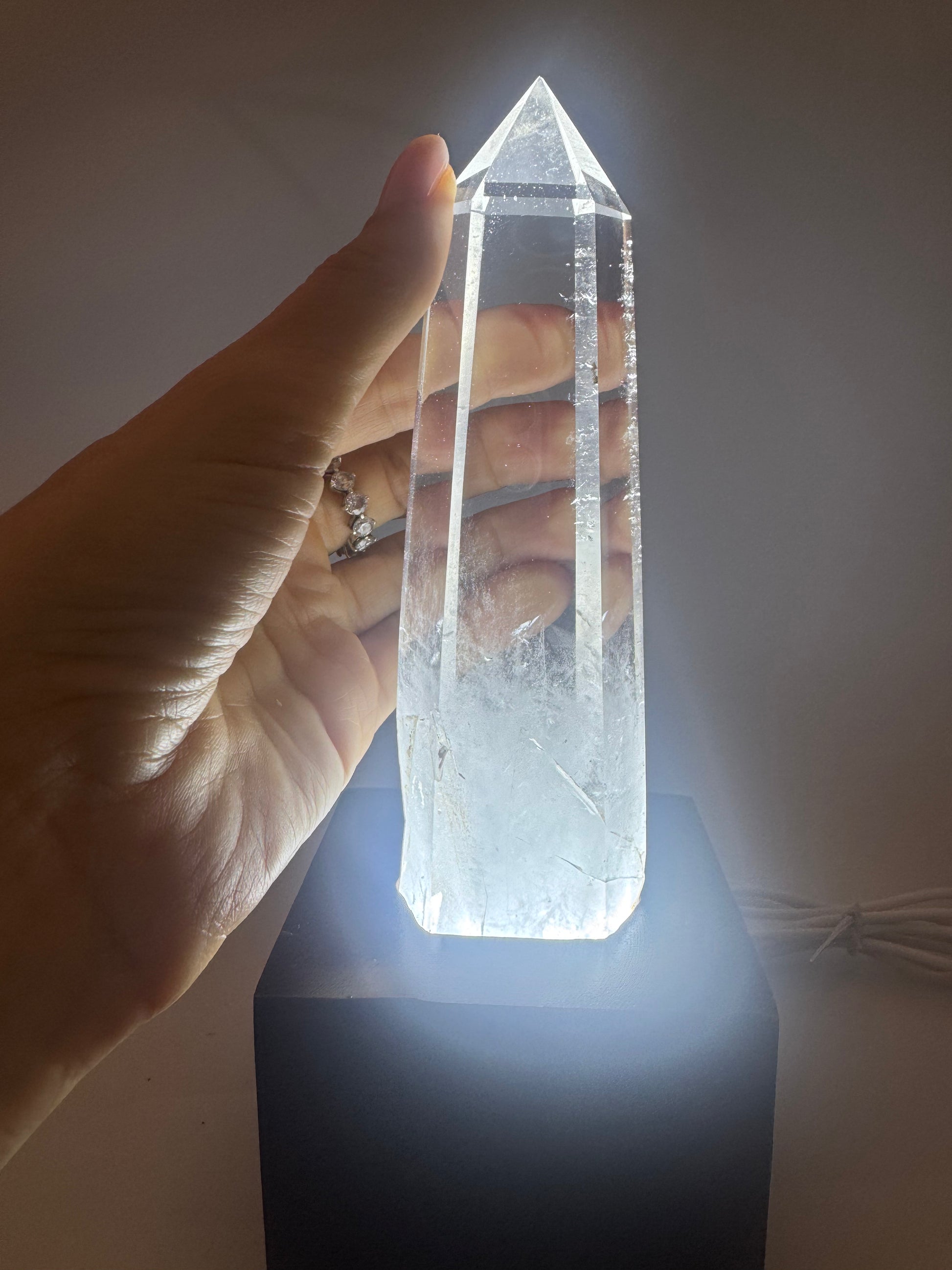 Im Sockel befindet sich eine dezente Vertiefung für das integrierte LED-Licht, welches den Kristall von unten sanft beleuchtet. Dadurch entfaltet die Spitze ihre volle Brillanz und Klarheit. Das LED-Licht verfügt über einen USB-Stecker und wird selbstverständlich mitgeliefert. Auf Wunsch kann die Beleuchtung jederzeit entfernt werden, sodass die Kristallspitze auch pur oder separat ohne Sockel aufgestellt werden kann.