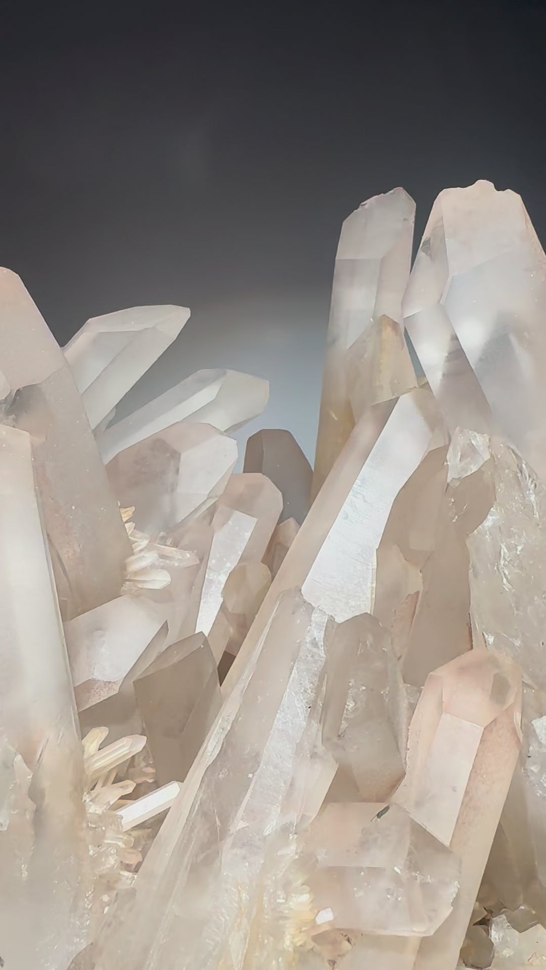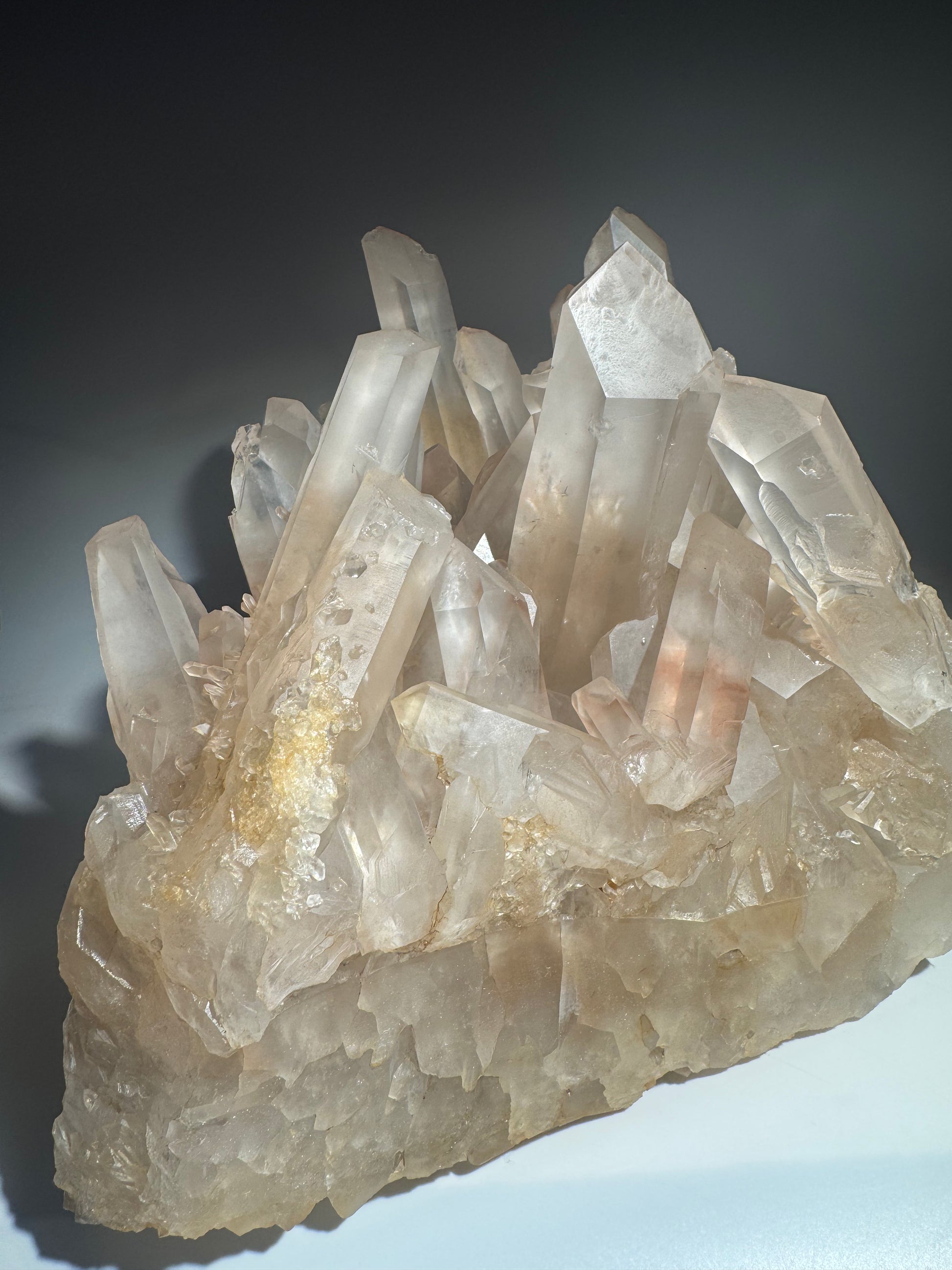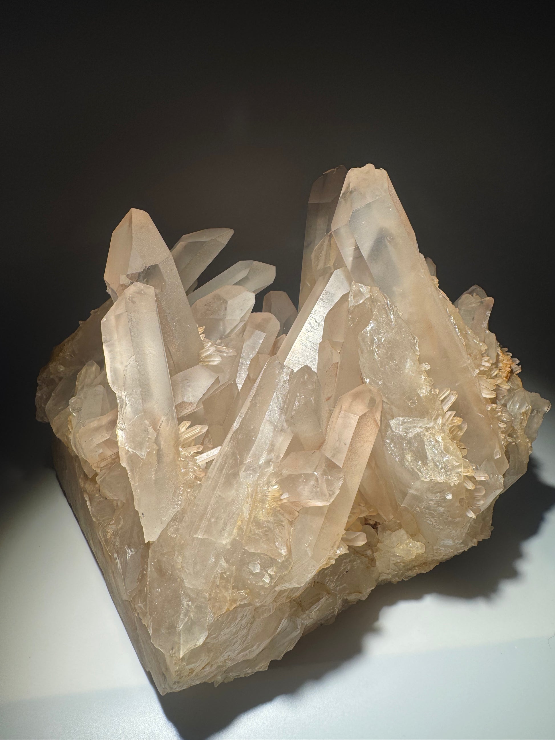 Die Oberfläche ist dicht besetzt mit unzähligen klar ausgebildeten Spitzen. Zwischen den grösseren Kristallen wachsen filigrane Babyspitzen, die dem gesamten Stück Tiefe und Lebendigkeit verleihen. Jede Spitze ist sauber gewachsen, lichtdurchlässig und von aussergewöhnlicher Qualität. Die Formation wirkt wie eine gewachsene Kristalllandschaft – kraftvoll und zugleich zart.