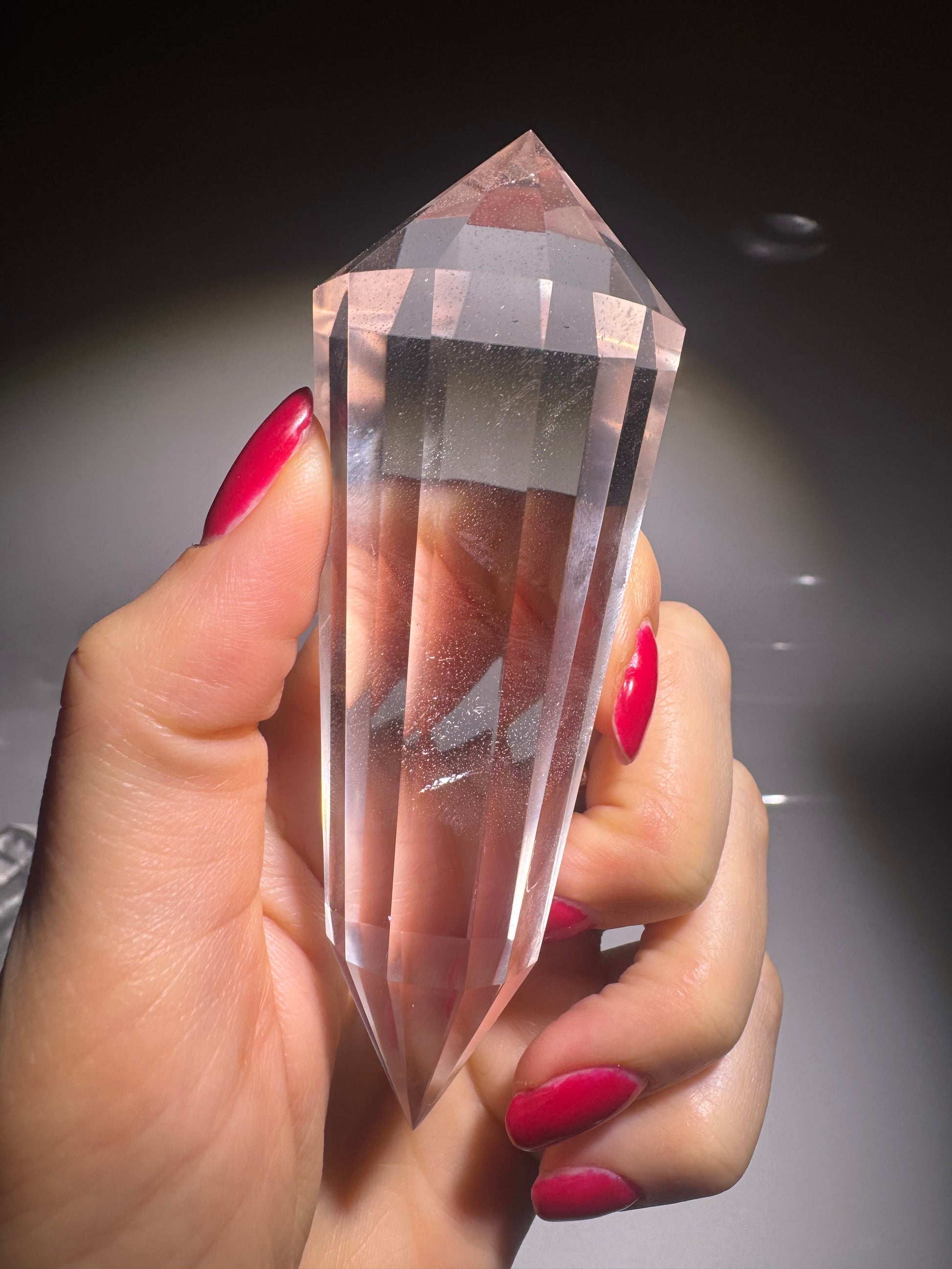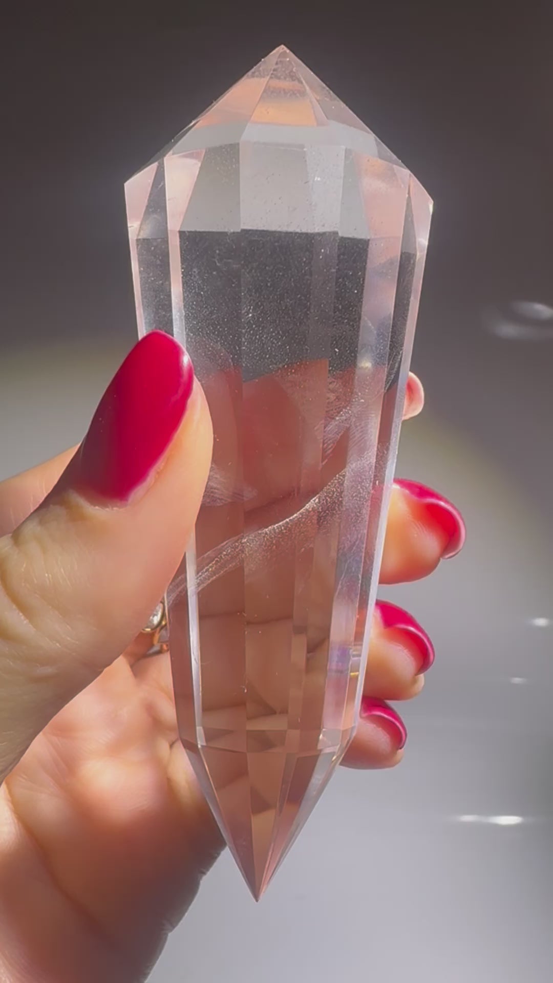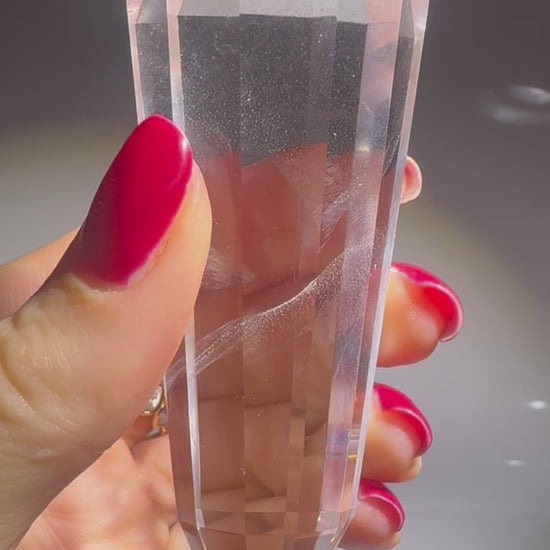 Ihr Innenleben fasziniert durch zauberhafte Strukturen, zart schimmernde Schlieren und kleine Lichtspiele – fast wie ein geheimer Kosmos, der sich im Innern entfaltet ✨ Der Kristall ist aussergewöhnlich klar und wurde exakt im Vogel-Cut-Schliff mit 12 Facetten gefertigt – ein Schliff, der dafür bekannt ist, Energie zu bündeln, zu transformieren und in Harmonie weiterzuleiten.