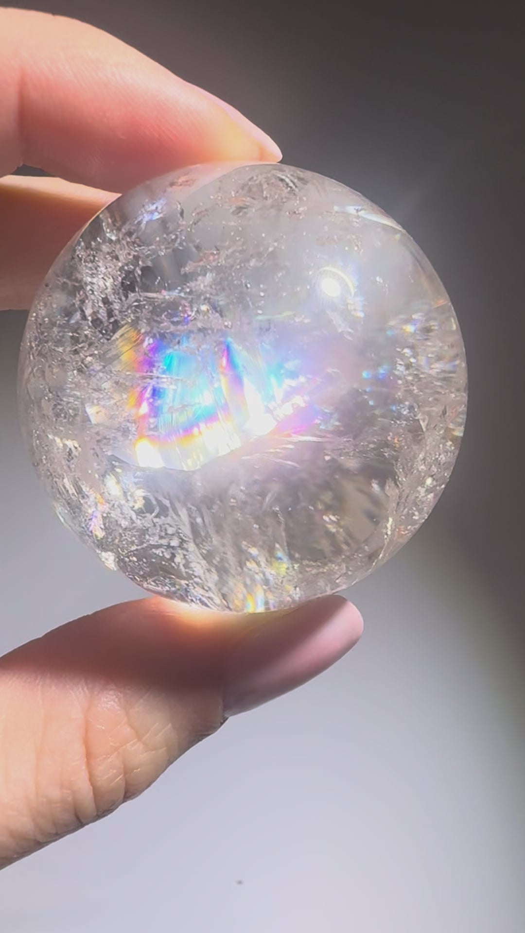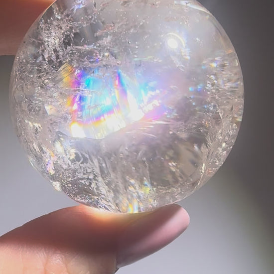Das Innenleben dieser Kugel ist schlicht atemberaubend – es wirkt, als trage sie ein eigenes Feuer in sich. Unzählige schillernde Regenbogen tanzen in der Tiefe des Kristalls und symbolisieren Hoffnung, Licht und Transformation. Dieses seltene Phänomen entsteht, wenn das Licht in mikroskopisch kleinen Ebenen im Innern des Quarzes gebrochen wird – ein Geschenk der Natur, das nur bei den klarsten Exemplaren vorkommt.