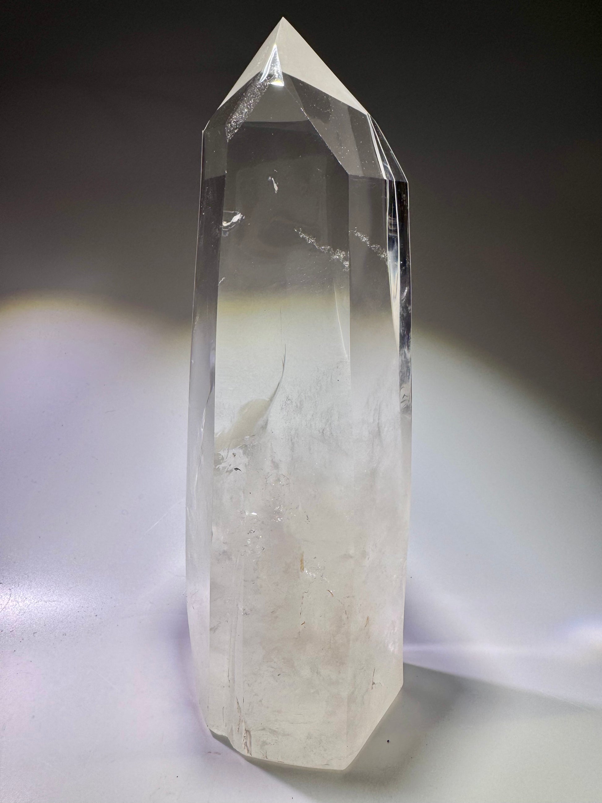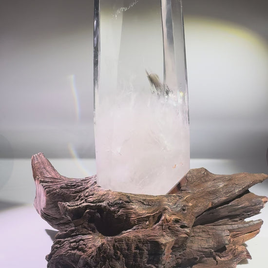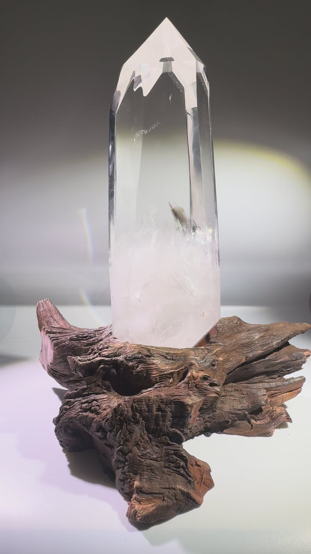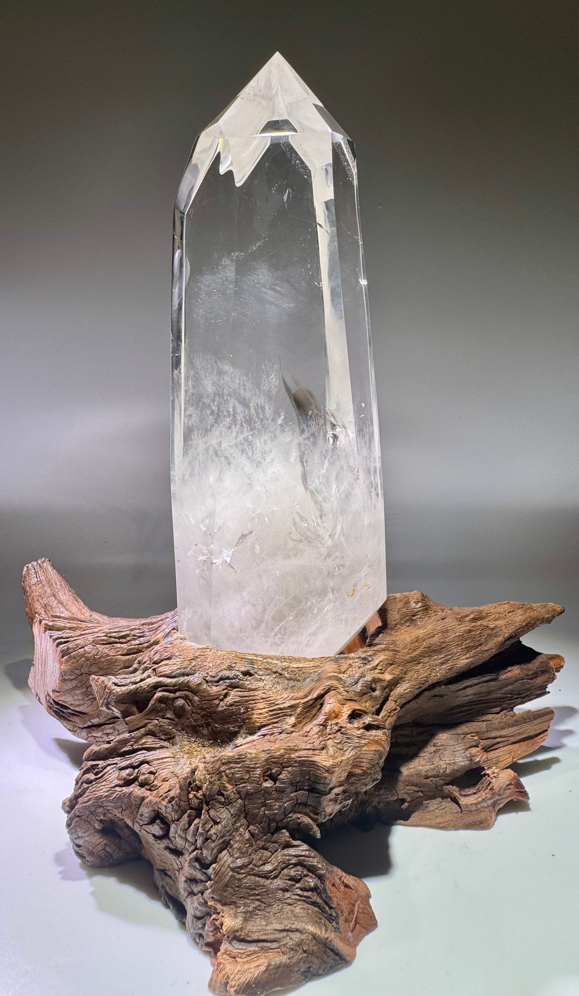 Diese monumentale Bergkristallspitze beeindruckt durch ihre aussergewöhnliche Klarheit und natürliche Präsenz. Die Spitze ist naturbelassen und zeigt die reine, unverfälschte Schönheit des Kristalls. Der speziell angepasste Wurzelständer unterstreicht die natürliche Ästhetik und sorgt für eine harmonische Präsentation.