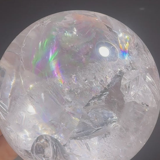 Diese Bergkristallkugel ist ein wahres Traumstück. Stellenweise glasklar, dann wieder erfüllt von magischen Regenbogen, lichtbrechenden Einschlüssen und faszinierenden Strukturen. Jede Drehung offenbart eine neue, zauberhafte Welt. Mit ihrem Durchmesser von 8 cm und einem Gewicht von 735 g gehört sie zu den grossen, besonders hochwertigen Kugeln.