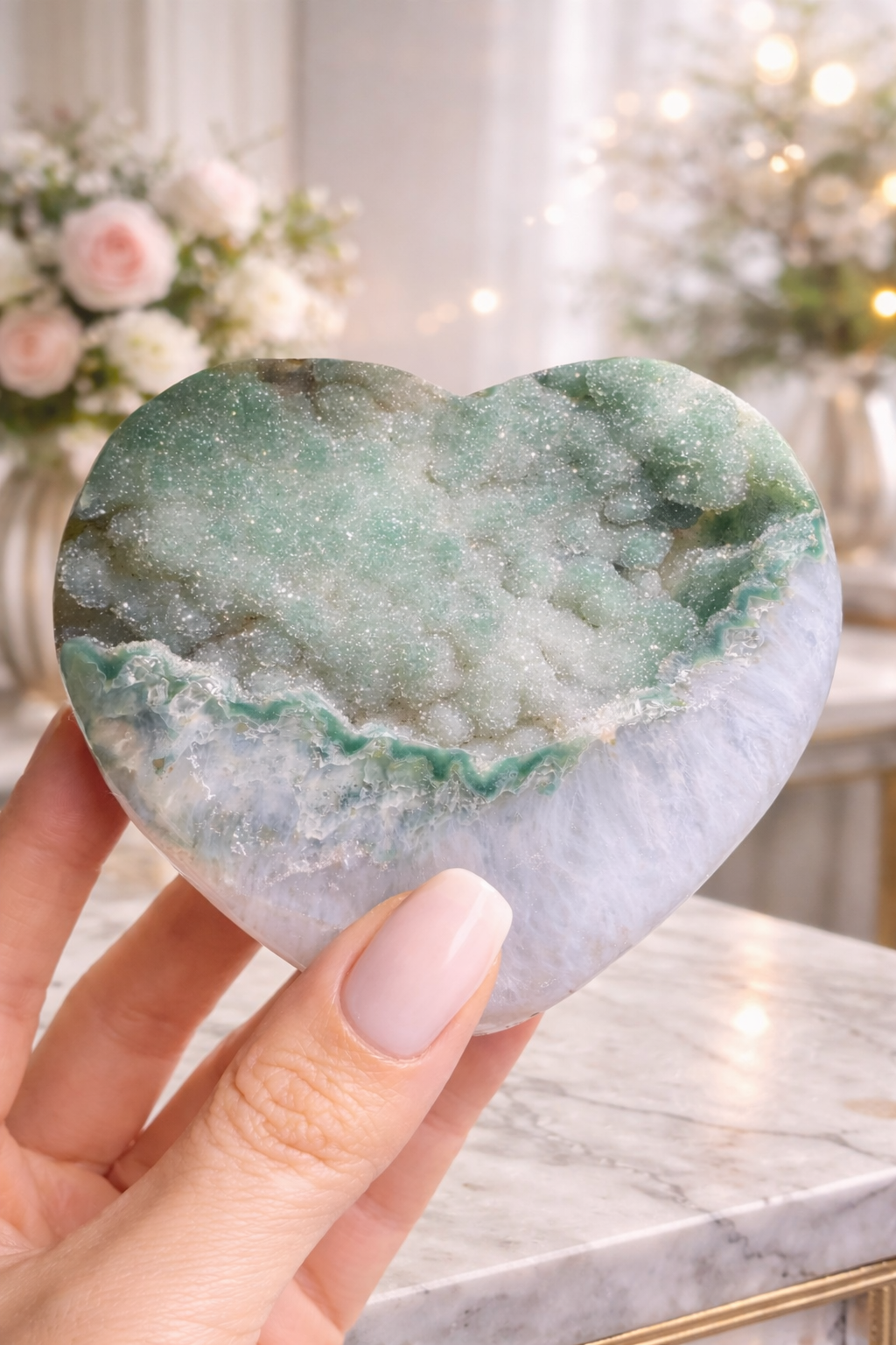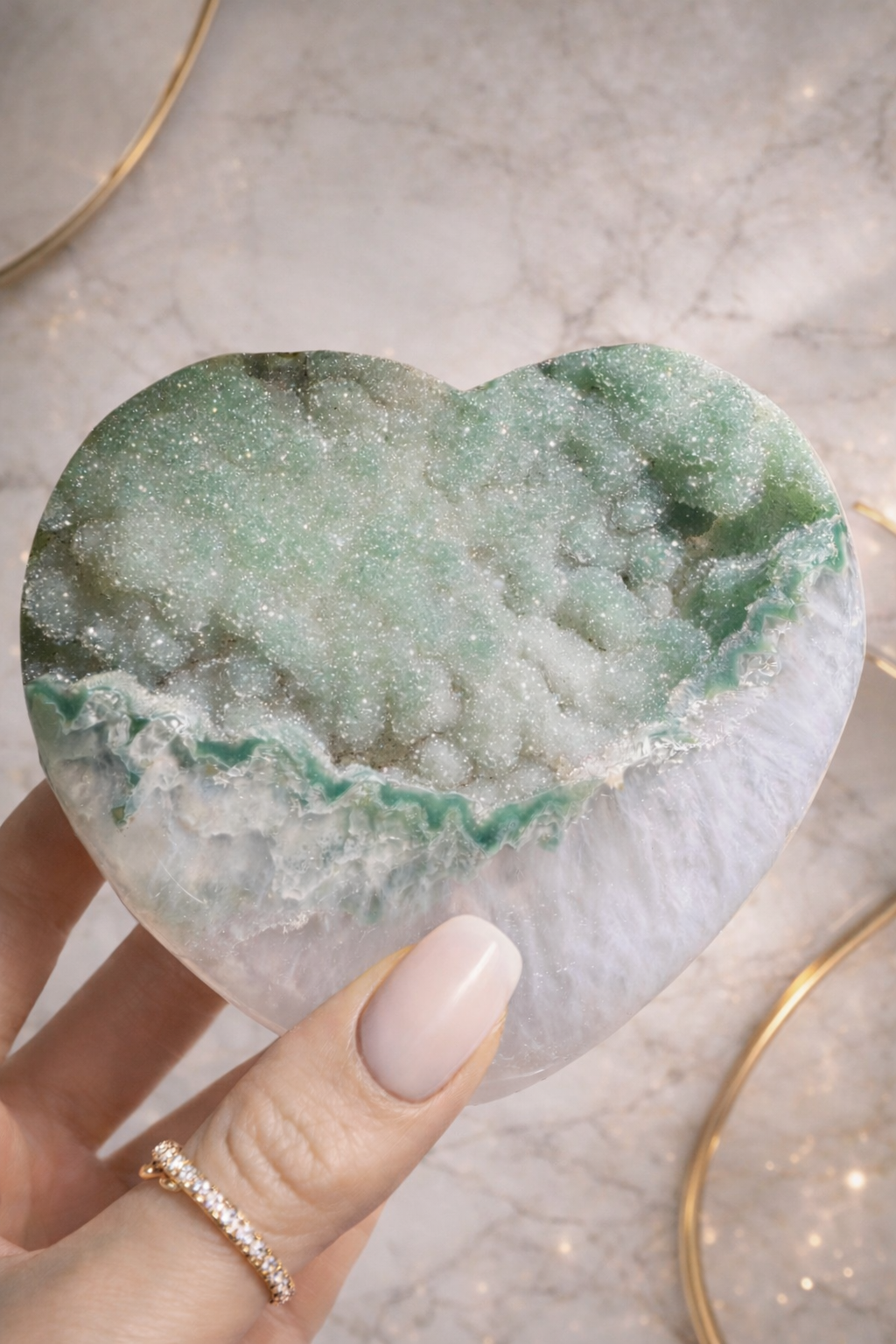 Die Besonderheit dieses Herzens liegt in der extrem seltenen Doppelkristallisation, die das Licht in atemberaubender Weise bricht und das grüne Farbspiel intensiviert 🌈💖 Rainbow Amethyst ist für seine heilenden und harmonisierenden Eigenschaften bekannt. Er stärkt Intuition, öffnet Herz und Geist und bringt emotionale Balance in dein Leben 🧘💜