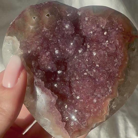 Dieses Rainbow Amethyst Herz ist ein absolutes Traumstück der Natur – handgeschliffen und poliert in Uruguay, wo einige der schönsten Amethyste der Welt gefunden werden. Mit einer Grösse von 8.9 cm und einem Gewicht von 342g strahlt dieses Herz pure Eleganz und Magie aus. Die seltenen pinken Kristalle funkeln intensiv im Licht und schenken dem Stein eine unverwechselbare, fast himmlische Aura. Pinker Amethyst ist extrem selten – seine zarte Farbe entsteht nur unter ganz speziellen geologischen Bedingungen.