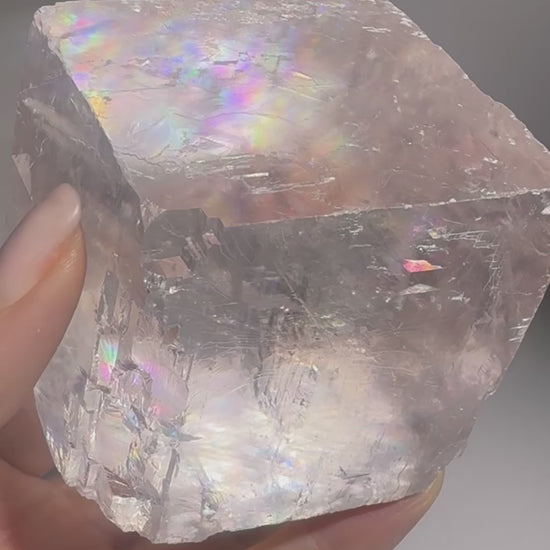 Optischer Calcit ist bekannt für seine besondere Lichtbrechung und seine klare, fast gläserne Erscheinung. Durch natürliche innere Spannungen entstehen schimmernde Regenbogen, die je nach Lichteinfall sanft tanzen. Dieser Würfel vereint geometrische Präzision mit organischer Schönheit – ein echtes Naturkunstwerk.