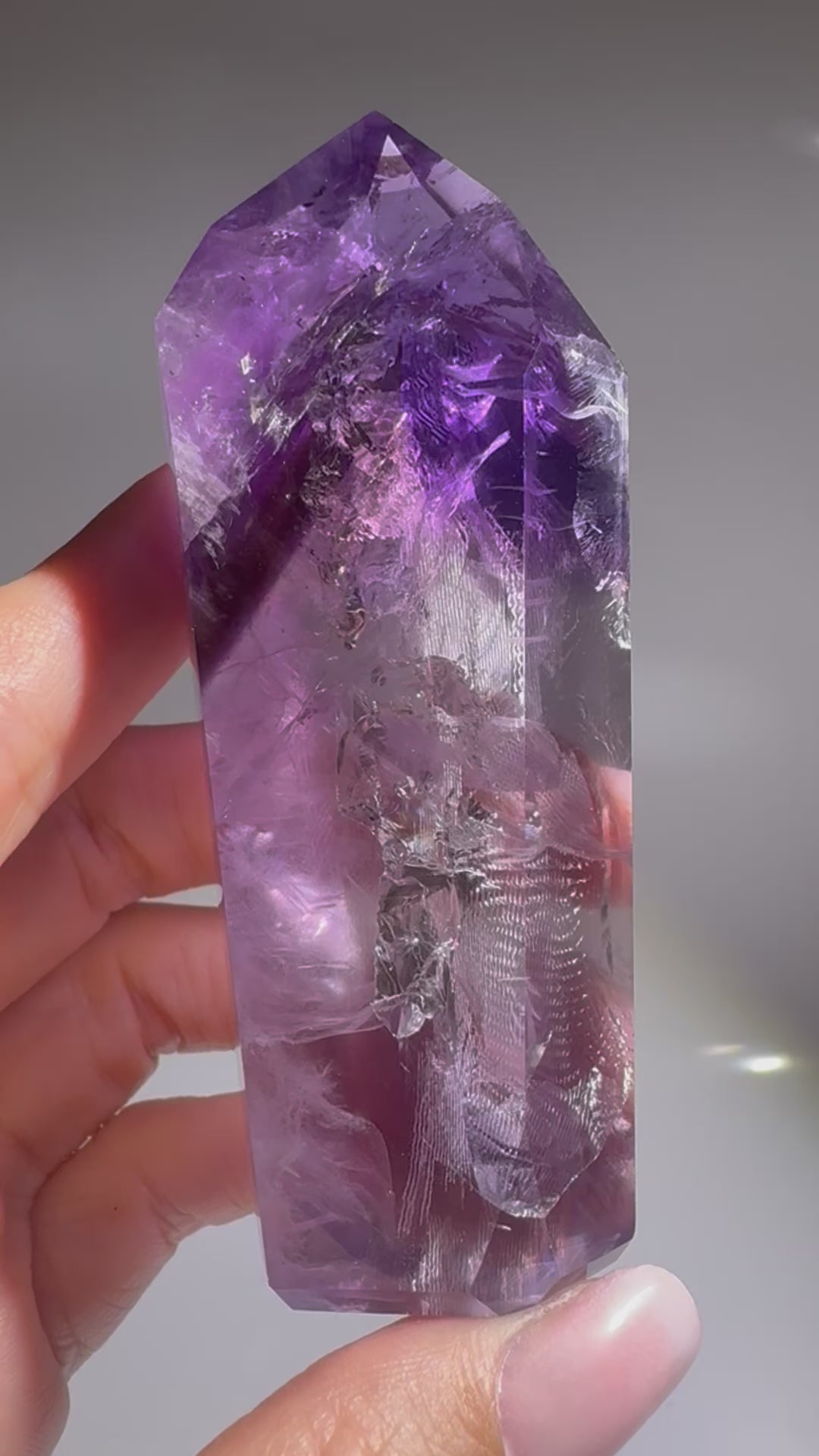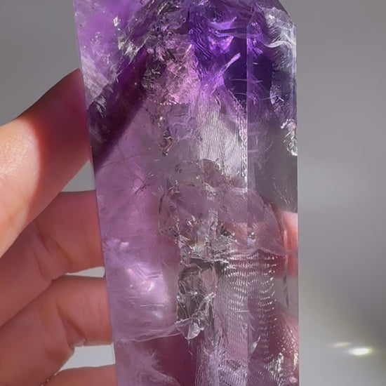 An exceptionally clear phantom amethyst from Brazil – 6.1 cm high, 112 g in weight, of rare premium quality. Its fascinating interior reveals several visible growth phases, delicate layers of mist, luminous violet zones, and spectacular rainbow reflections that constantly unfold anew in the light. A piece that not only delights visually but also touches the soul.
