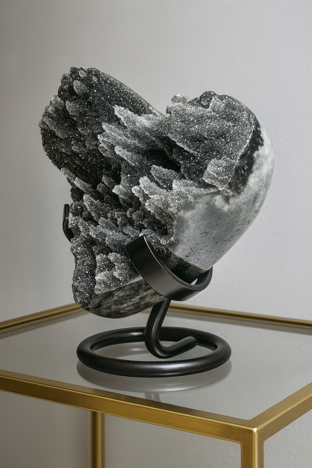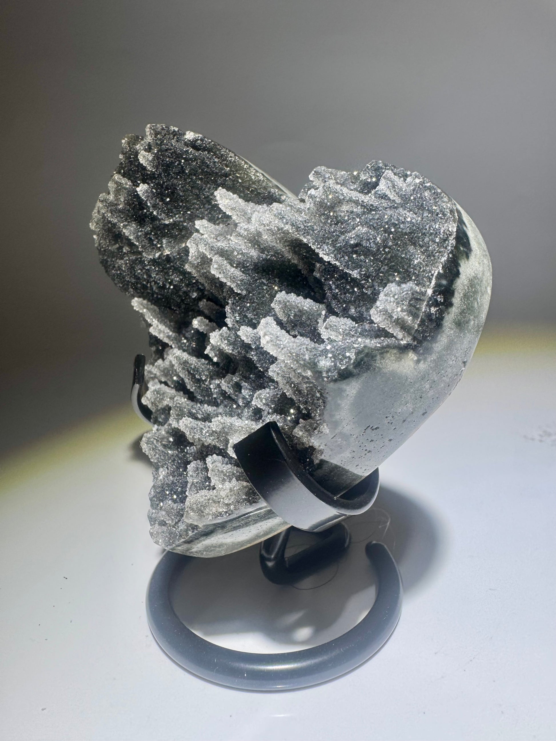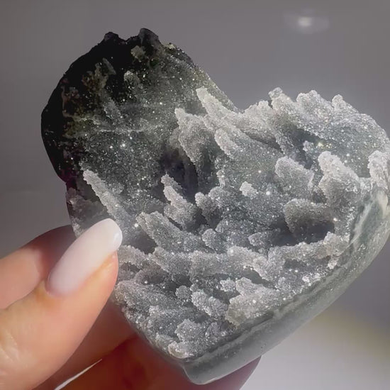 Exclusive amethyst heart with wonderfully sparkling long druzy stalactites from Uruguay. Stand can be purchased separately.
