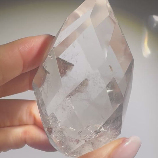 Sorgfältig von Hand geschliffen, zeigt dieser Kristall in jeder Facette seine Reinheit und Eleganz. Die Lichtbrechung auf den glatten Flächen erzeugt ein edles Funkeln – zeitlos und stilvoll.