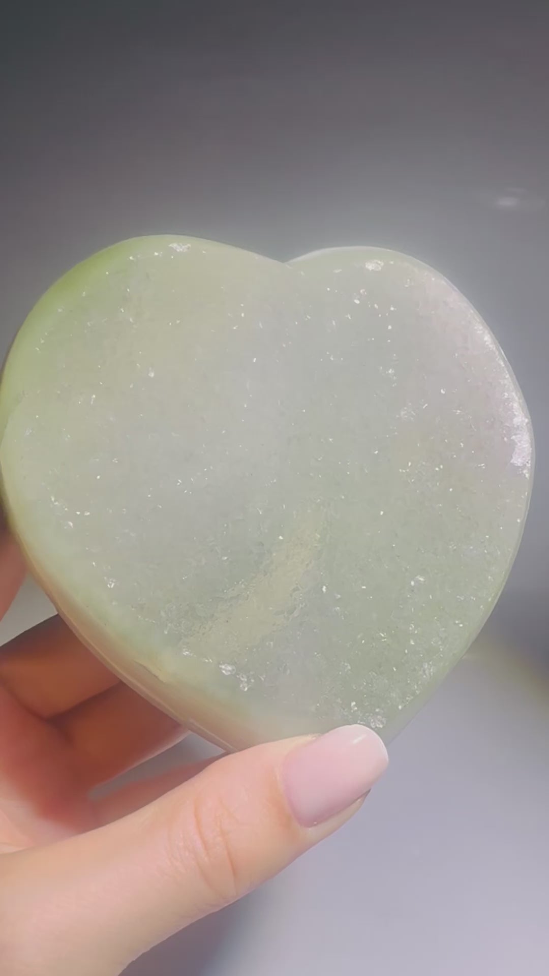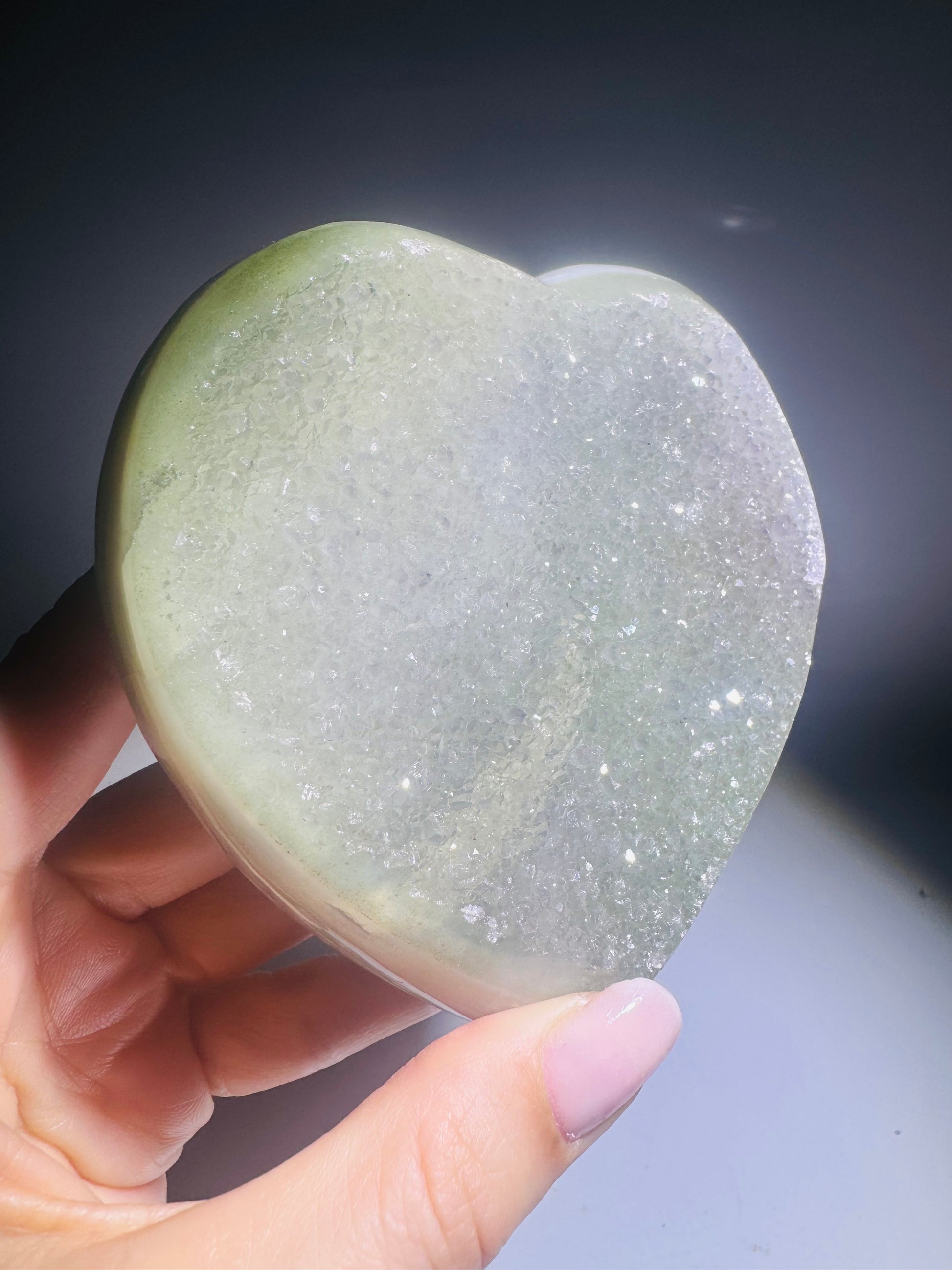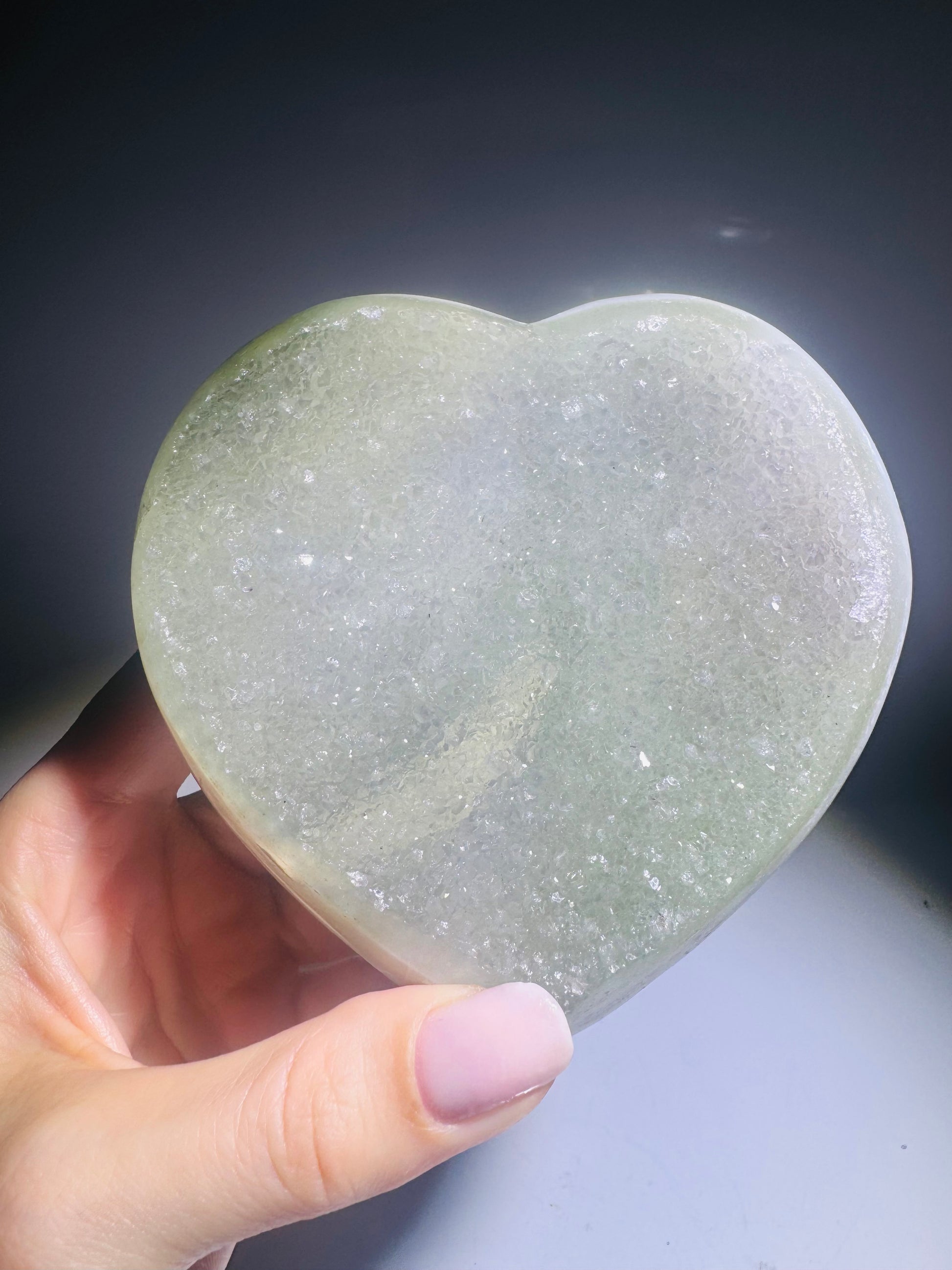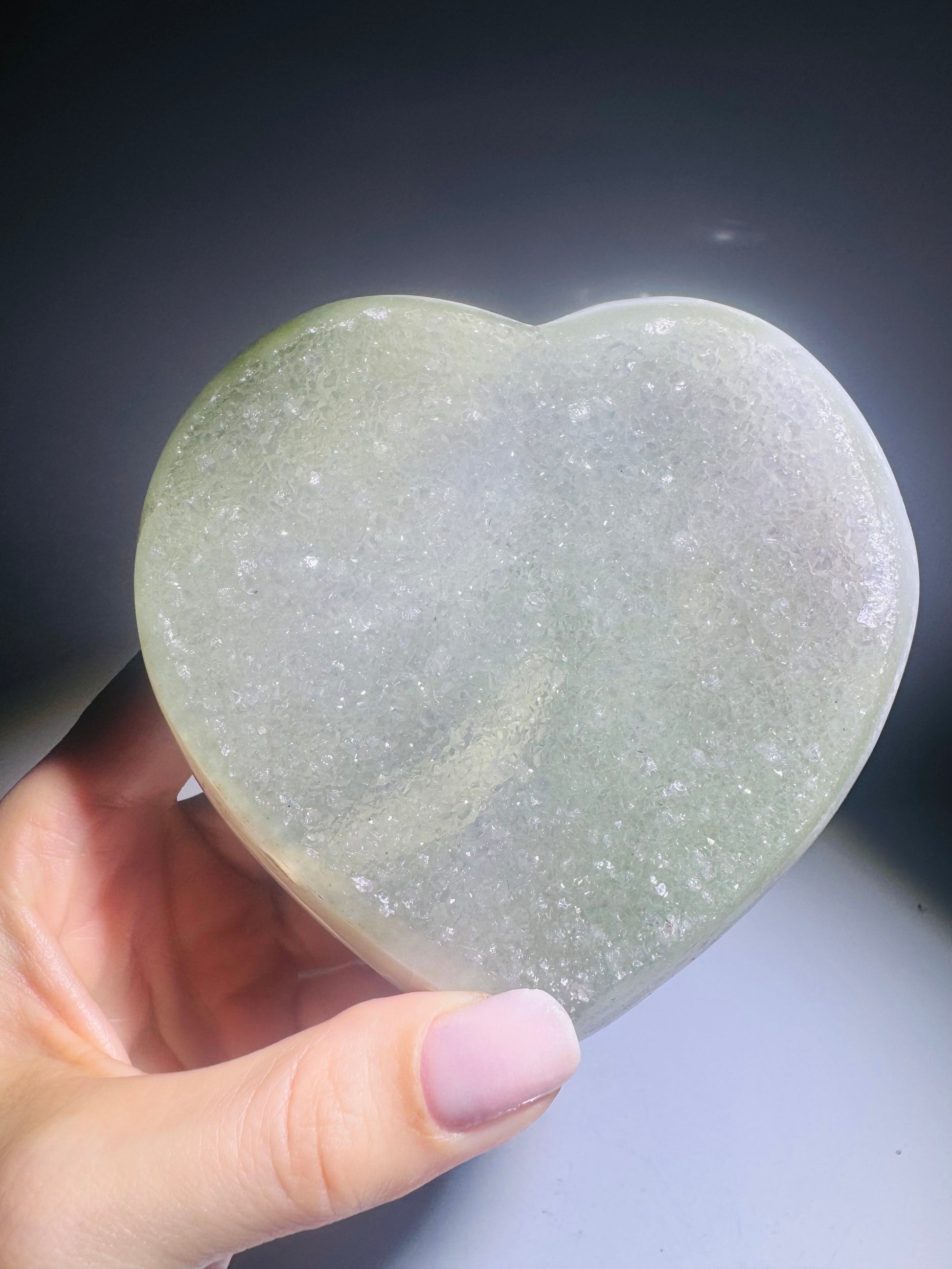 Dieses wunderschöne Achat-Herz aus Uruguay misst 10,5 cm und wiegt 532 g. Es ist ein absolutes Traumstück, das durch seine unzähligen funkelnden Kristalle und den einzigartigen Galaxy-Effekt verzaubert. Die Kristalle erscheinen wie kleine Sterne in einem Kosmos aus sanften Farben und funkelndem Licht, was jedem Raum eine magische Energie schenkt.