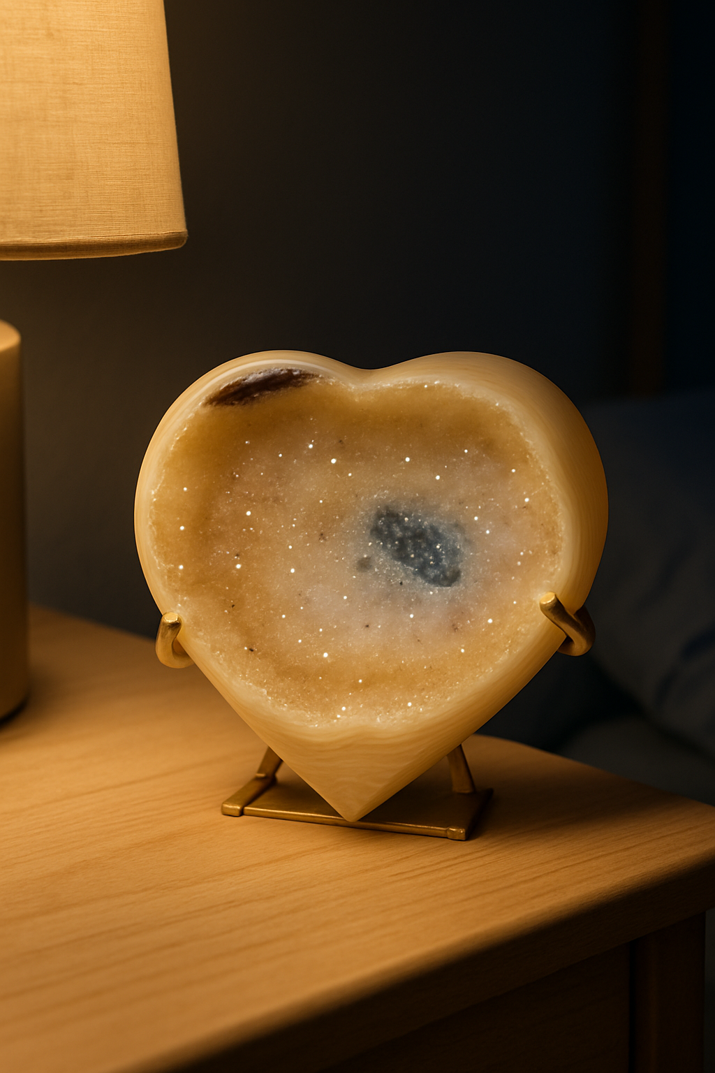 Dieses bezaubernde Achat-Herz ist ein echtes Kunstwerk der Natur 💎 – handverlesen in Brasilien 🇧🇷 und in liebevoller Handarbeit in Herzform geschliffen. Seine Oberfläche funkelt wie ein Sternenhimmel, durchzogen von winzigen Kristallen, die bei Lichteinfall glitzern wie eine Galaxie aus Licht 🌌✨