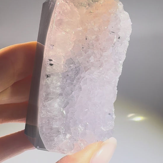 Diese sĂŒsse Achatspitze 💎 (8 cm) funkelt mit unzĂ€hligen, feinsten Kristallen, die im Licht wie kleine Sterne glitzern ✹. Jedes Detail offenbart ein eigenes, faszinierendes Innenleben – zart, geheimnisvoll und voller natĂŒrlicher Eleganz.
