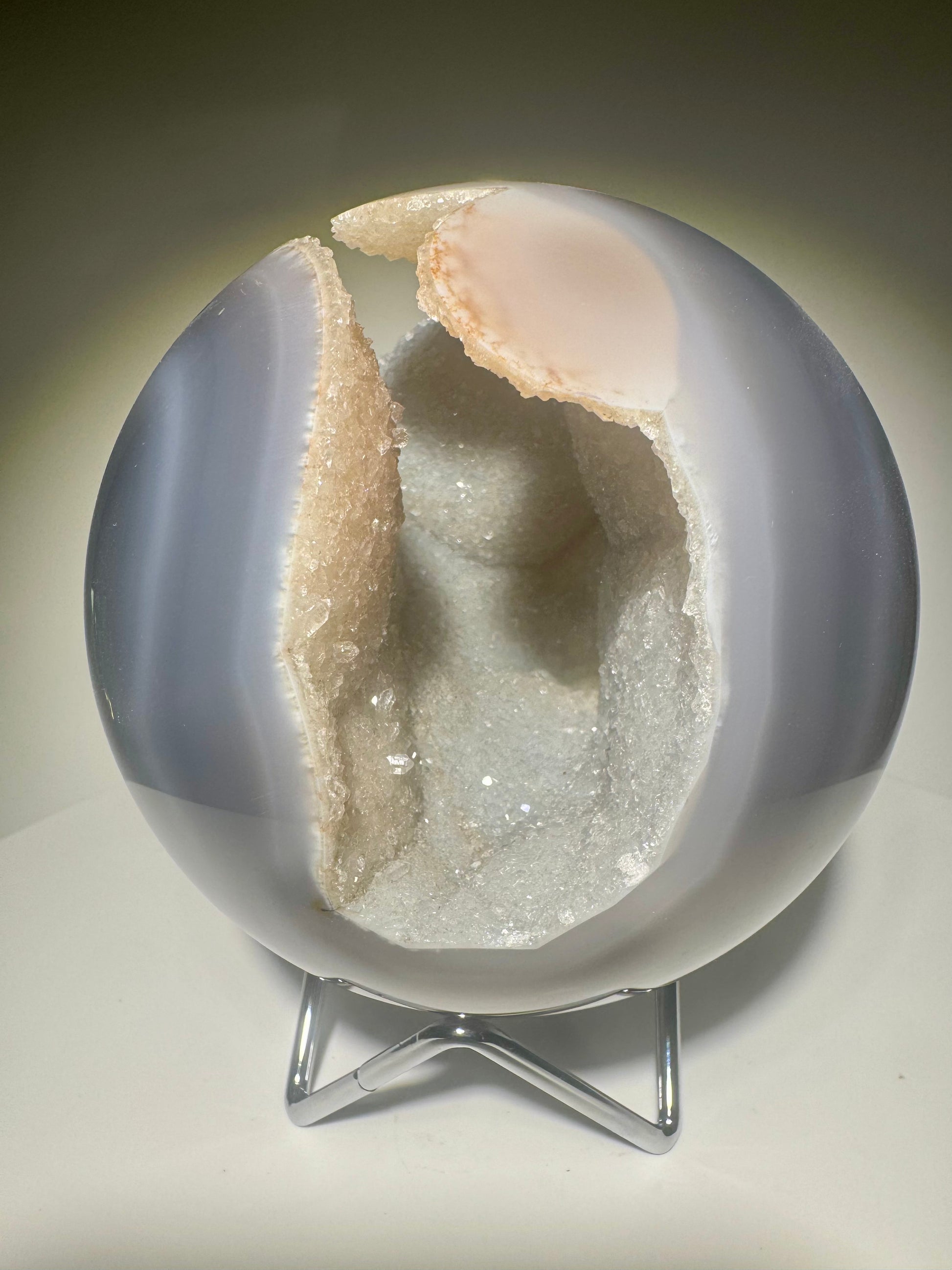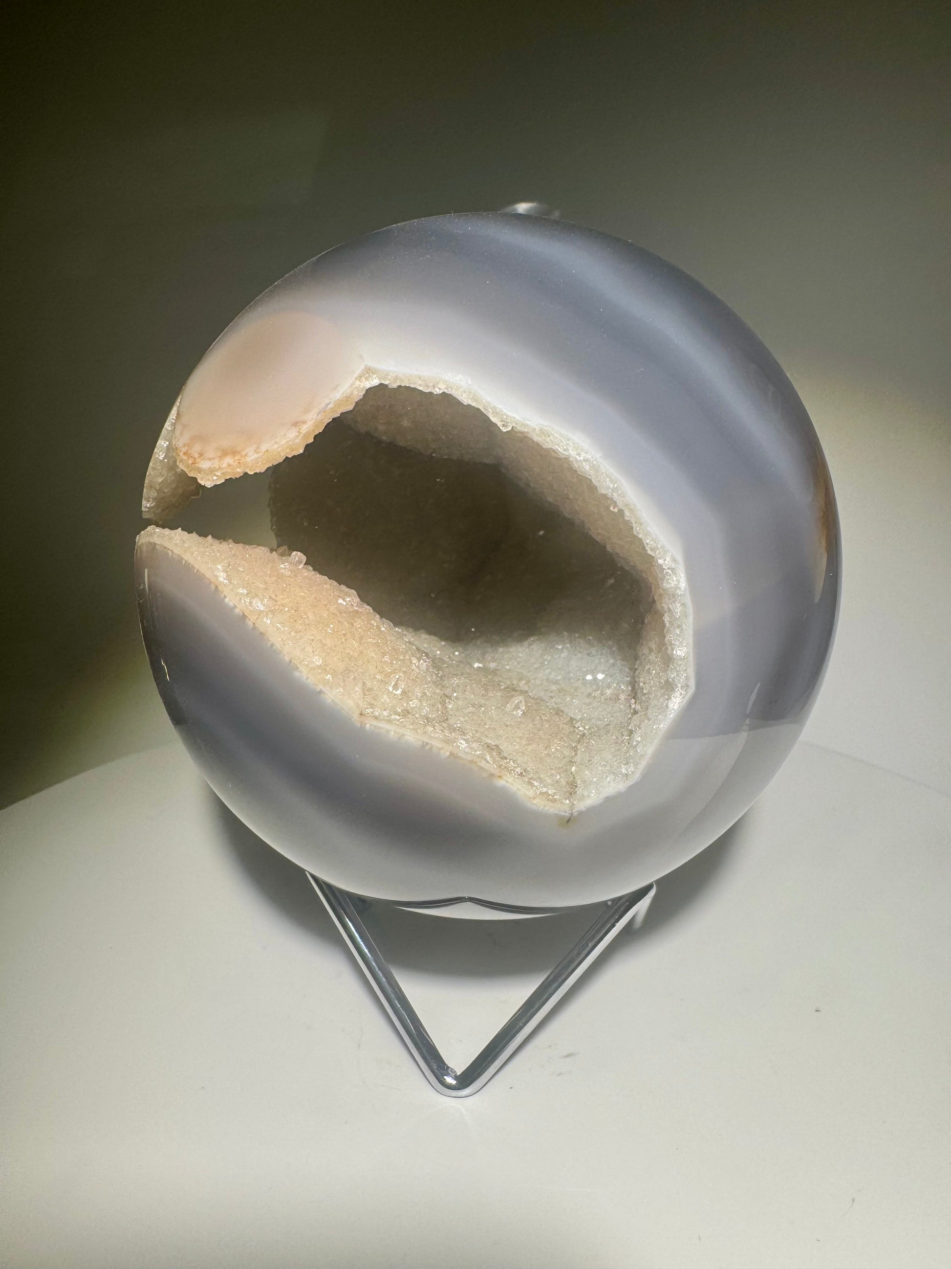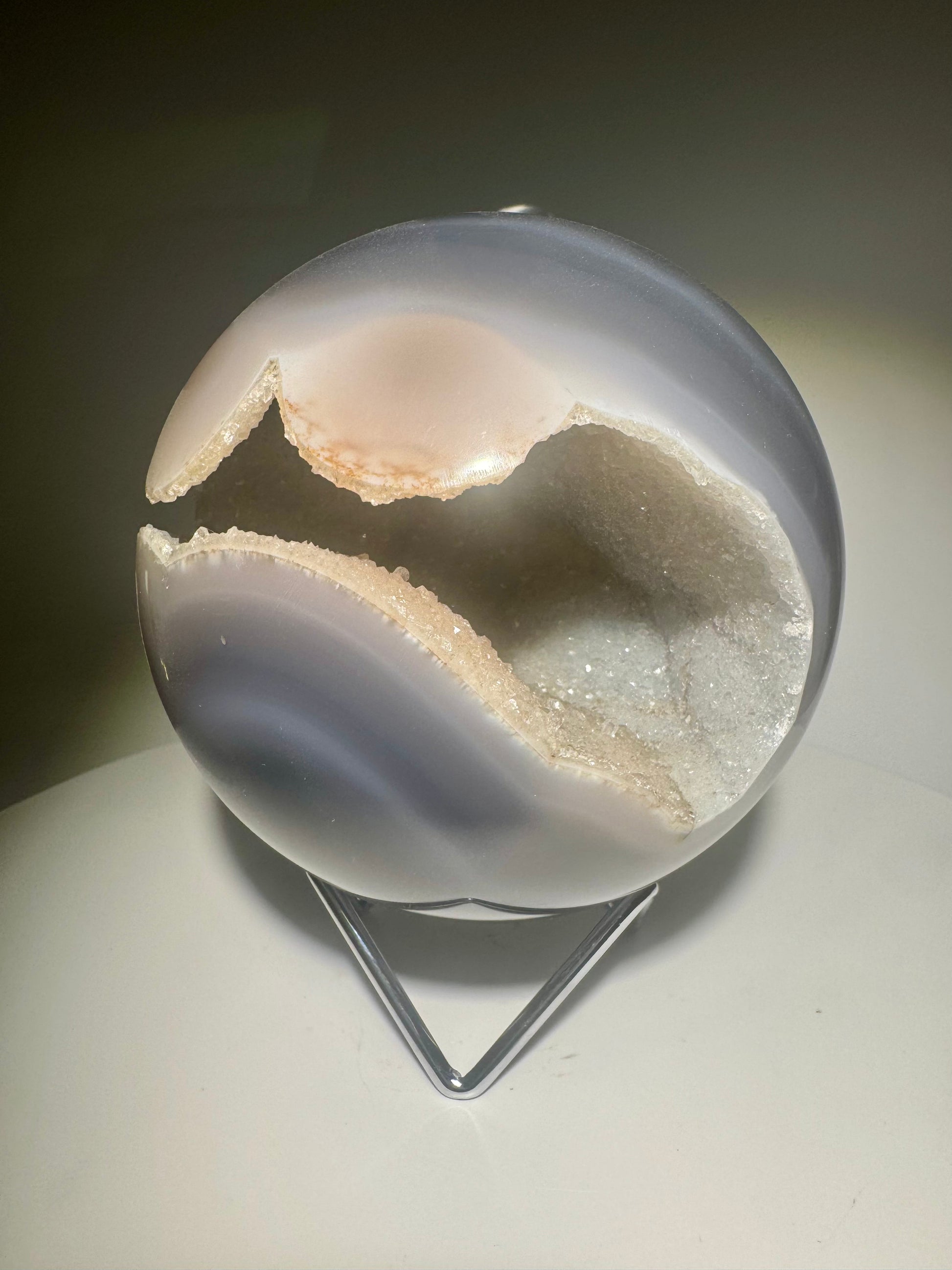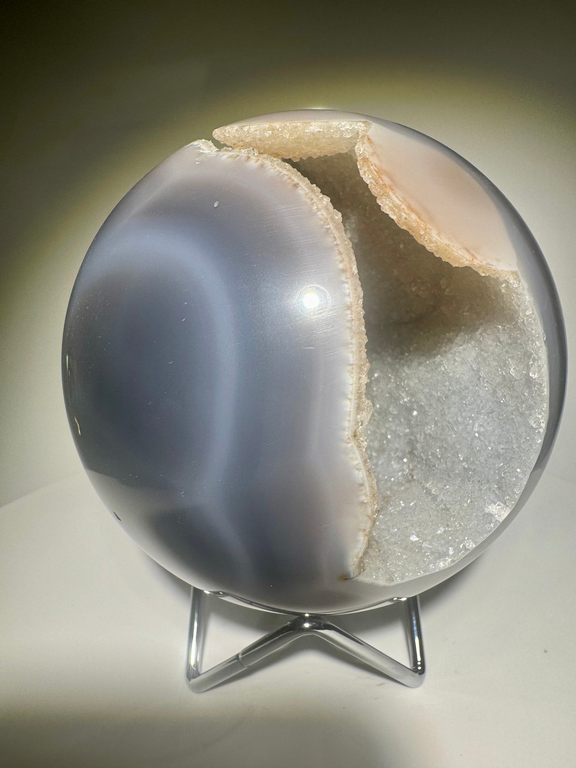 Diese atemberaubende Achat Kugel mit einem Durchmesser von 11.5 cm ist ein wahres Naturkunstwerk. Die tausenden Kristalle funkeln in einem wunderschönen goldenen Licht, wenn sie im Licht betrachtet werden. Das beeindruckende Achatbanding verleiht der Kugel eine einzigartige Struktur und macht sie zu einem zeitlosen Stück, das seinen Wert über die Jahre hinweg behält. Diese Kugel wurde von Hand geschliffen und von mir persönlich vor Ort in Brasilien ausgewählt, um höchste Qualität zu gewährleisten.