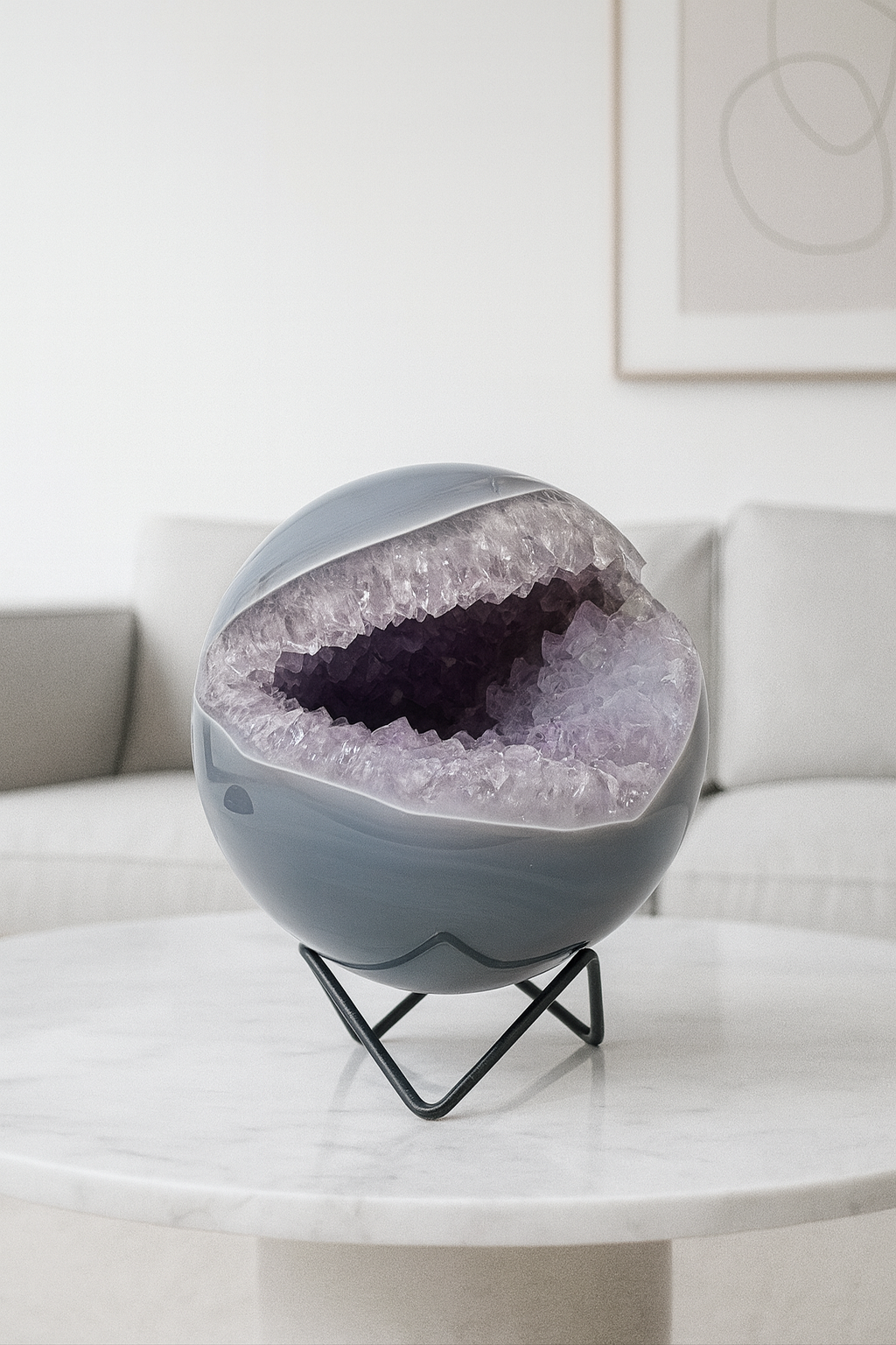 Diese aussergewöhnliche Achat-Kugel aus Brasilien besticht durch ihre intensive violette Farbe, eine harmonisch ausgeprägte Kristallstruktur im Inneren und eine perfekt von Hand geschliffene Kugelform. Mit einem Durchmesser von 12,5 cm und einem Gewicht von 2,99 kg ist sie nicht nur optisch ein Blickfang, sondern auch energetisch ein echtes Kraftobjekt. 💫