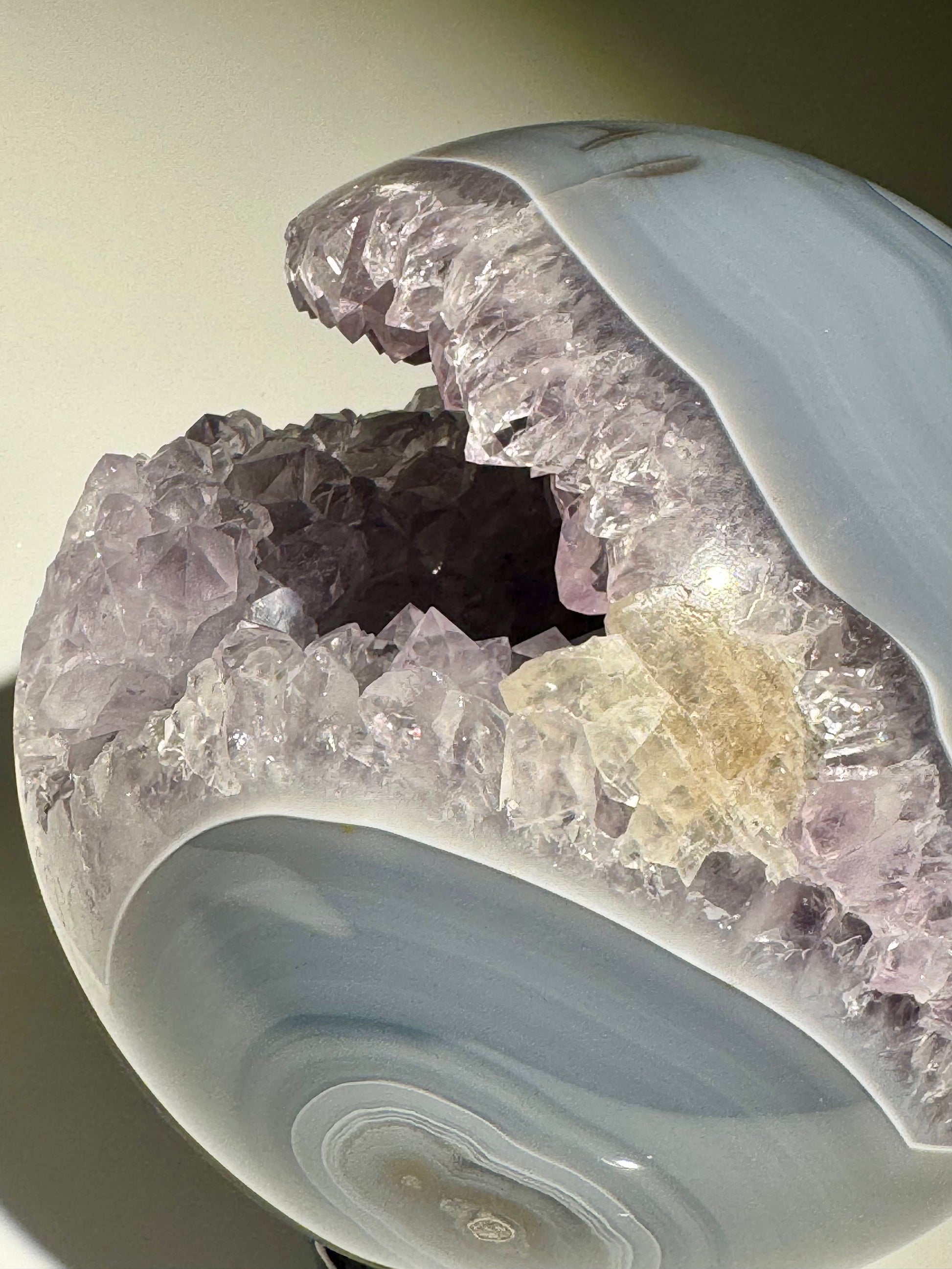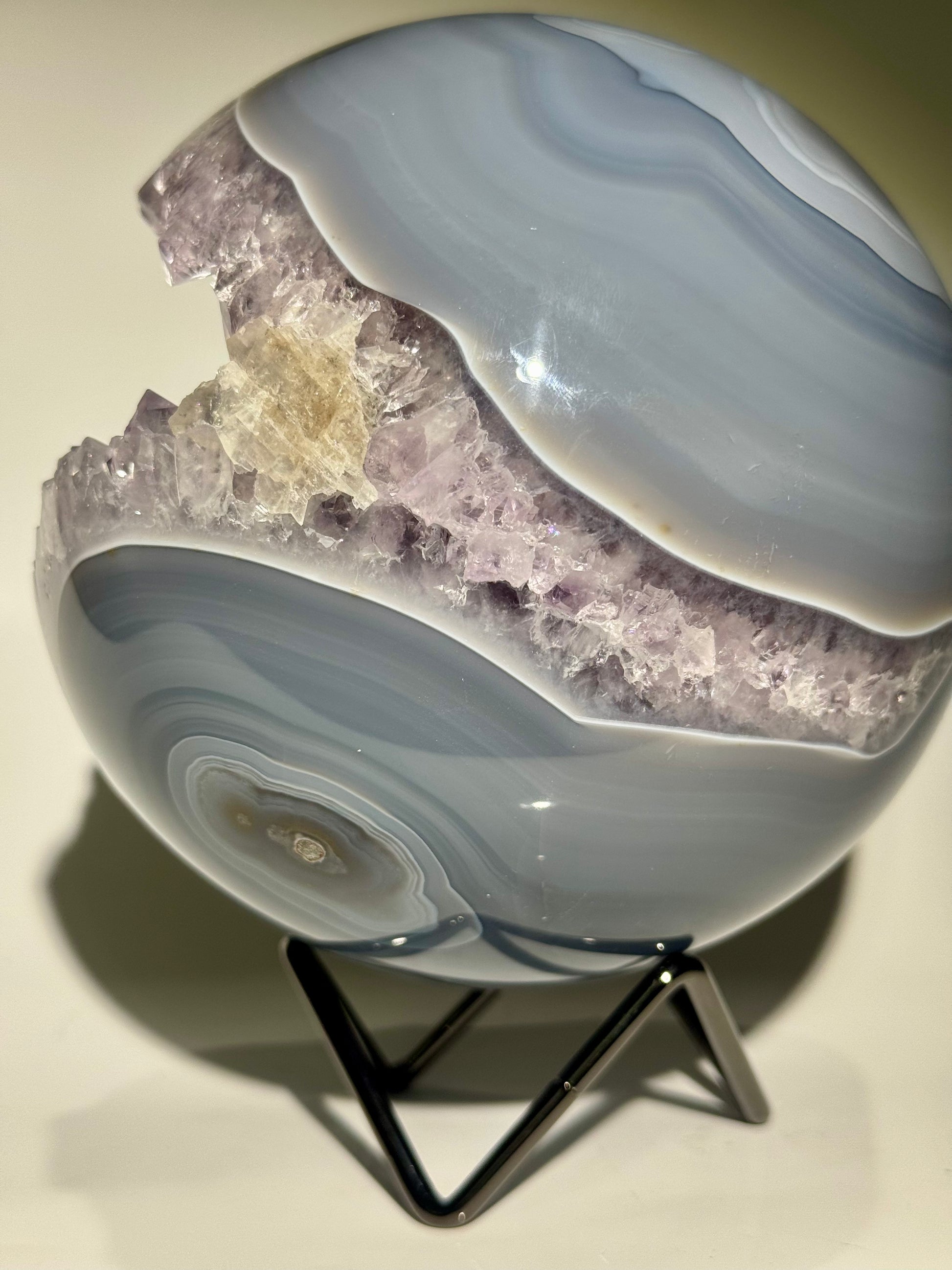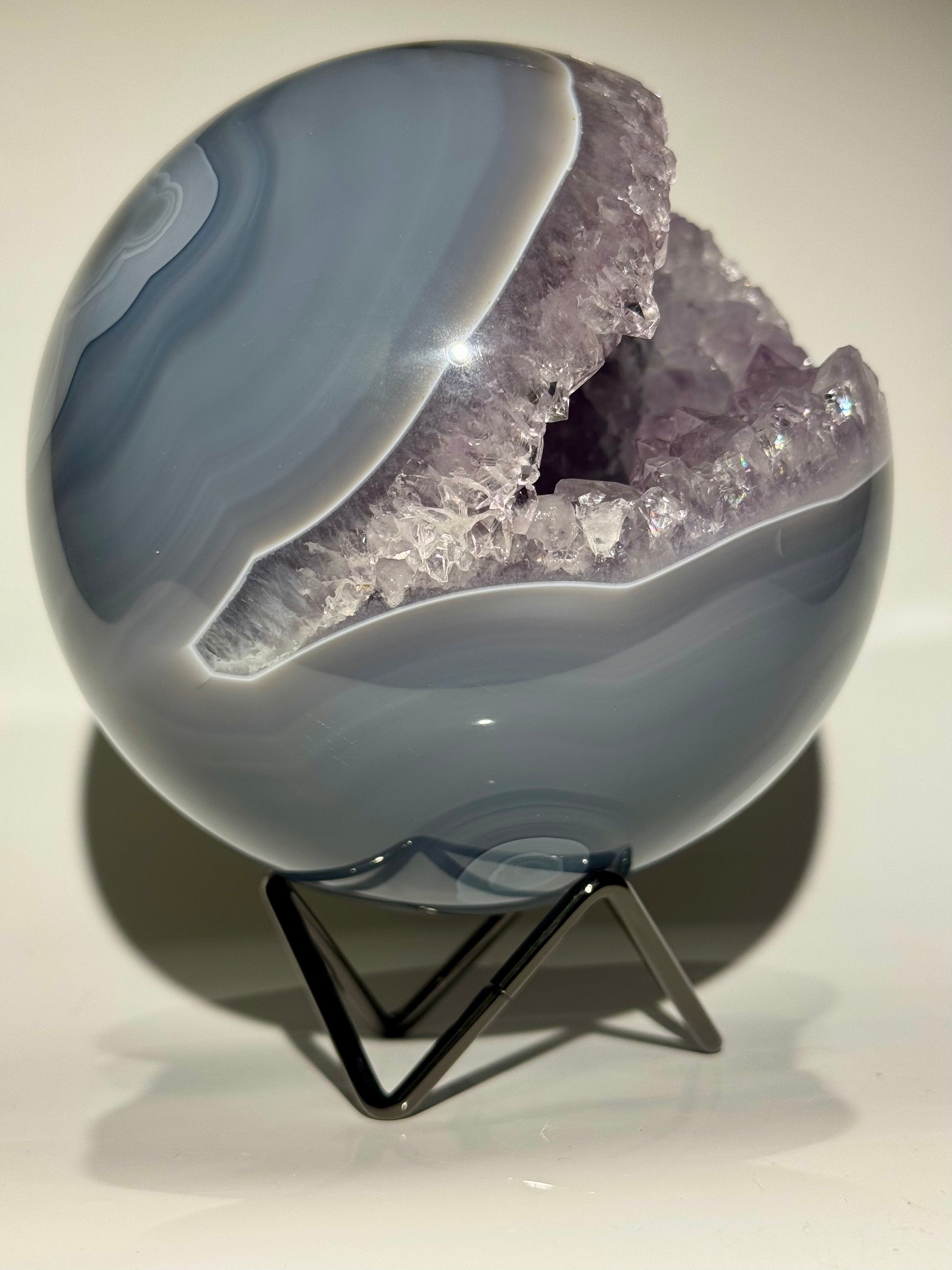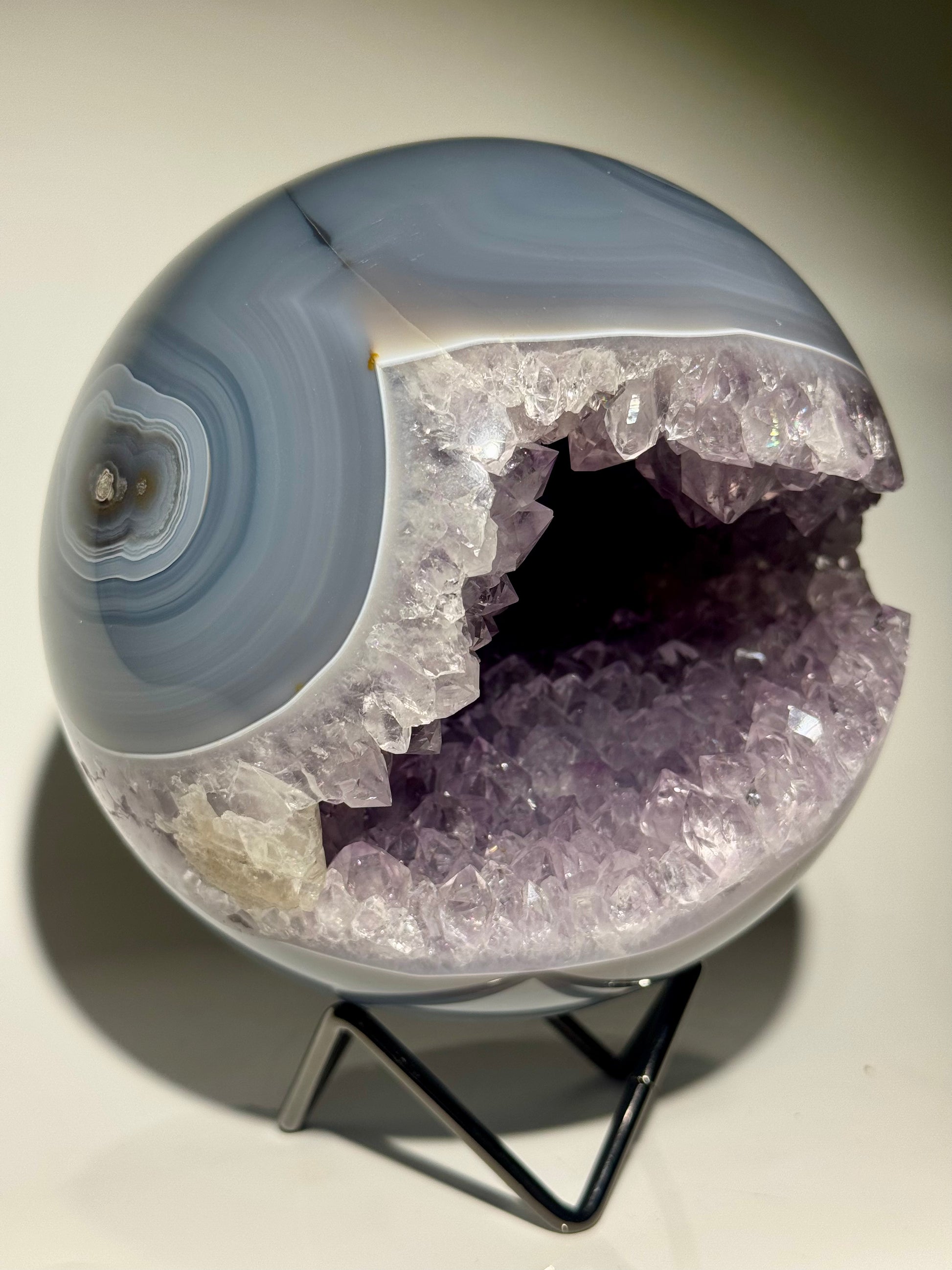 Keine Defekte. Keine Füllungen. Auch auf der Rückseite perfekt gearbeitet – so selten wie begehrenswert. Mit riesigen, makellosen Kristallen im Inneren und elegantem Achat-Banding ist diese Qualität in dieser Grösse und Perfektion äusserst schwer zu finden.