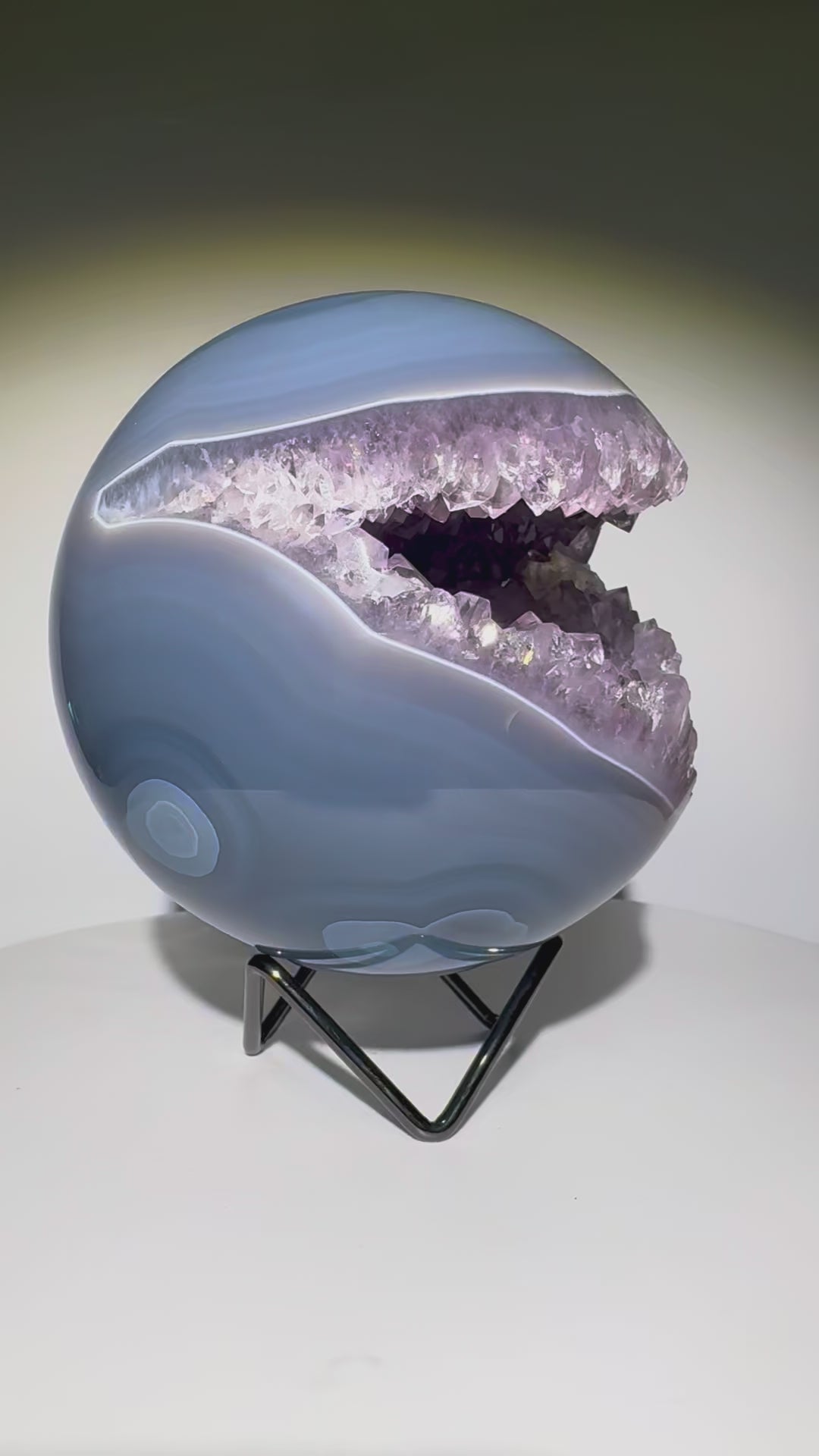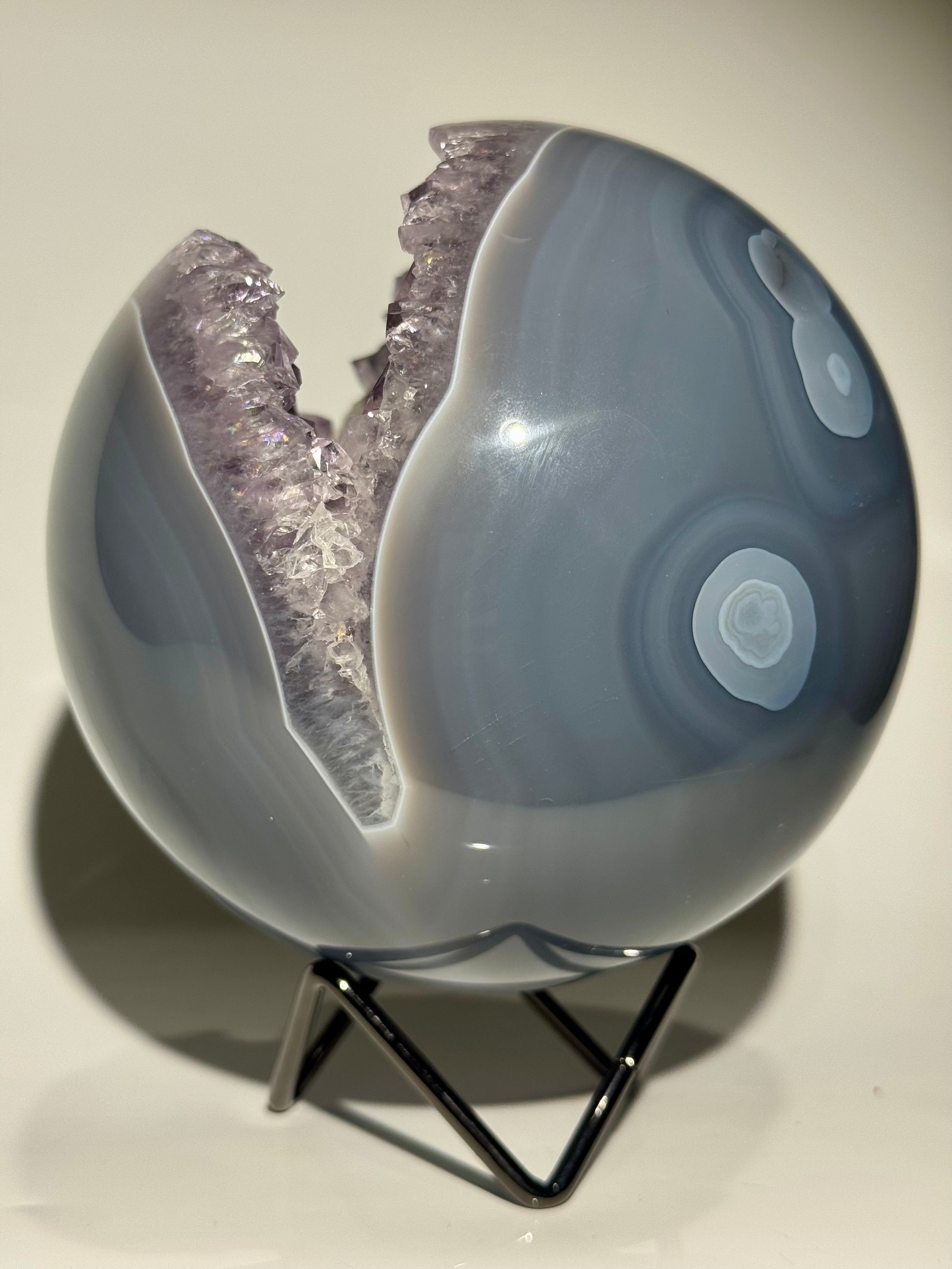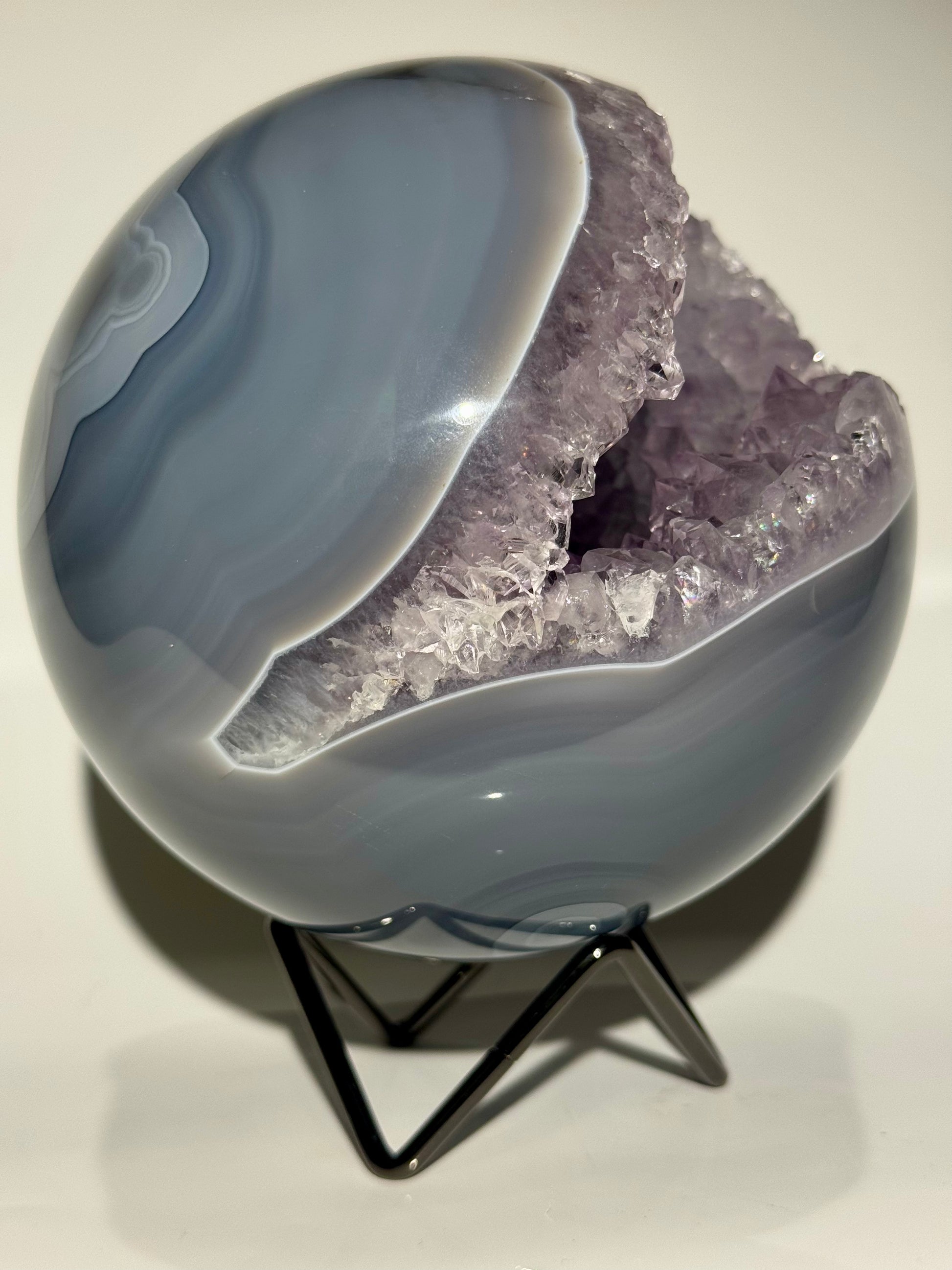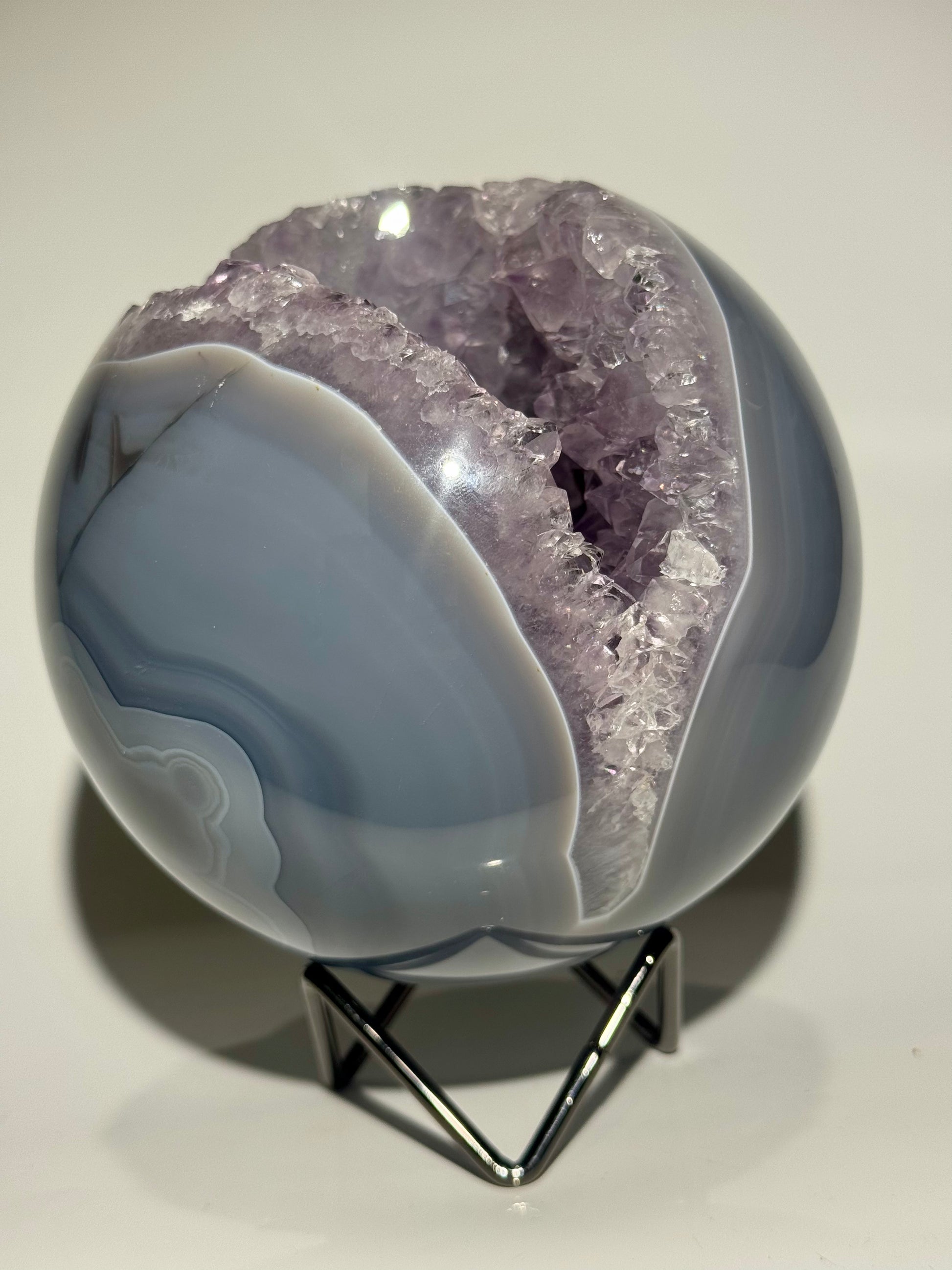 Keine Defekte. Keine Füllungen. Auch auf der Rückseite perfekt gearbeitet – so selten wie begehrenswert. Mit riesigen, makellosen Kristallen im Inneren und elegantem Achat-Banding ist diese Qualität in dieser Grösse und Perfektion äusserst schwer zu finden.