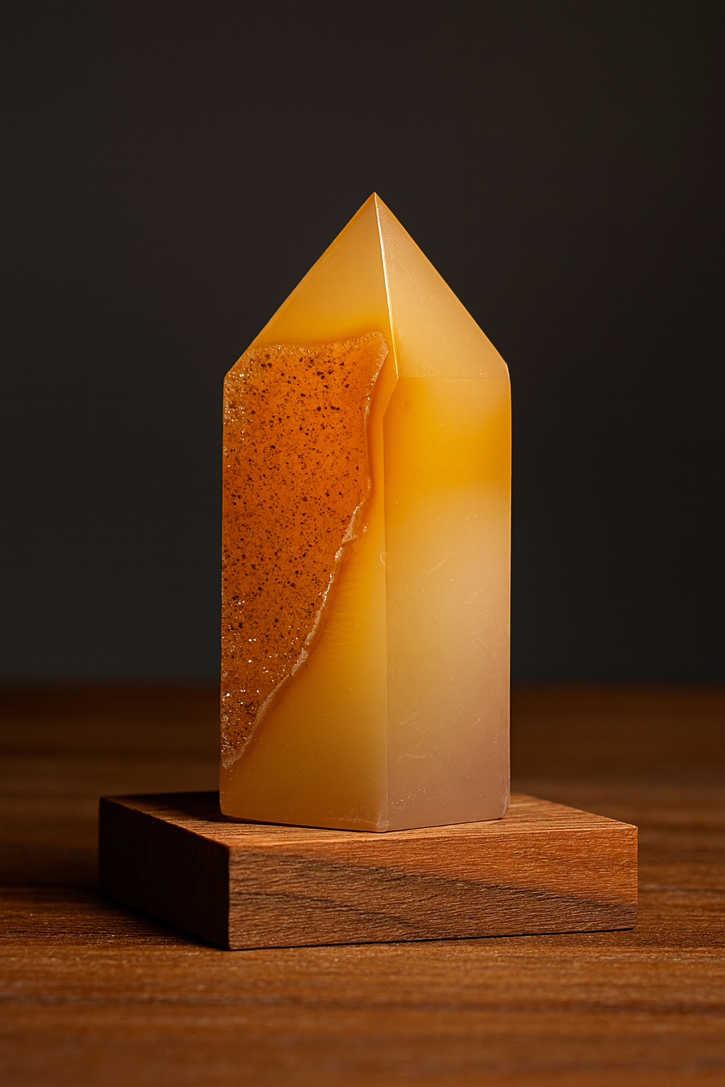 Ihr sanftes Farbspiel aus Honig-Orange und erdigem Braun verleiht ihr Tiefe und Charakter. Jedes Detail erzählt die Geschichte von Millionen Jahren, in denen sich feine Quarzschichten in vulkanischen Hohlräumen abgelagert haben. So entsteht der Achat – Schicht für Schicht – als Sinnbild für Geduld, Stärke und Schönheit der Natur.