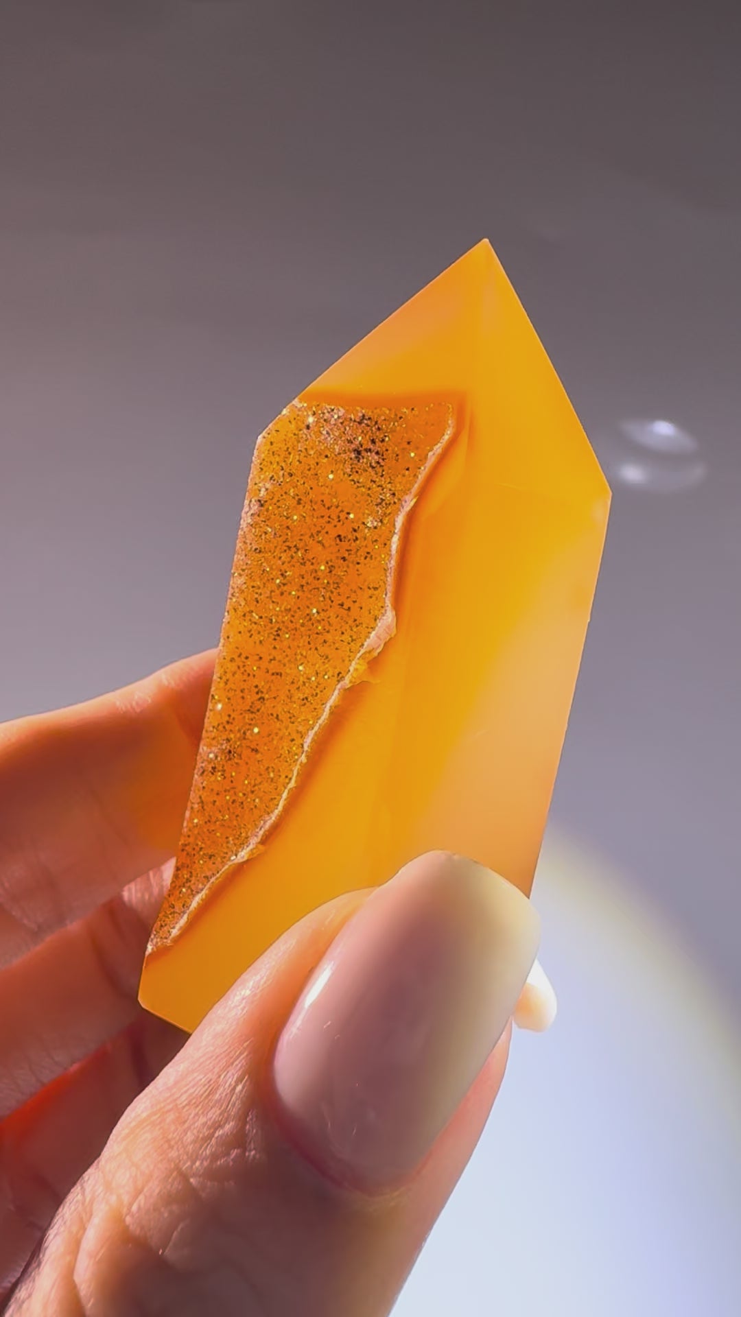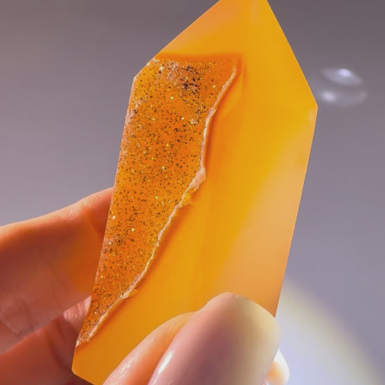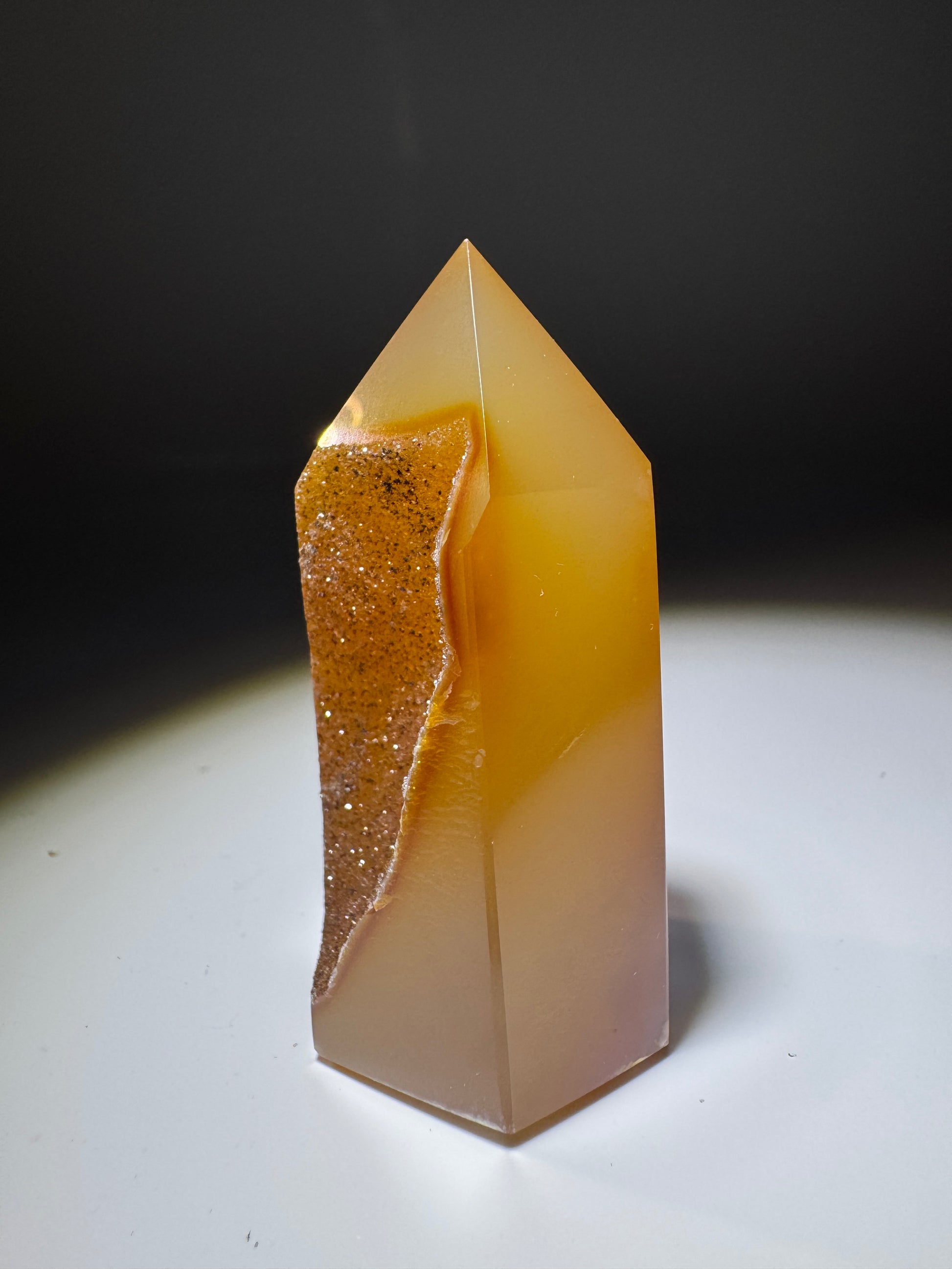 Diese süsse orangebraune Achat-Spitze ist ein wahres Glanzstück der Natur 🍯✨ – überzogen mit hunderten funkelnden, klaren Kristallen, die im Licht magisch schimmern. Mit einer Höhe von 5,7 cm strahlt sie Wärme, Geborgenheit und Eleganz aus.