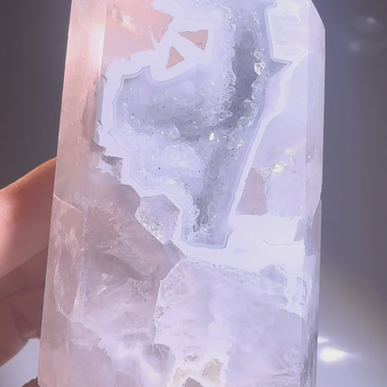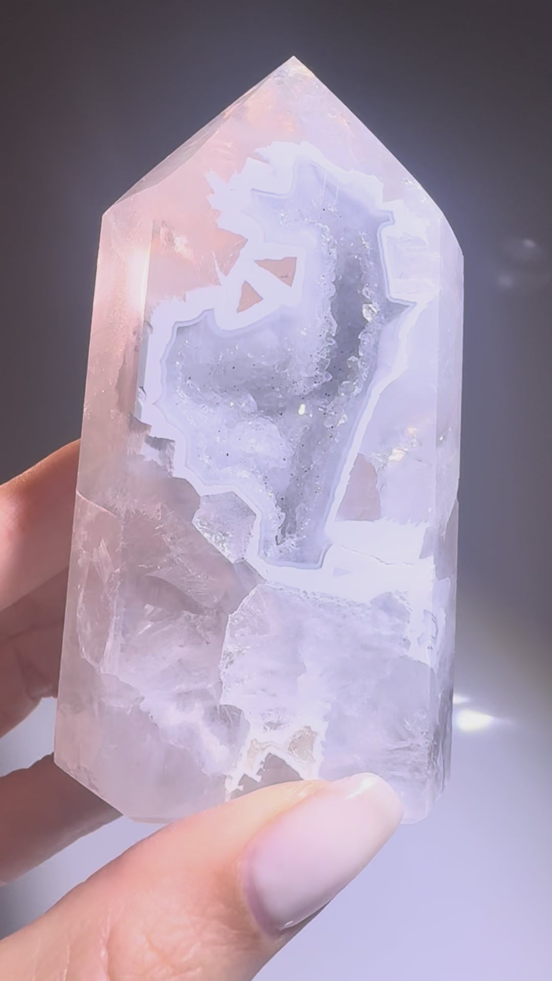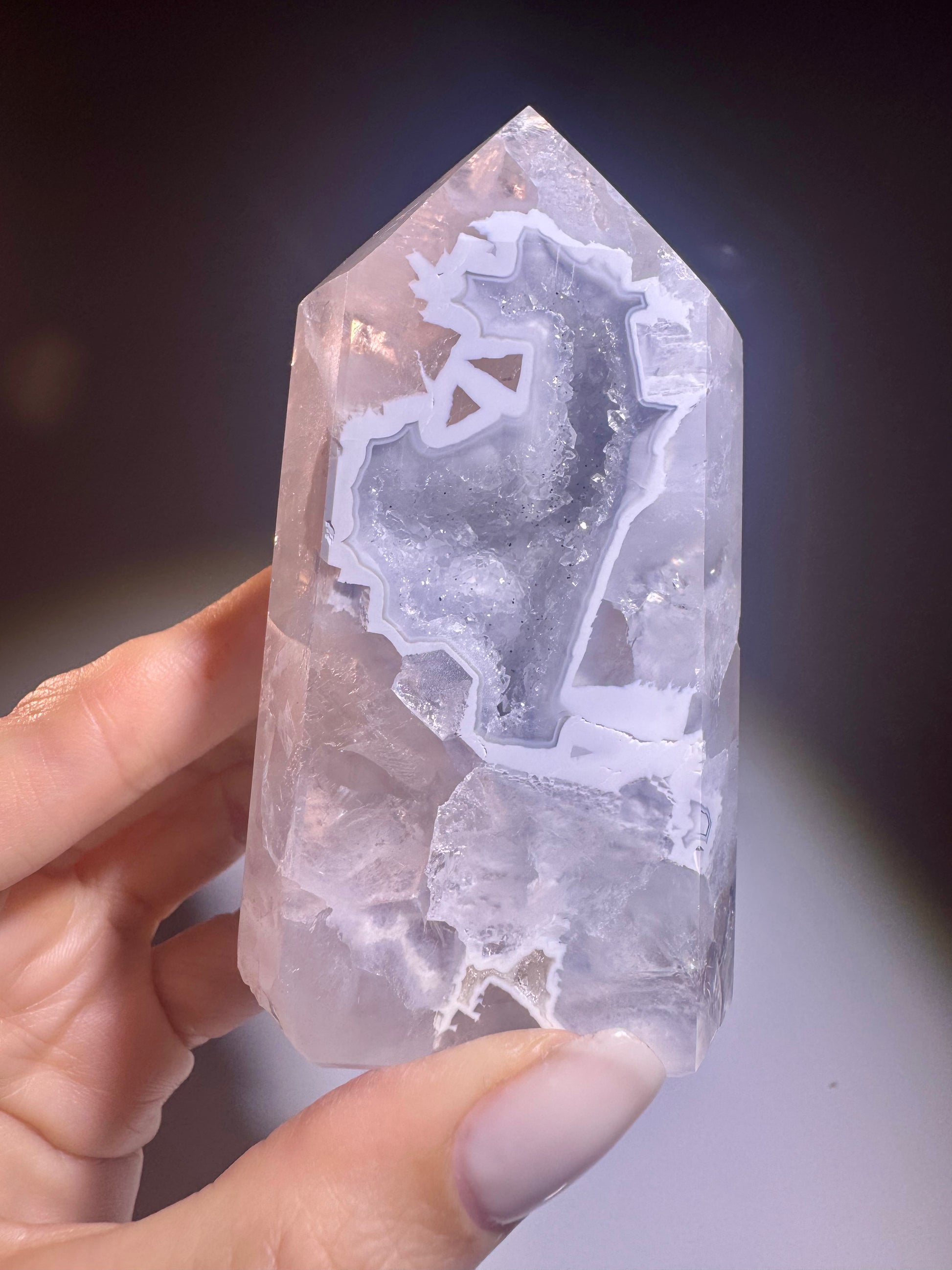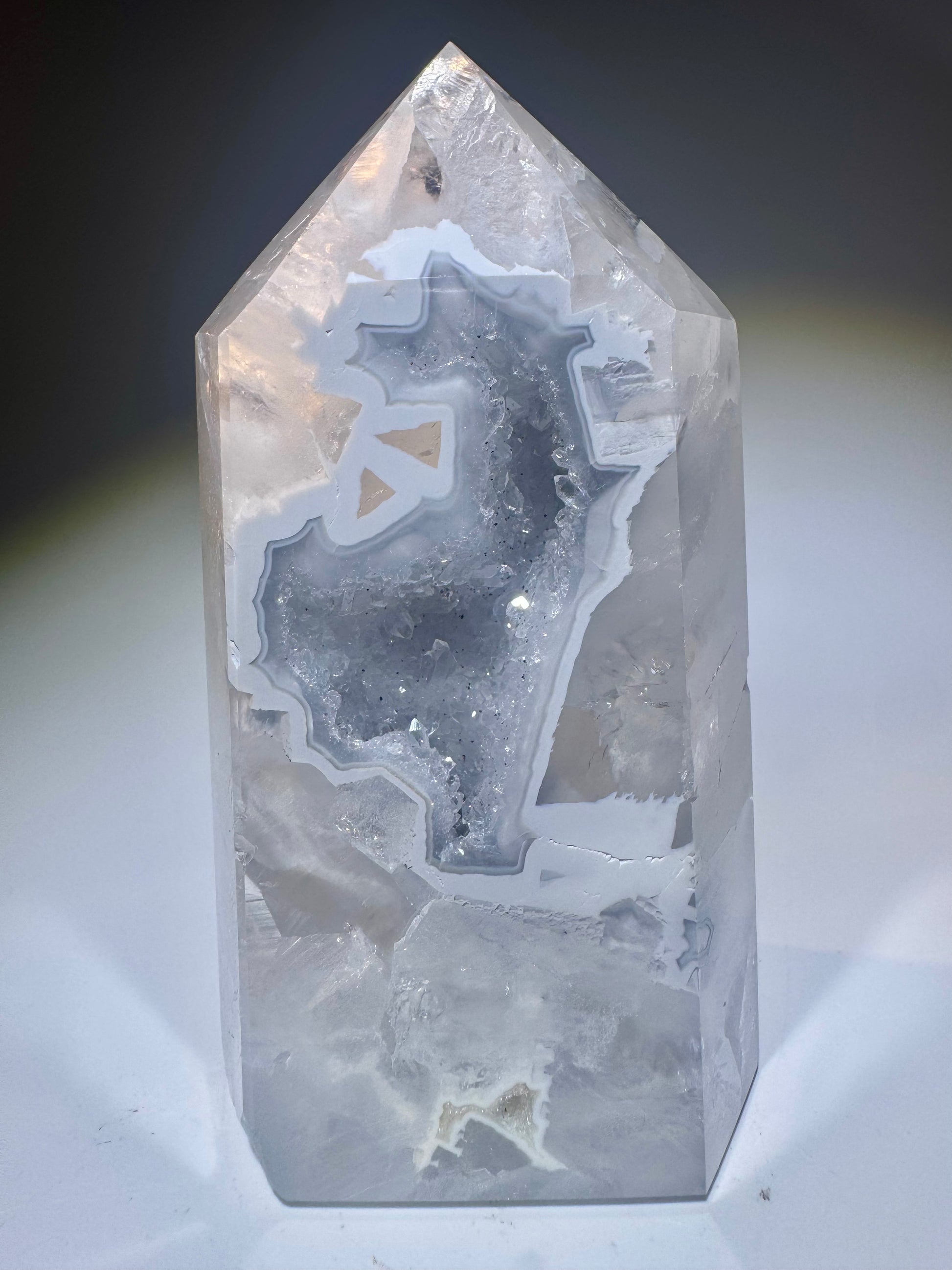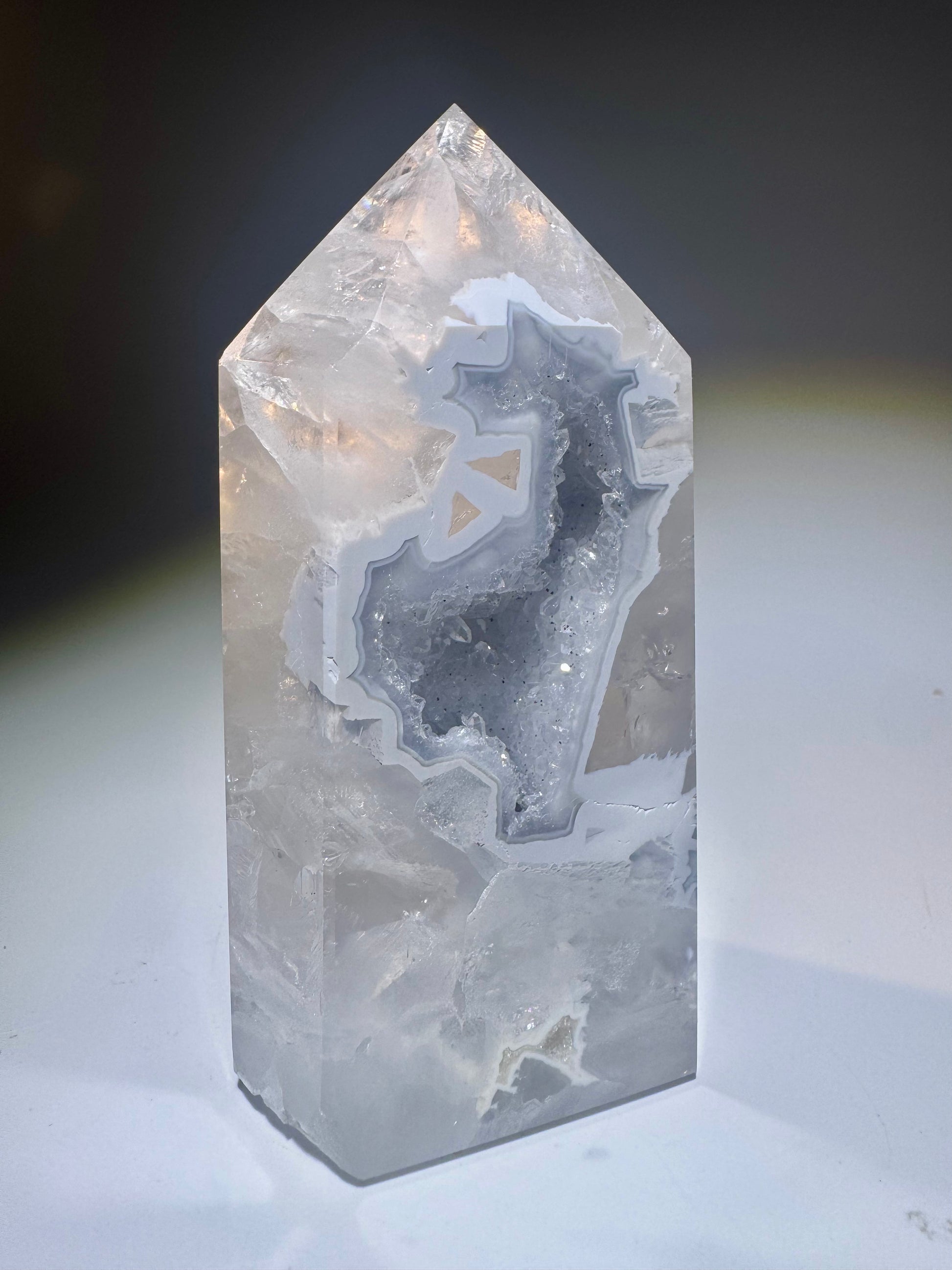 Diese super süsse Achat-Spitze 💎 aus Brasilien misst 9,5 cm und begeistert mit funkelnden Kristallen im Innern ✨ Die zarten hellblauen Schimmer verleihen dem Kristall ein magisches, ruhiges Strahlen – selbst die Rückseite ist wunderschön poliert und offenbart natürliche Strukturen und Farbverläufe.