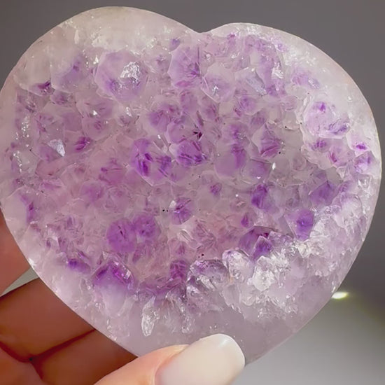 Dieses wunderschöne fliederfarbene Amethyst-Herz misst 9,5 cm und wiegt 296 g – ein absolutes Traumstück für Sammler und Liebhaber edler Kristalle. Die funkelnden Kristalle in sanftem Flieder faszinieren auf jeder Seite und lassen das Herz in einem einzigartigen Licht erstrahlen. Ein echtes Naturwunder aus der Tiefe der Erde.