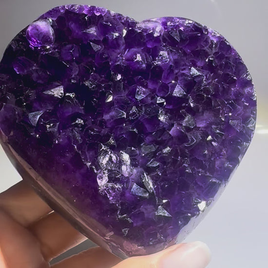 Ein absolutes Traumstück – dieses Premium Amethyst Herz aus Uruguay begeistert mit seinen glossy, funkelnden Kristallen in einem tiefen, leuchtenden Violett. Mit einer Grösse von 10,2 cm und einem Gewicht von 593 g ist es ein Unikat von aussergewöhnlicher Schönheit und seltener Qualität. Jede Facette reflektiert das Licht wie ein tanzender Stern, jedes Funkeln erzählt die Geschichte uralter Erdenergie. 💫
