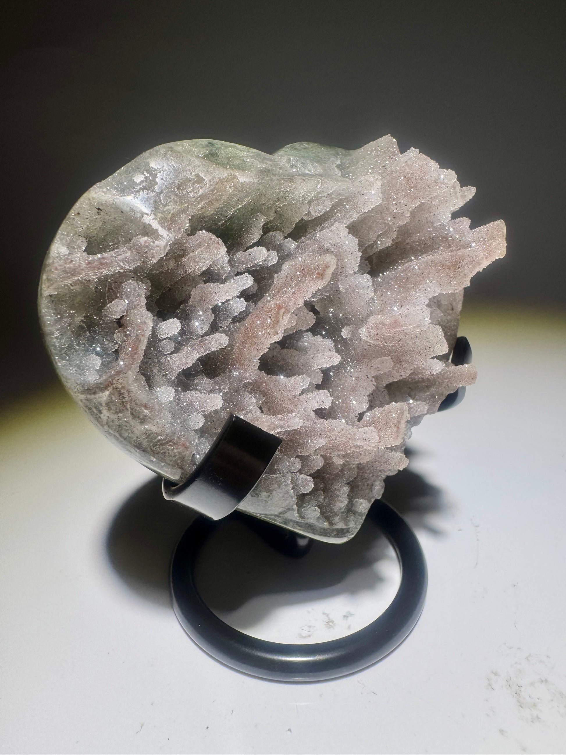 Amethyst mit Stalaktiten bildet sich über Millionen von Jahren in Hohlräumen von Vulkangestein 🌋 Tropfsteinähnliche Strukturen entstehen durch das langsame Absetzen von mineralhaltigem Wasser, das Schicht für Schicht die stalaktitischen Formen wachsen lässt 💧 Mit der Zeit kristallisieren sich Amethyst-Quarze um die Stalaktiten herum und schaffen ein faszinierendes Farb- und Formenspiel ✨