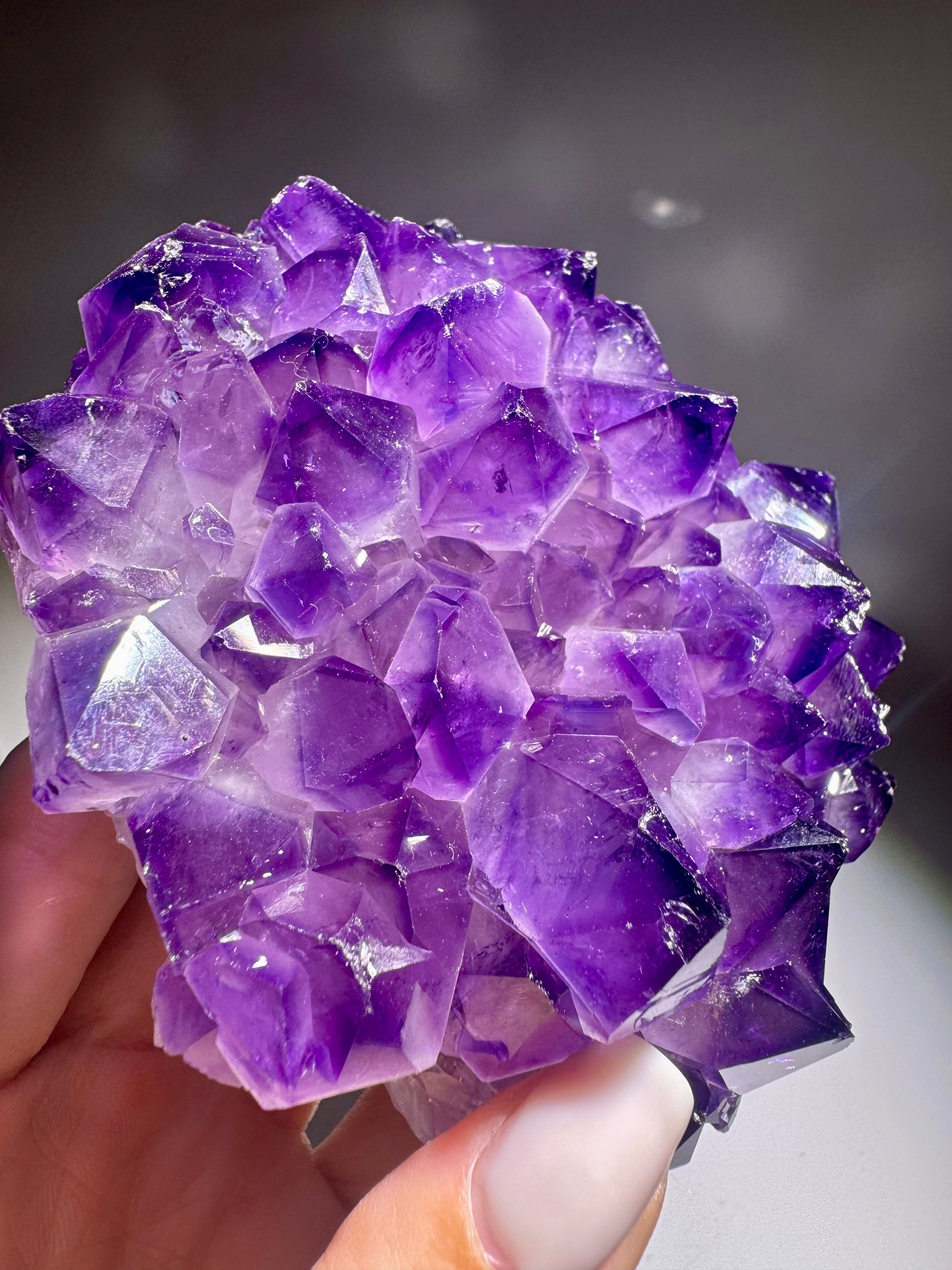 Ein absolutes Traumstück: Diese hochwertige Amethyststufe aus Uruguay beeindruckt mit einem Durchmesser von 12,3 cm und einem Gewicht von 774 g. Die Kristalle zeigen ein intensives, tiefviolettes Farbspiel – die seltenste und begehrteste Nuance des Amethysts. Jede Spitze funkelt klar, rein und mit lebendigem Lichtreflex, der das gesamte Stück zum Leuchten bringt. ✨