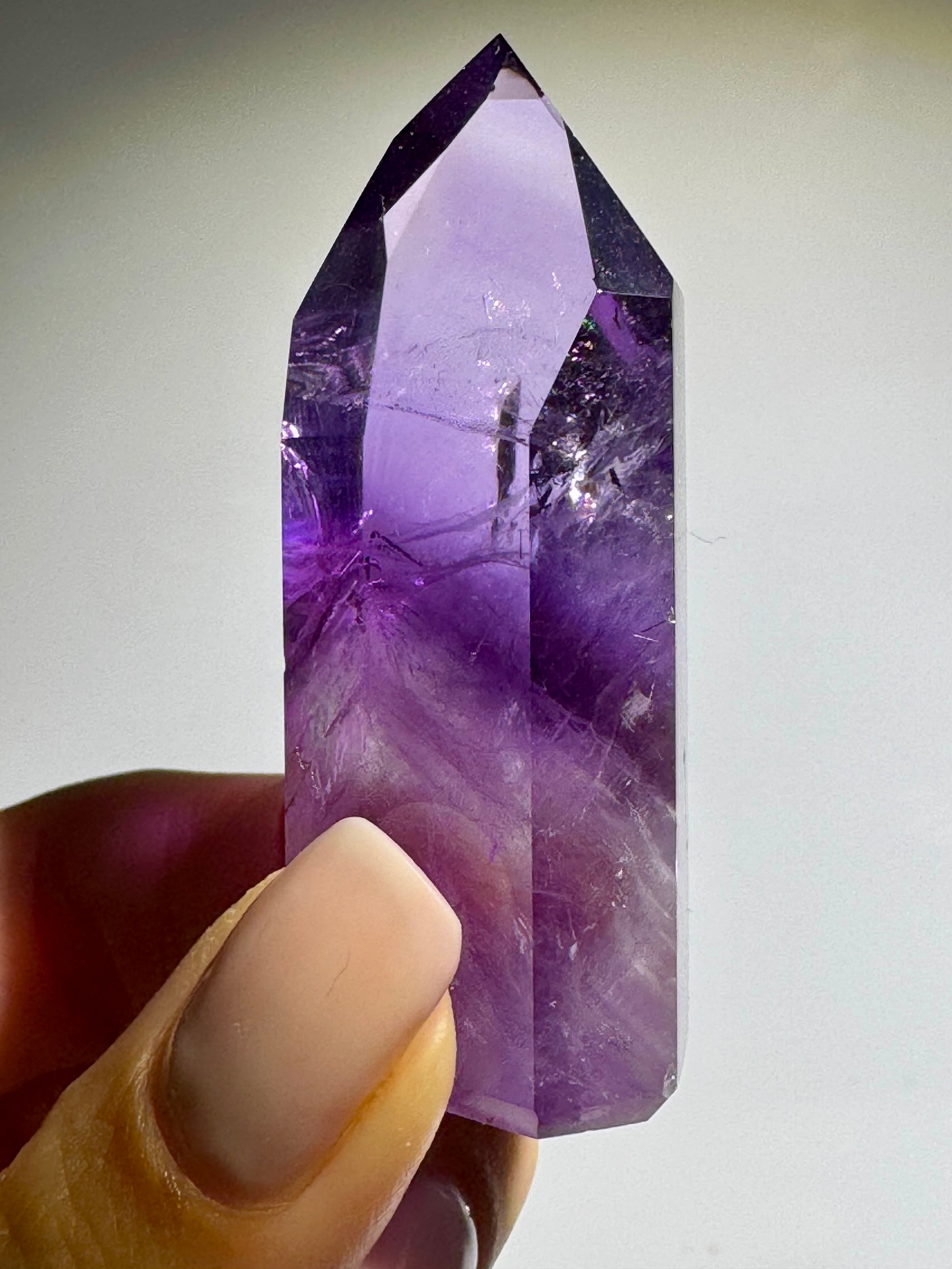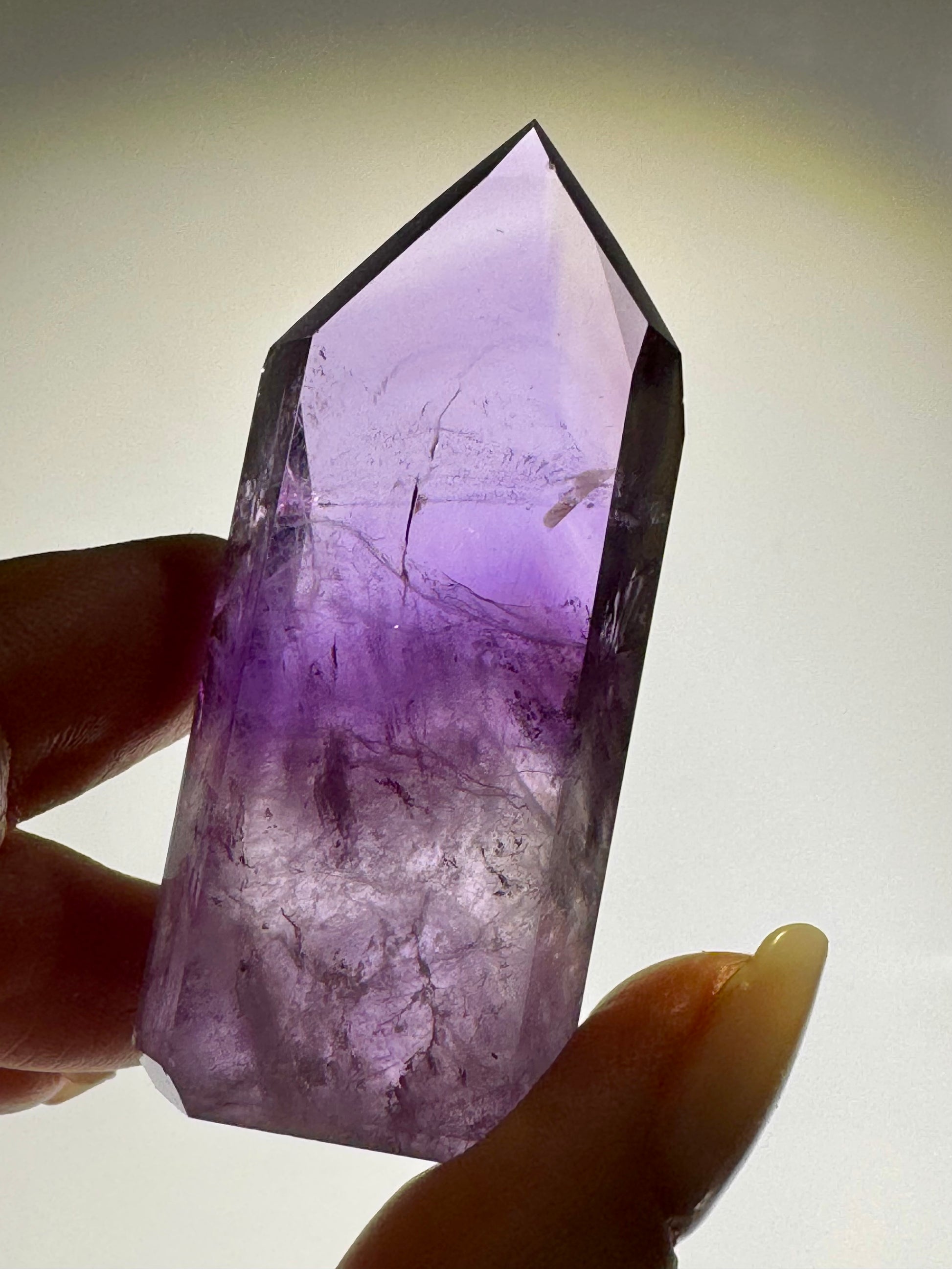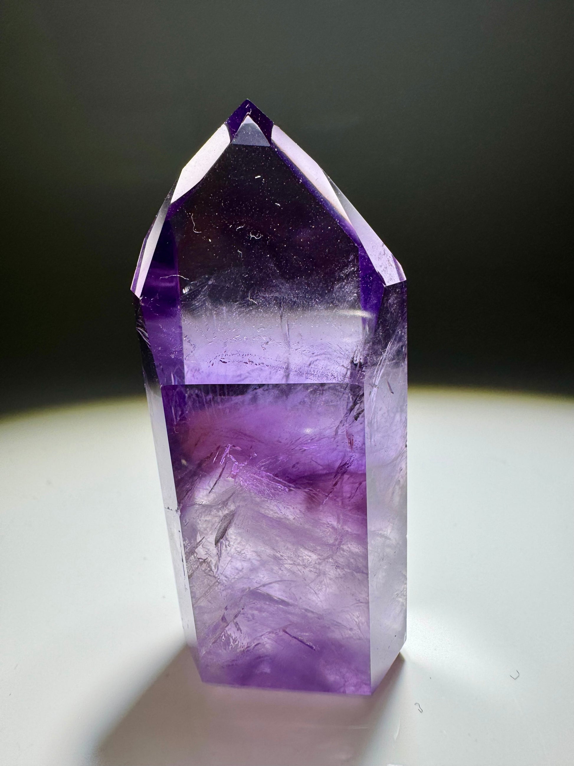Diese 5.6 cm grosse Spitze aus Brasilien ist ein einzigartiges Naturwunder. Sie vereint die kühle Eleganz des Amethysts mit der sonnigen Energie des Citrins. Mit ihrer aussergewöhnlichen Klarheit, den zarten Farbverläufen und feinen Phantomstrukturen wirkt sie wie ein lebendiges Kunstwerk der Natur ✨💎.