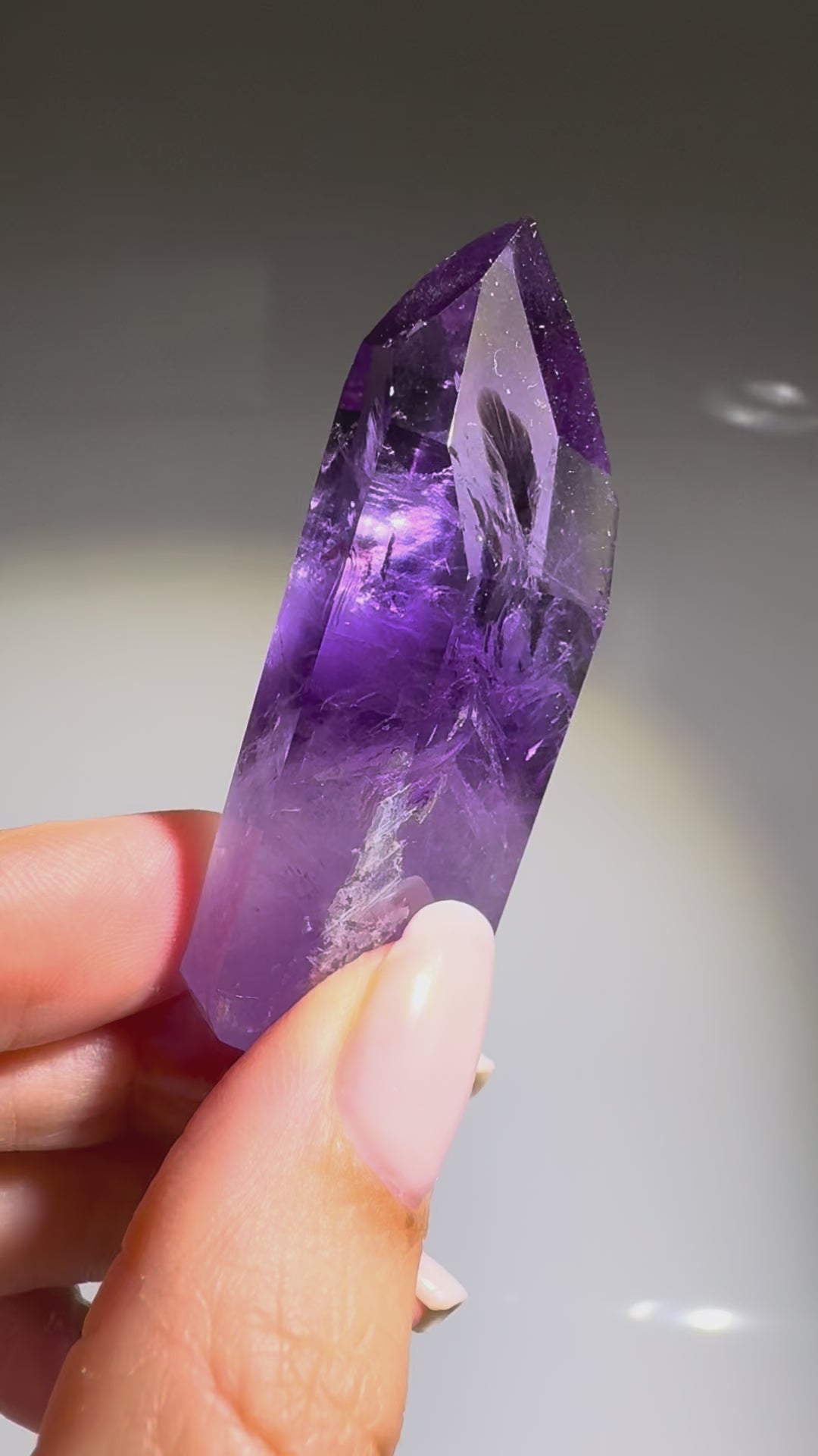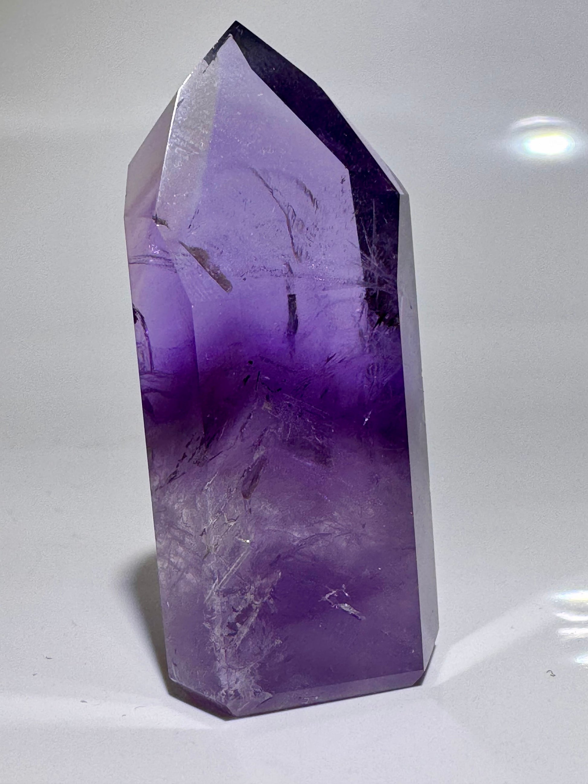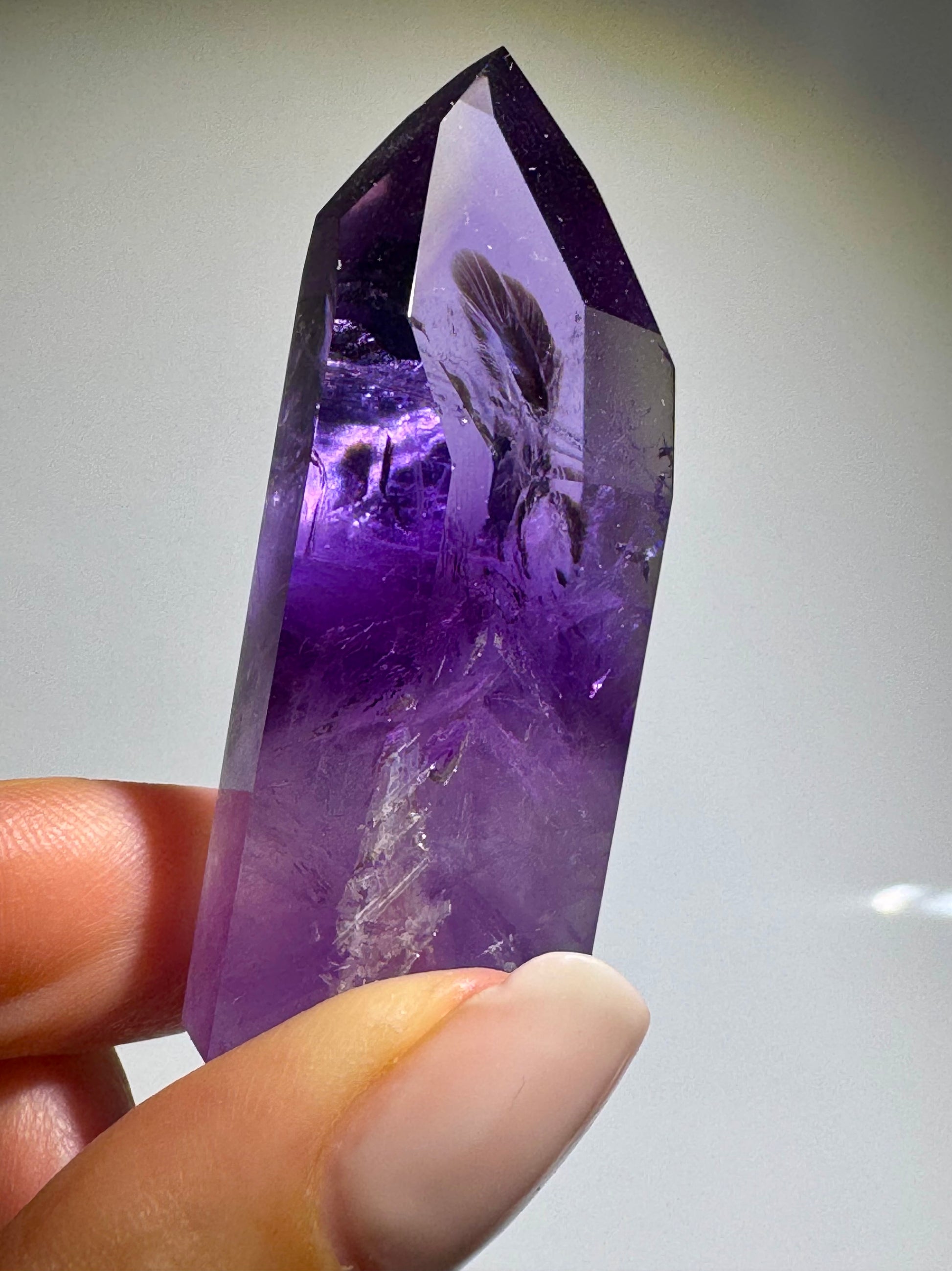Diese 5.6 cm grosse Spitze aus Brasilien ist ein einzigartiges Naturwunder. Sie vereint die kühle Eleganz des Amethysts mit der sonnigen Energie des Citrins. Mit ihrer aussergewöhnlichen Klarheit, den zarten Farbverläufen und feinen Phantomstrukturen wirkt sie wie ein lebendiges Kunstwerk der Natur ✨💎.