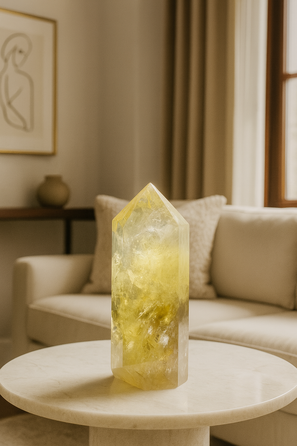 Entstehung: Citrin ist eine Varietät des Quarzes, die durch natürliche Erhitzung von Amethyst oder Rauchquarz in der Erdkruste entsteht. Die gelbe Farbe wird durch Eisenverunreinigungen im Kristallgitter verursacht. Phantomkristalle entstehen durch Unterbrechungen im Wachstumsprozess, bei denen sich Schichten anderer Mineralien ablagern, bevor das Wachstum des Citrins fortgesetzt wird. Diese Geisterbilder früherer Wachstumsphasen verleihen dem Phantom Citrin seine einzigartige und faszinierende Struktur.
