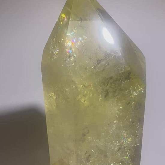 Dieses aussergewöhnliche Stück besticht durch seine leuchtend gelbe Farbe und die beeindruckenden Phantomschichten, die im Inneren sichtbar sind. Ebenfalls mit faszinierenen Regenbogen. Citrin ein wahrhaft seltenes und wertvolles Juwel für Sammler und Liebhaber.