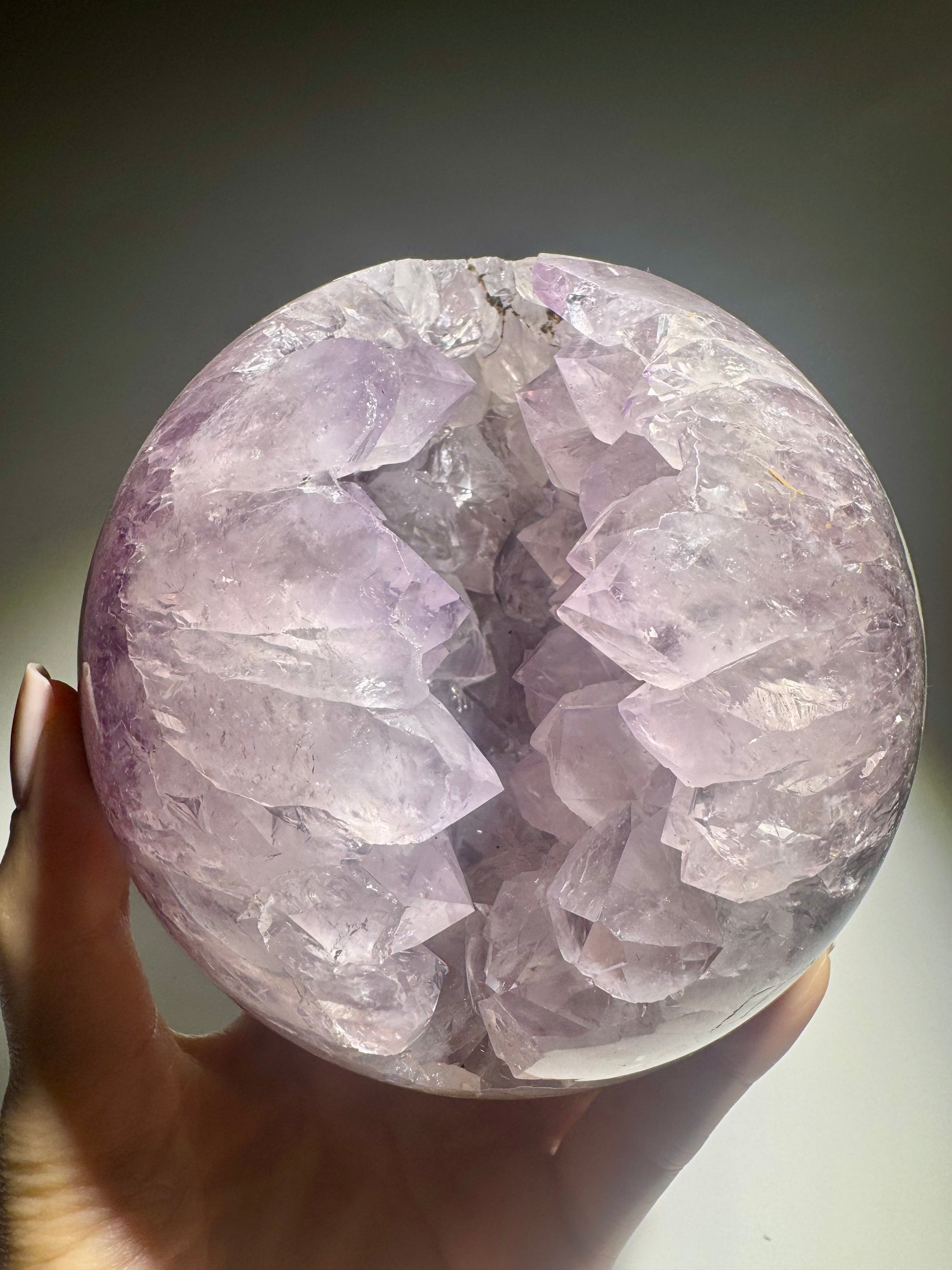 Wunderschöne Amethyst Kugel aus Brasilien – mit einem Durchmesser von 11 cm und einem Gewicht von 1.97 kg. Diese Kugel ist ein echtes Meisterwerk der Natur! Eine solch perfekte Kugel zu finden, ist äusserst selten, insbesondere mit den großen, intakten Kristallen, die sie zieren.