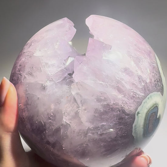 Dieses beeindruckende Stück besticht durch seine wunderschöne Farbe und die grosse Öffnung, die von grossen, funkelnden Kristallen umgeben ist. Die Rückseite der Kugel ist ebenso makellos, was sie zu einem wahren Juwel in jeder Sammlung macht.
