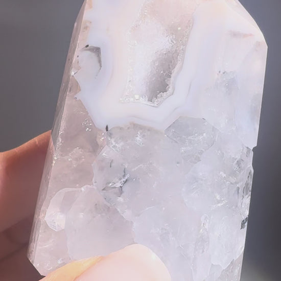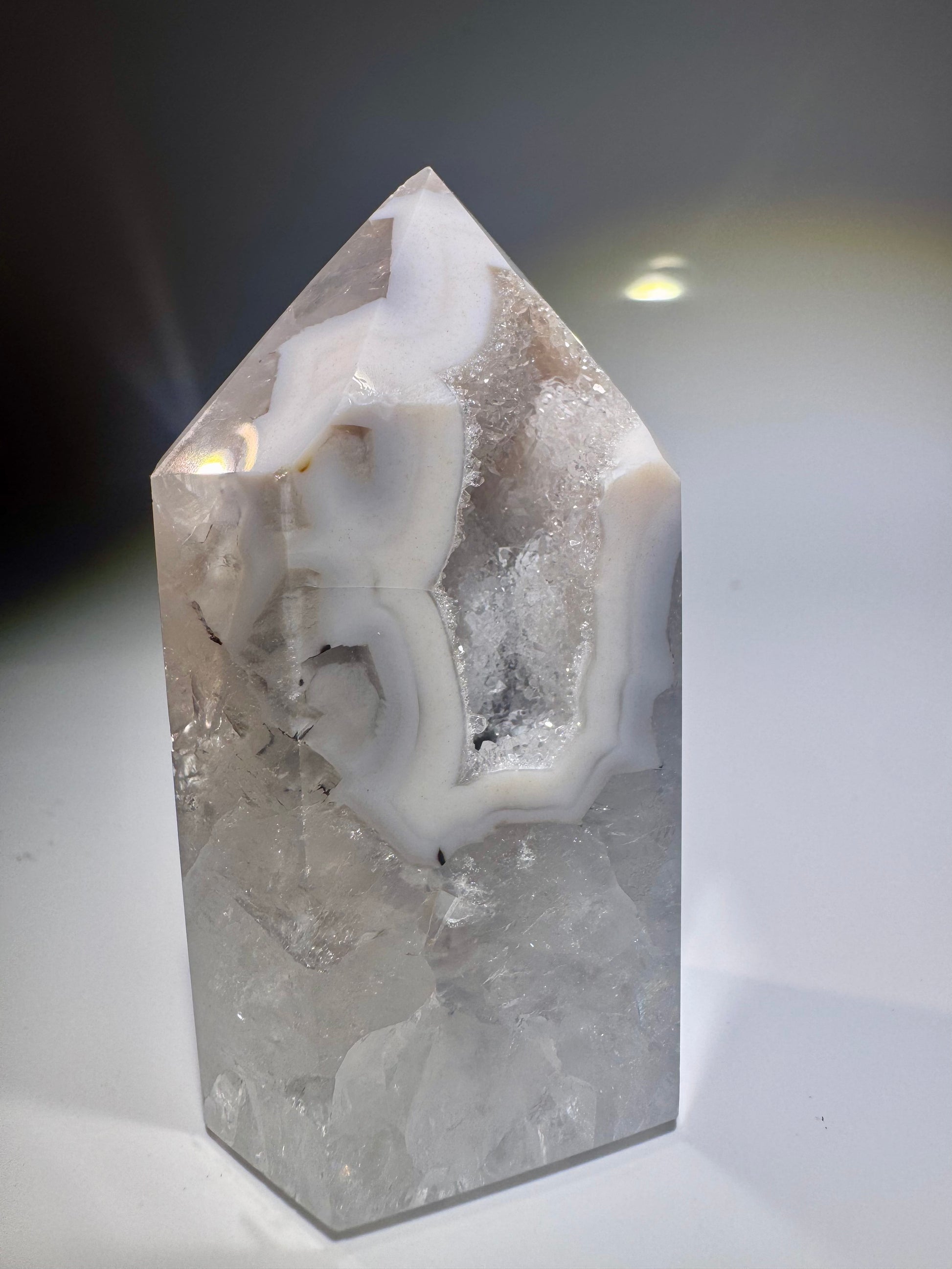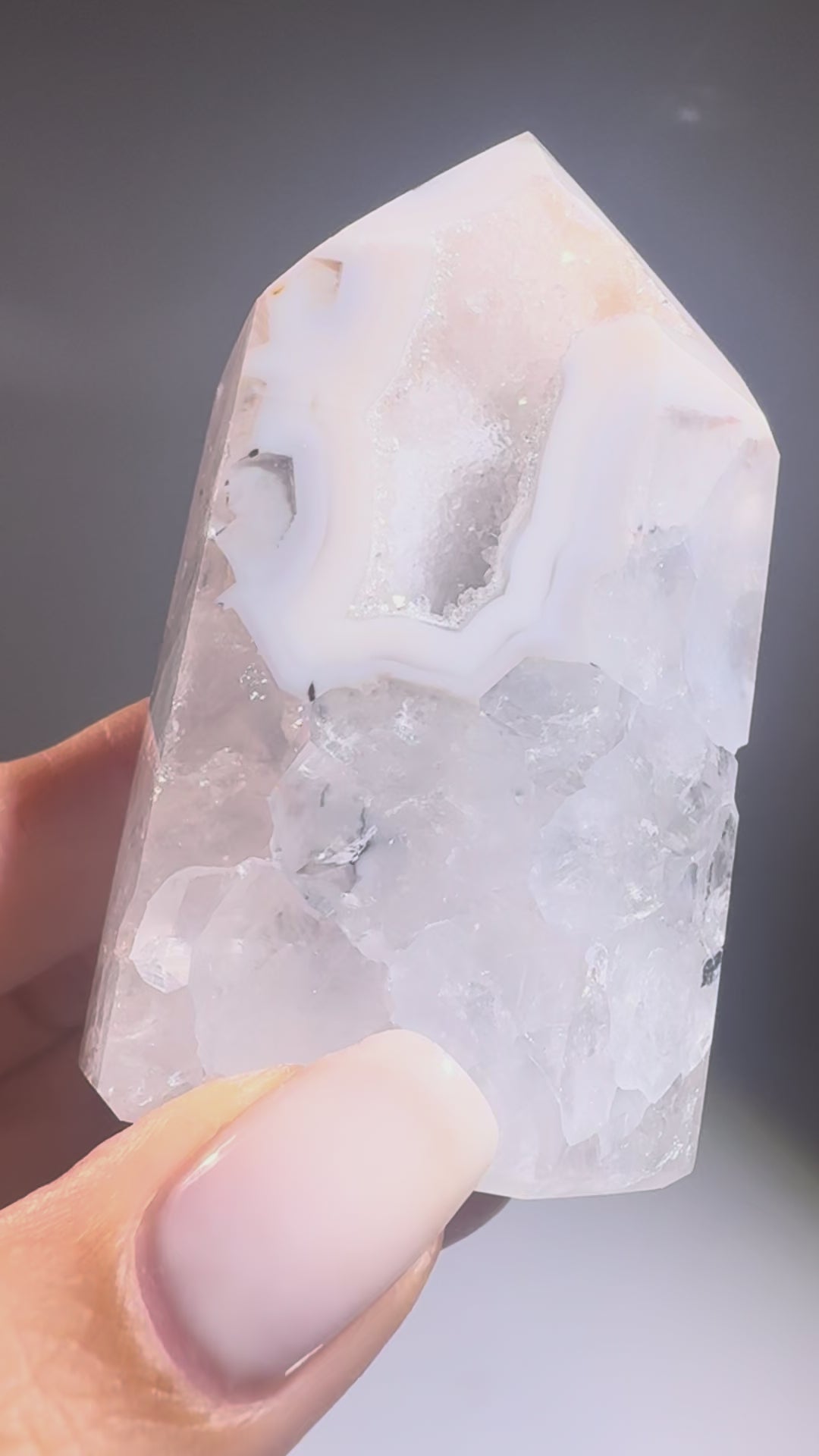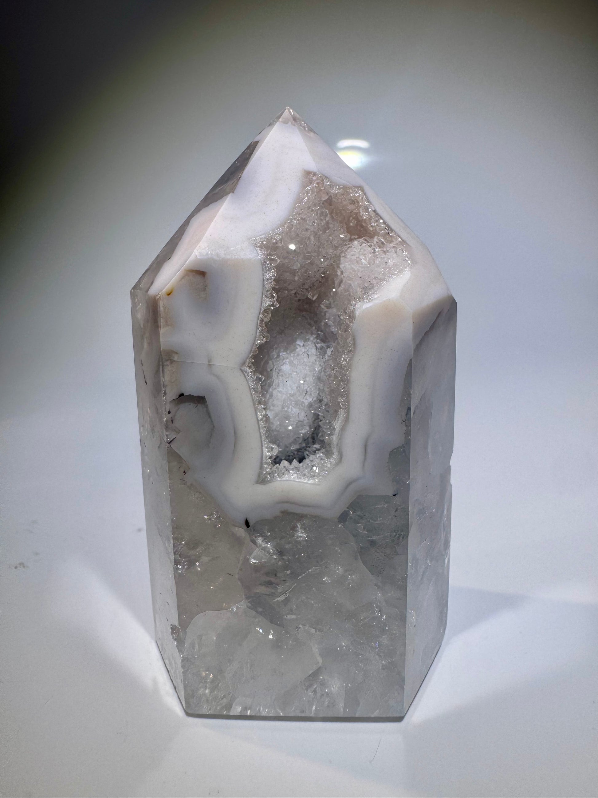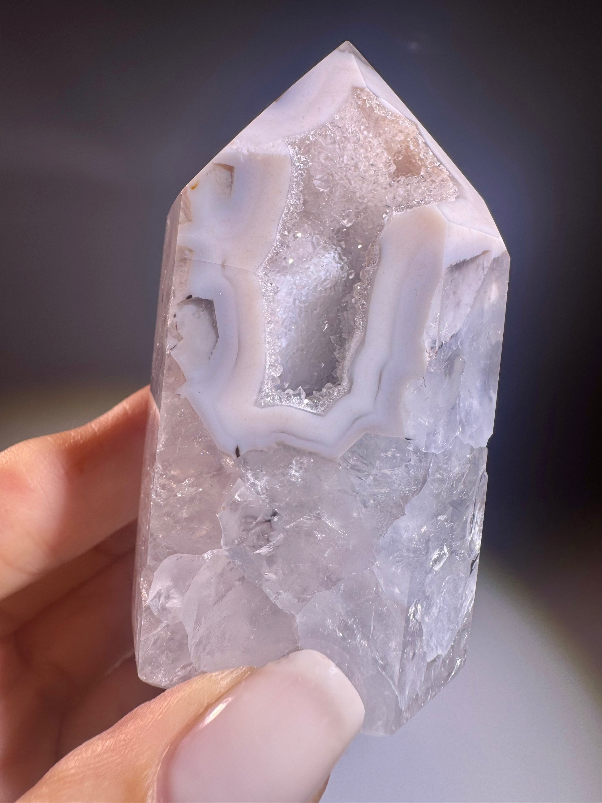 Diese absolut süsse Achat-Spitze 💎 aus Brasilien ist ein kleines Naturwunder. Ihre Farben reichen von zartem Weiss über hellgrau bis hin zu einem sanften Hellblau – ein harmonisches Zusammenspiel voller Eleganz und Ruhe. ✨