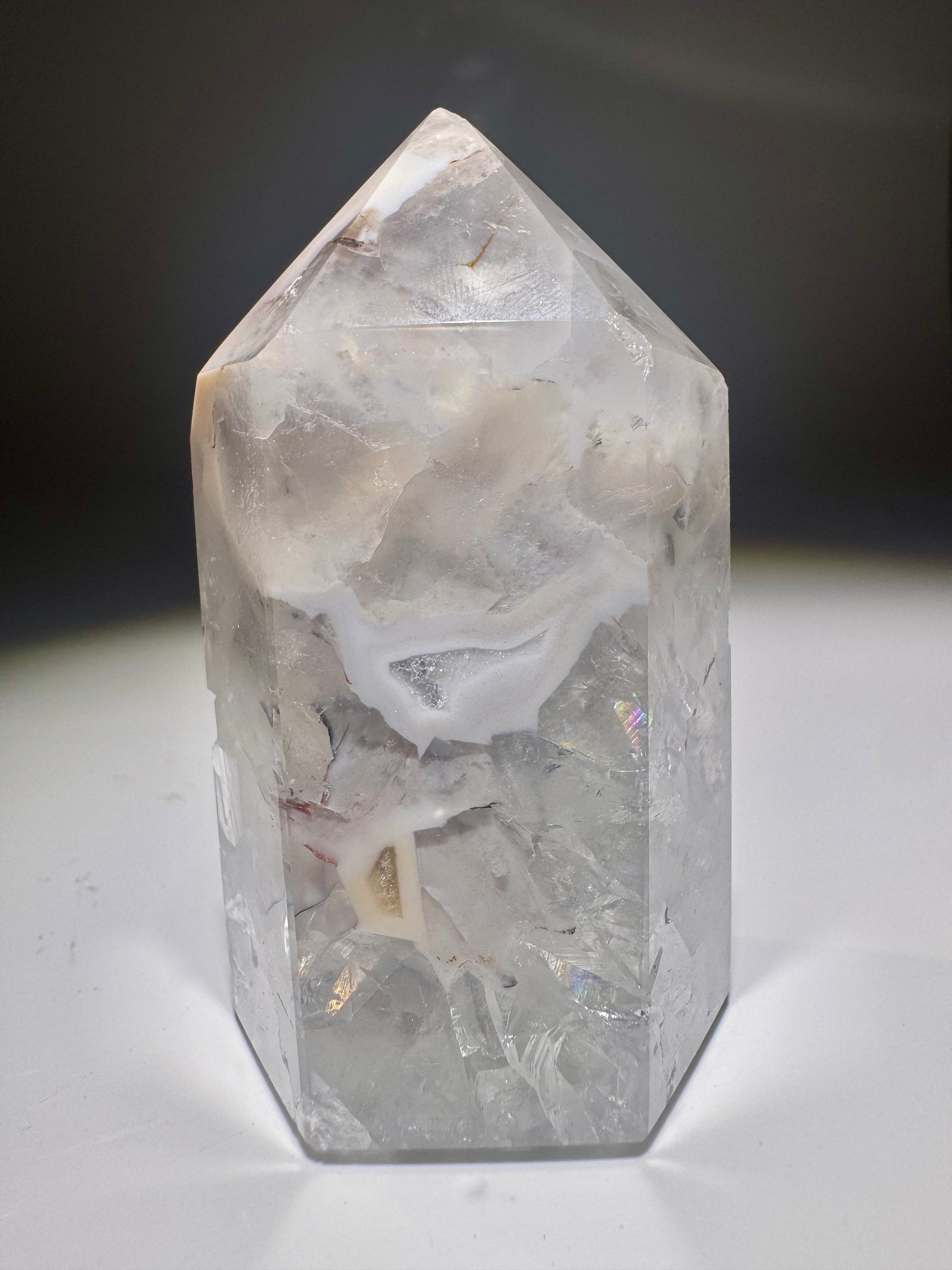 Im Innern funkeln feine Kristalle, während auf der Rückseite zierliche Regenbögen und durchscheinende Einschlüsse ein zauberhaftes Lichtspiel erzeugen 🌈 Betrachtet man den Kristall ganz genau, eröffnet sich ein wunderbares, lebendiges Innenleben, das an ein stilles Universum aus Licht und Zeit erinnert 🌌