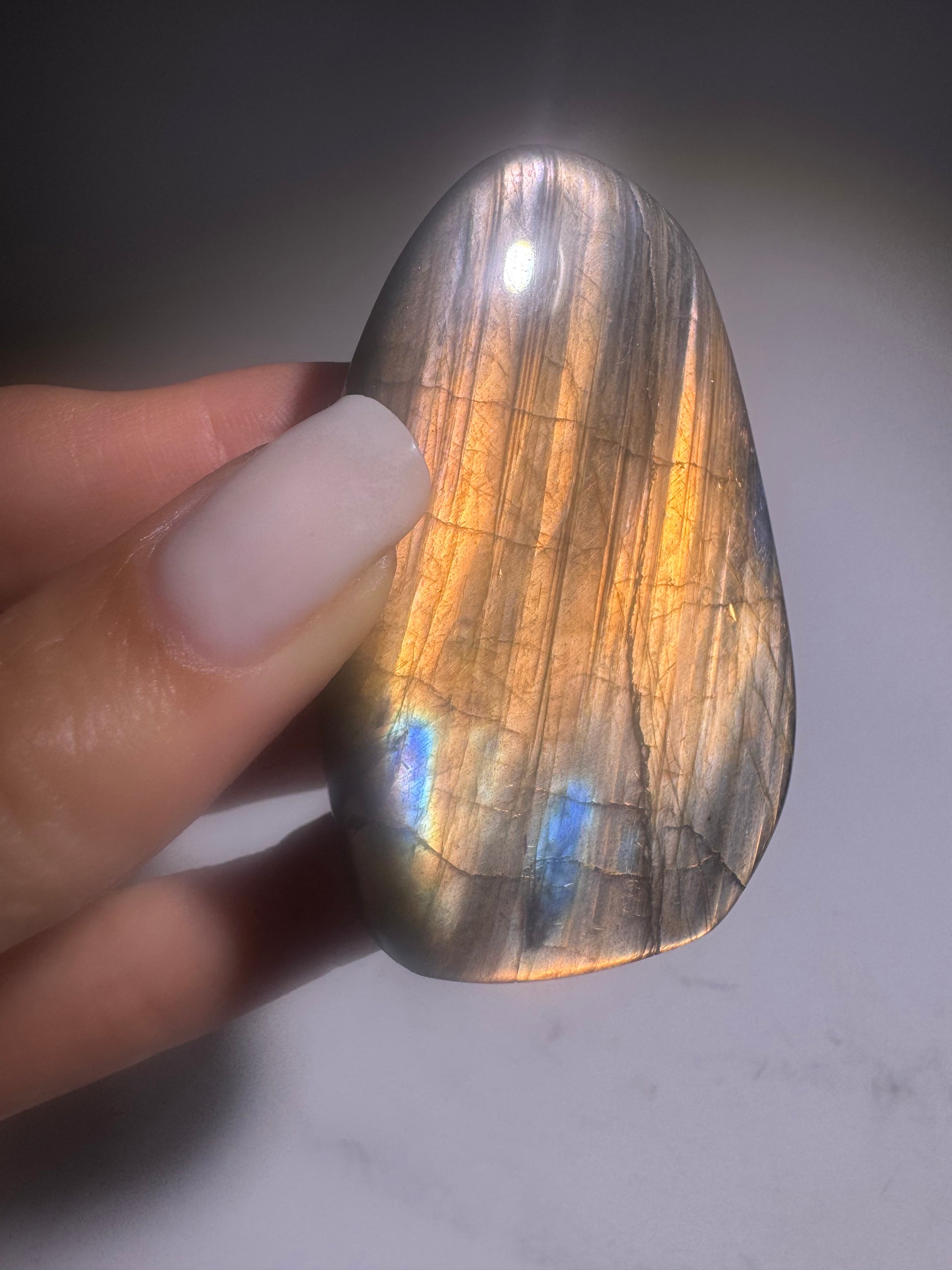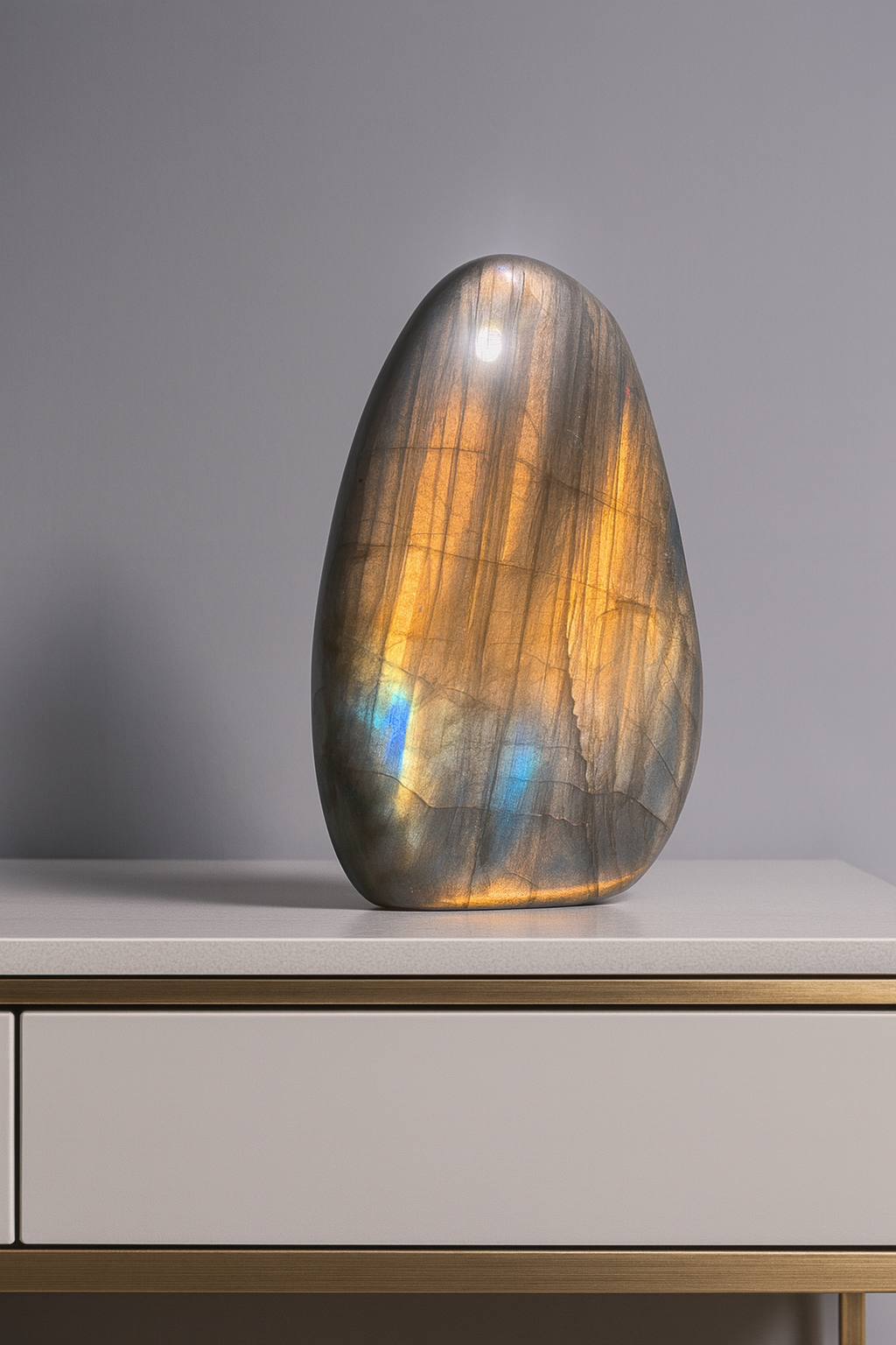 Labradorit gehört zur Familie der Feldspate und entsteht in magmatischen Gesteinen wie Basalt oder Gabbro🌋 Seine außergewöhnliche Farbe, das sogenannte Labradoreszieren, entsteht durch die Lichtbrechung an feinen Schichten im Kristall. Dies macht ihn zu einem der faszinierendsten Minerale. 🌈 Die bedeutendsten Fundorte sind in Kanada, Madagaskar und Finnland, wo er wegen seines leuchtenden Schimmers hochgeschätzt wird. Dieser Labradorit ist aus Madagaskar.