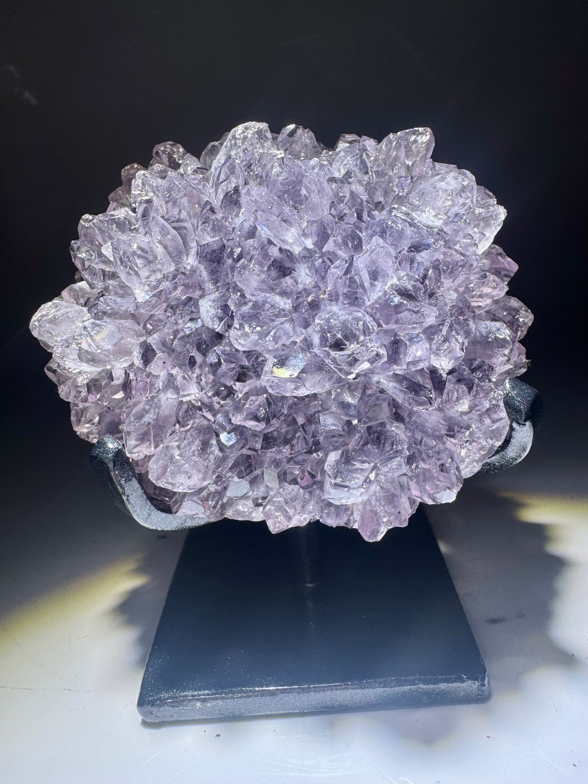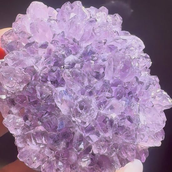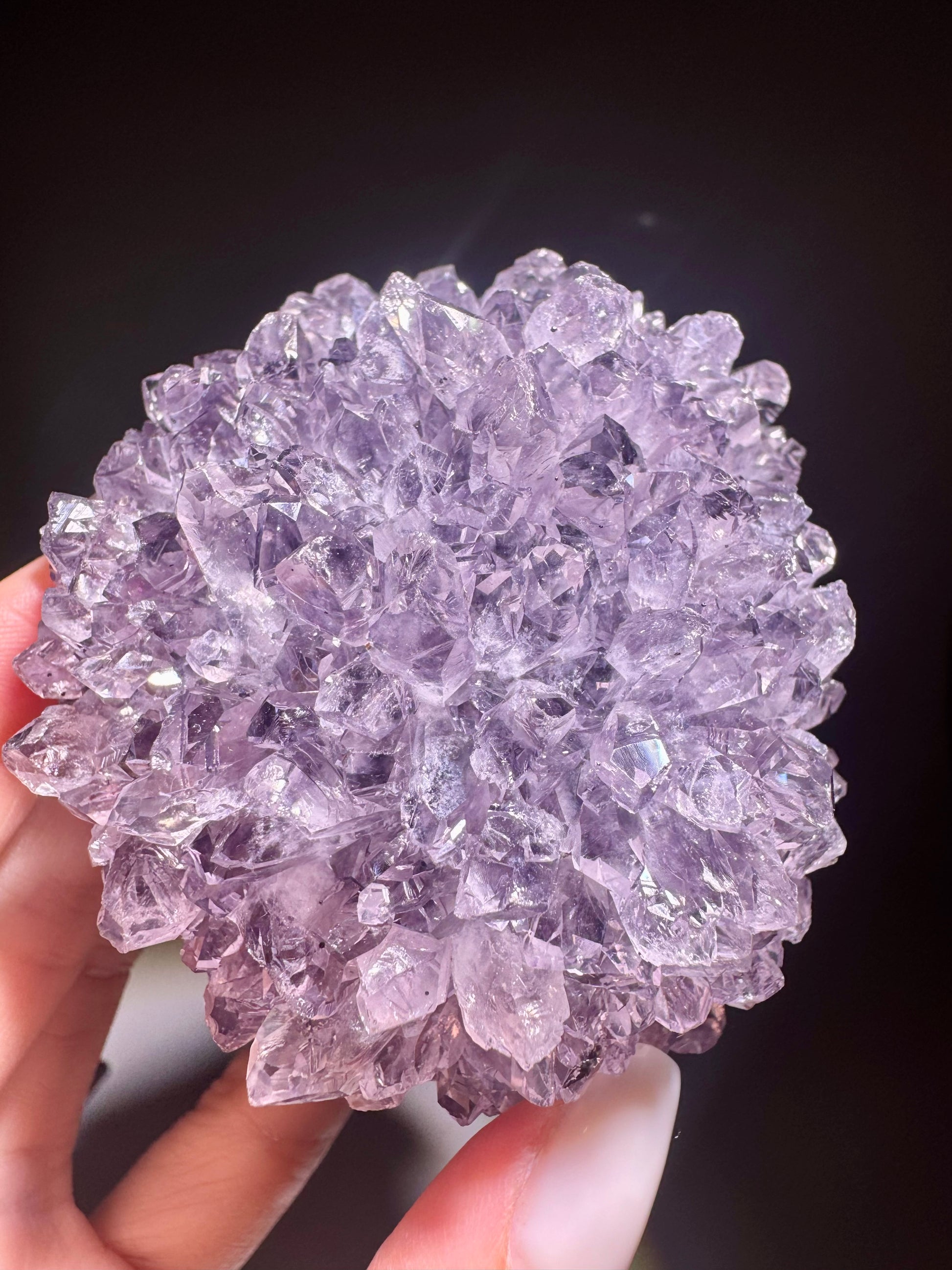 Ein absolut traumhaftes Unikat: Diese natürliche Amethystblüte aus Uruguay besitzt einen Durchmesser von 7,4 cm und beeindruckt durch ihre vollkommen symmetrische Form – ein seltenes Geschenk der Natur. Die Blume besteht aus unzähligen transparenten, zart-lila Kristallspitzen, die in alle Richtungen strahlen und ein funkelndes, lebendiges Lichtspiel erzeugen. ✨